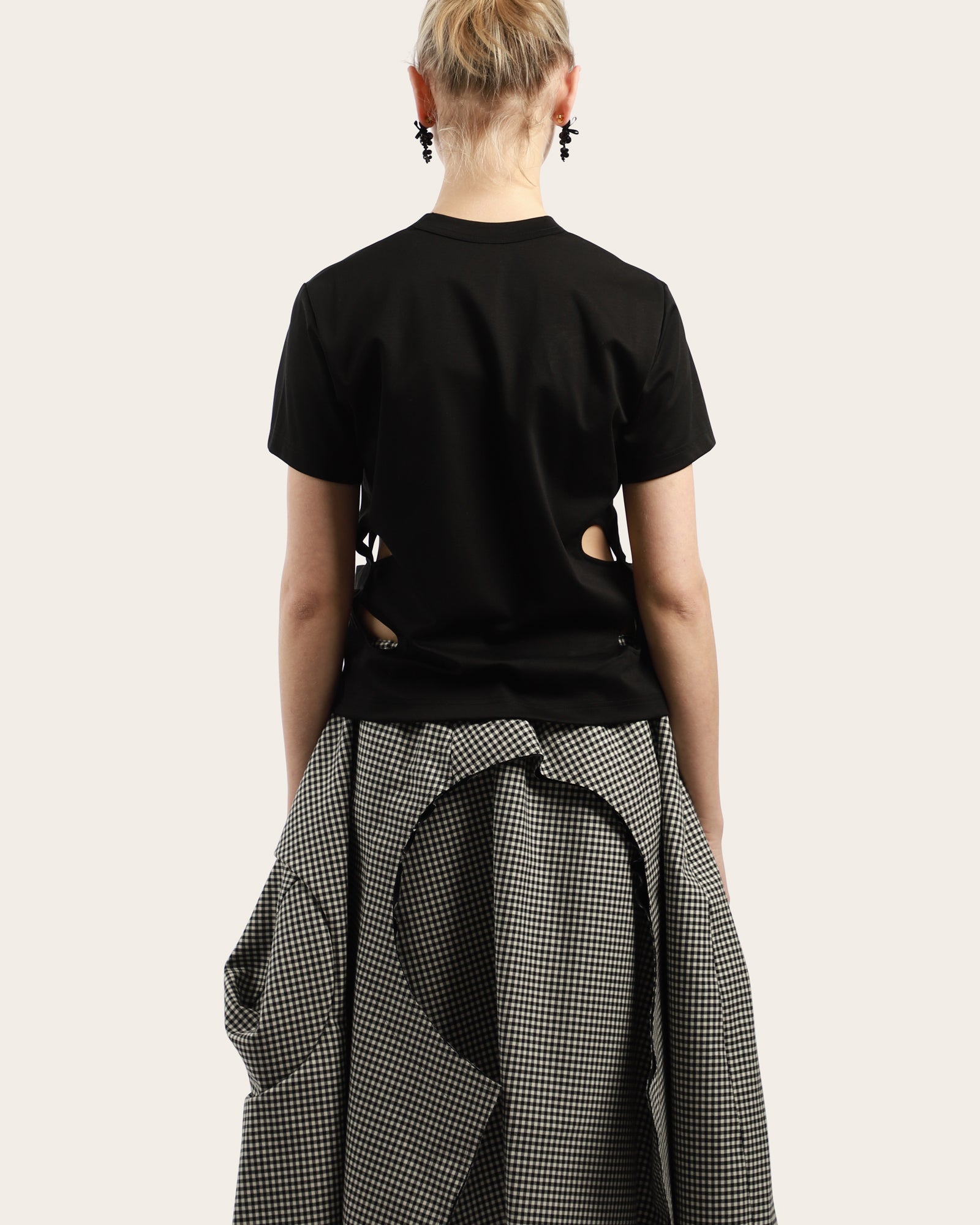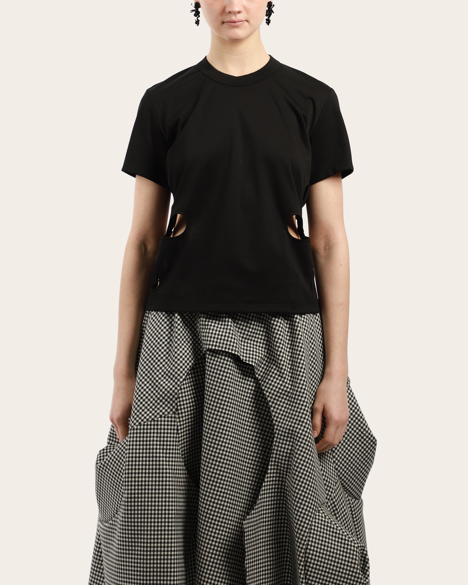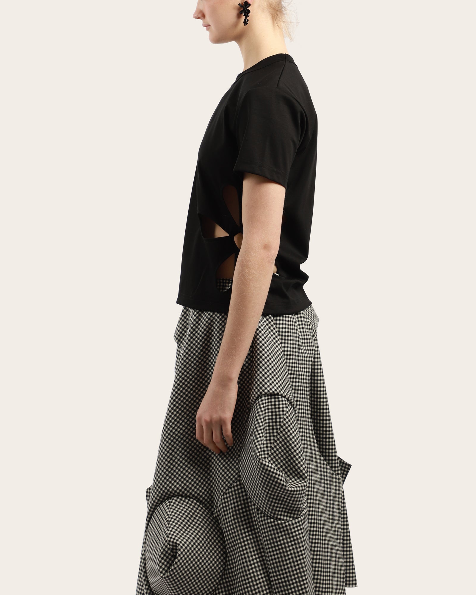 A classic t-shirt, featuring a round neckline, short sleeves with a flower cut detail at side seams. Made in Japan.