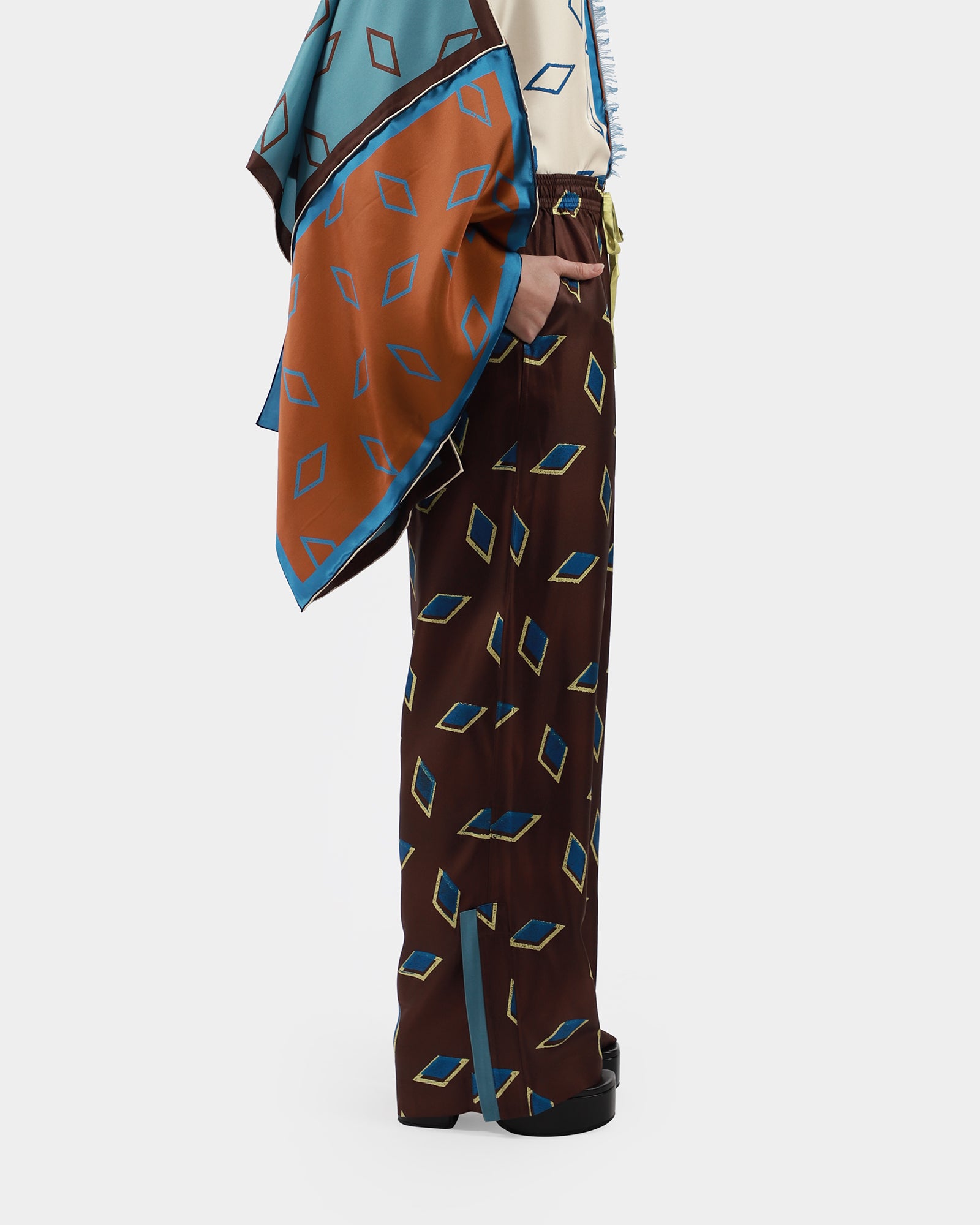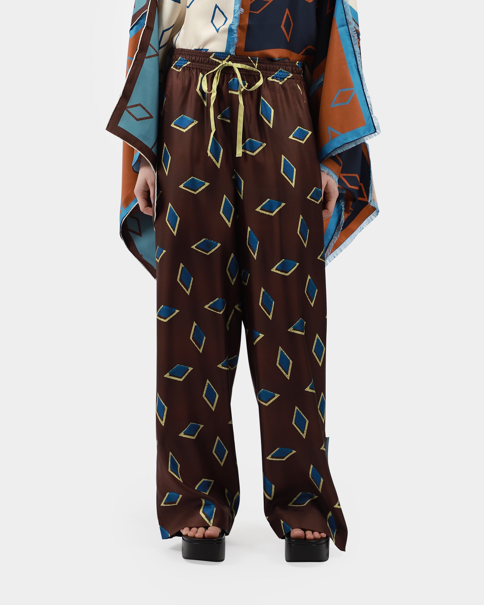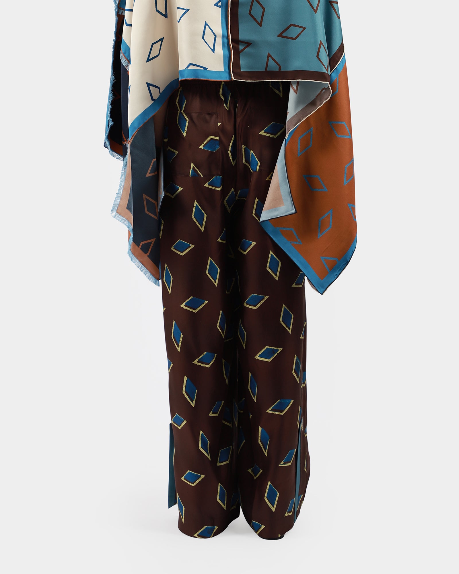 The Manuela pants, made from 100% silk, feature an elasticated waistband, side pockets, double patch contrast pockets at back, opening slit at bottom hem on both sides.