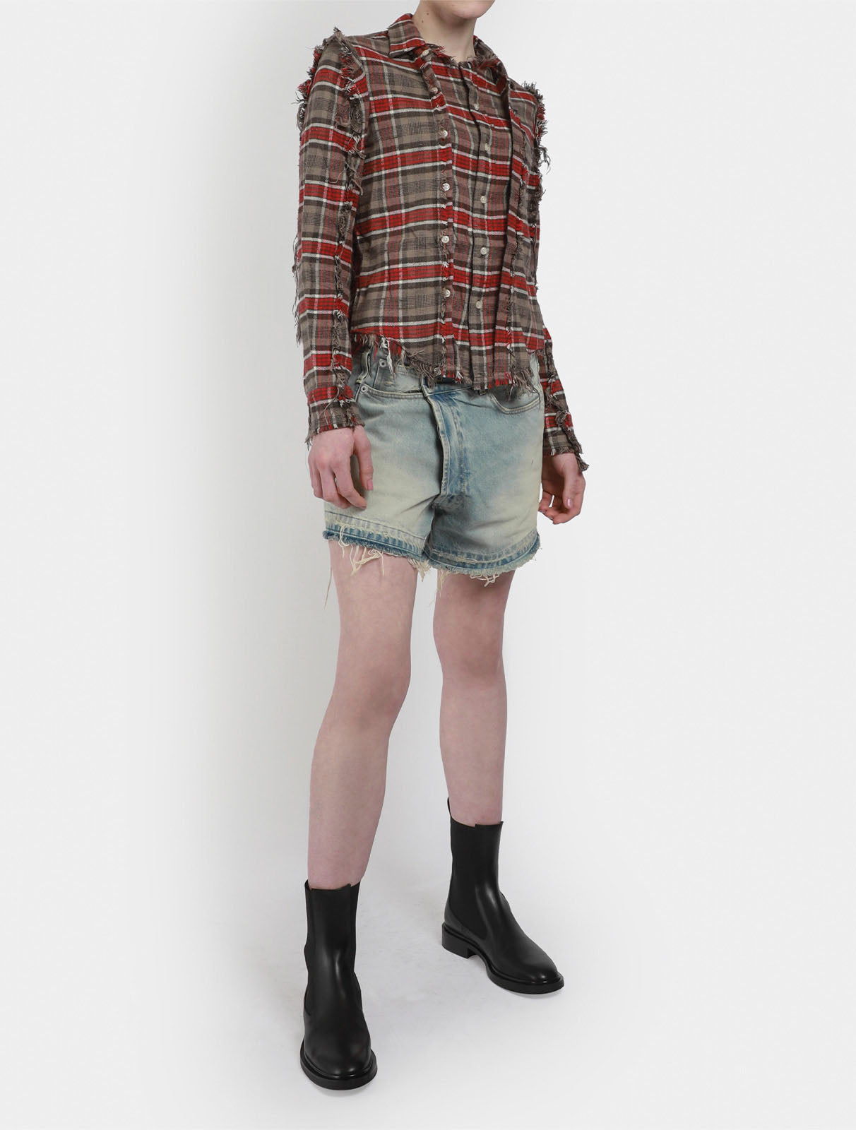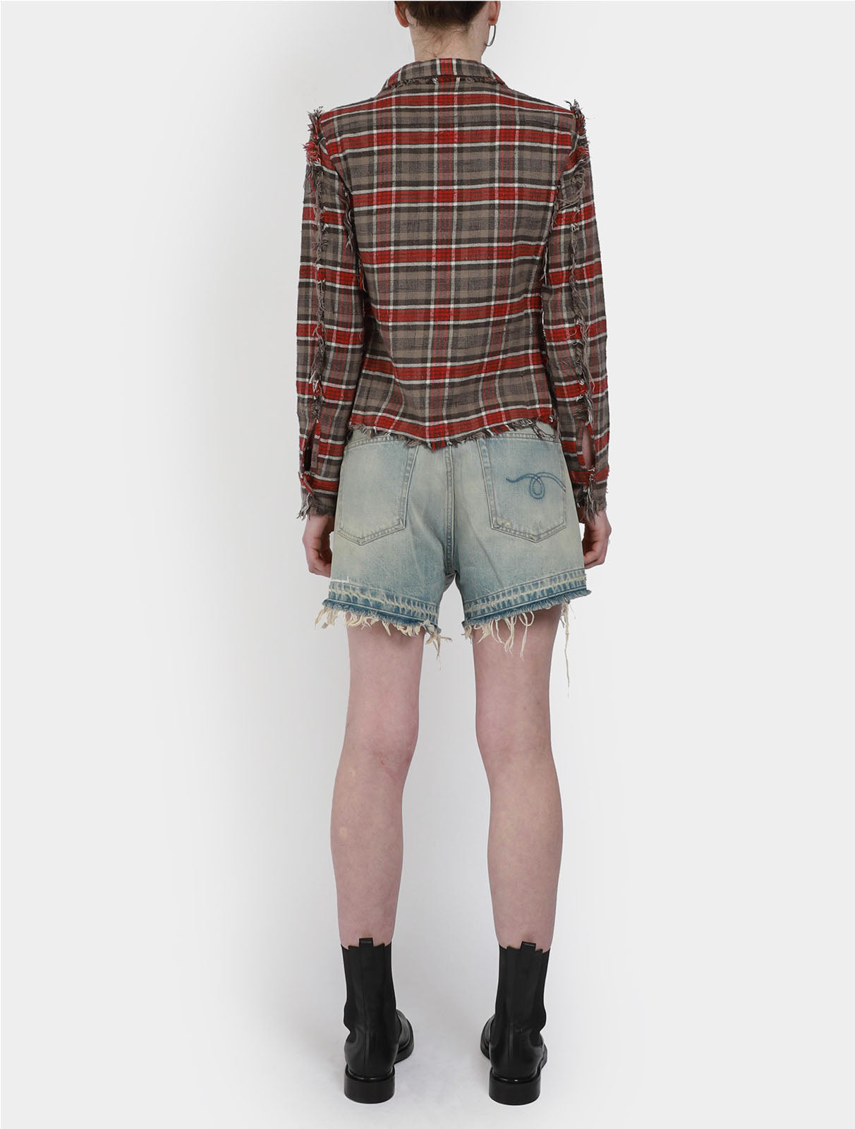 Flat sleeve shirt from R13 in Japanese cotton featuring grey and red plaid design, shredded cuffs, raw seams and a double placket closure.