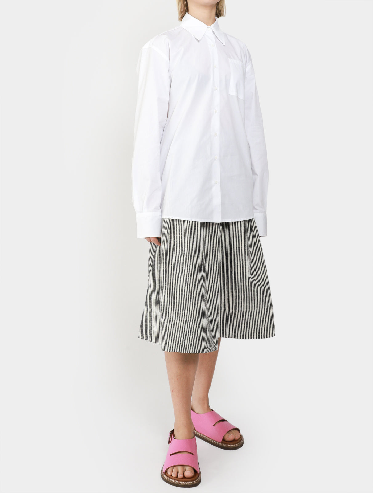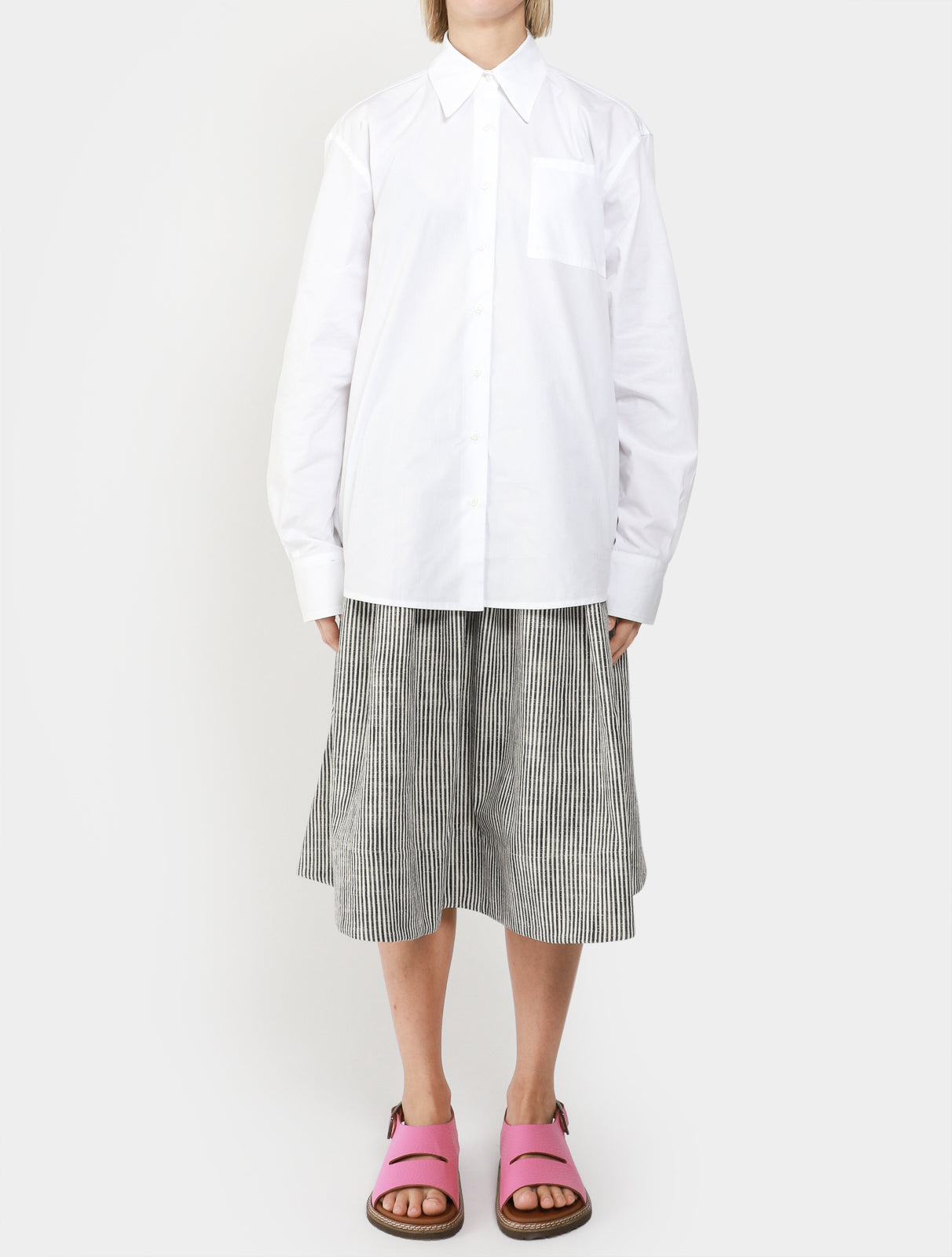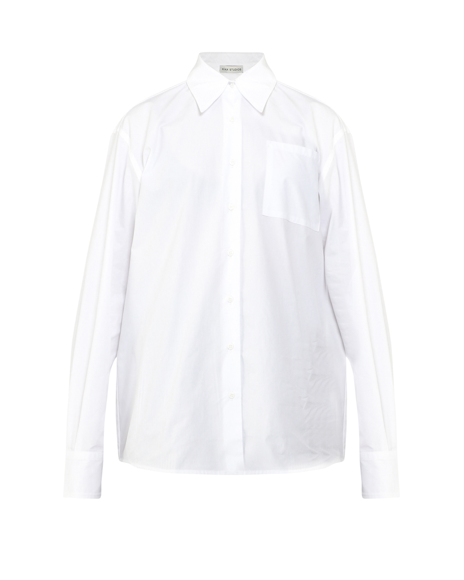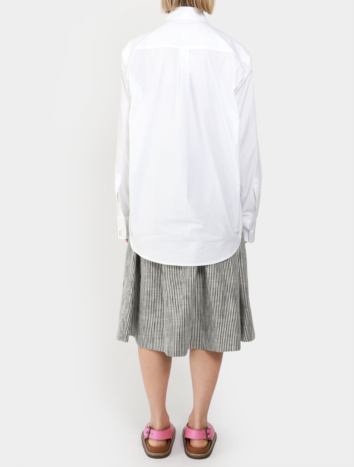 Rika Studios shirt in cotton poplin fabric, featuring an oversized silhouette, drop shoulder seams, classic collar, sleeve cuffs and a contrasting hand-stitched red ‘R’ decorating the left cuff.