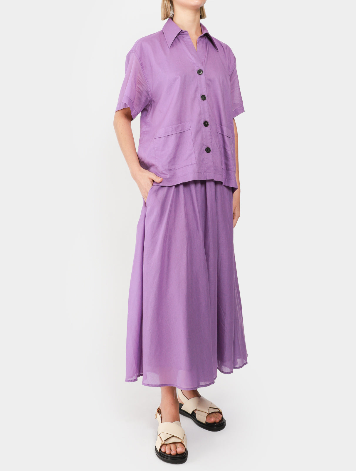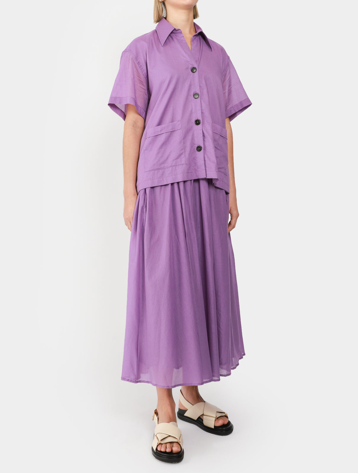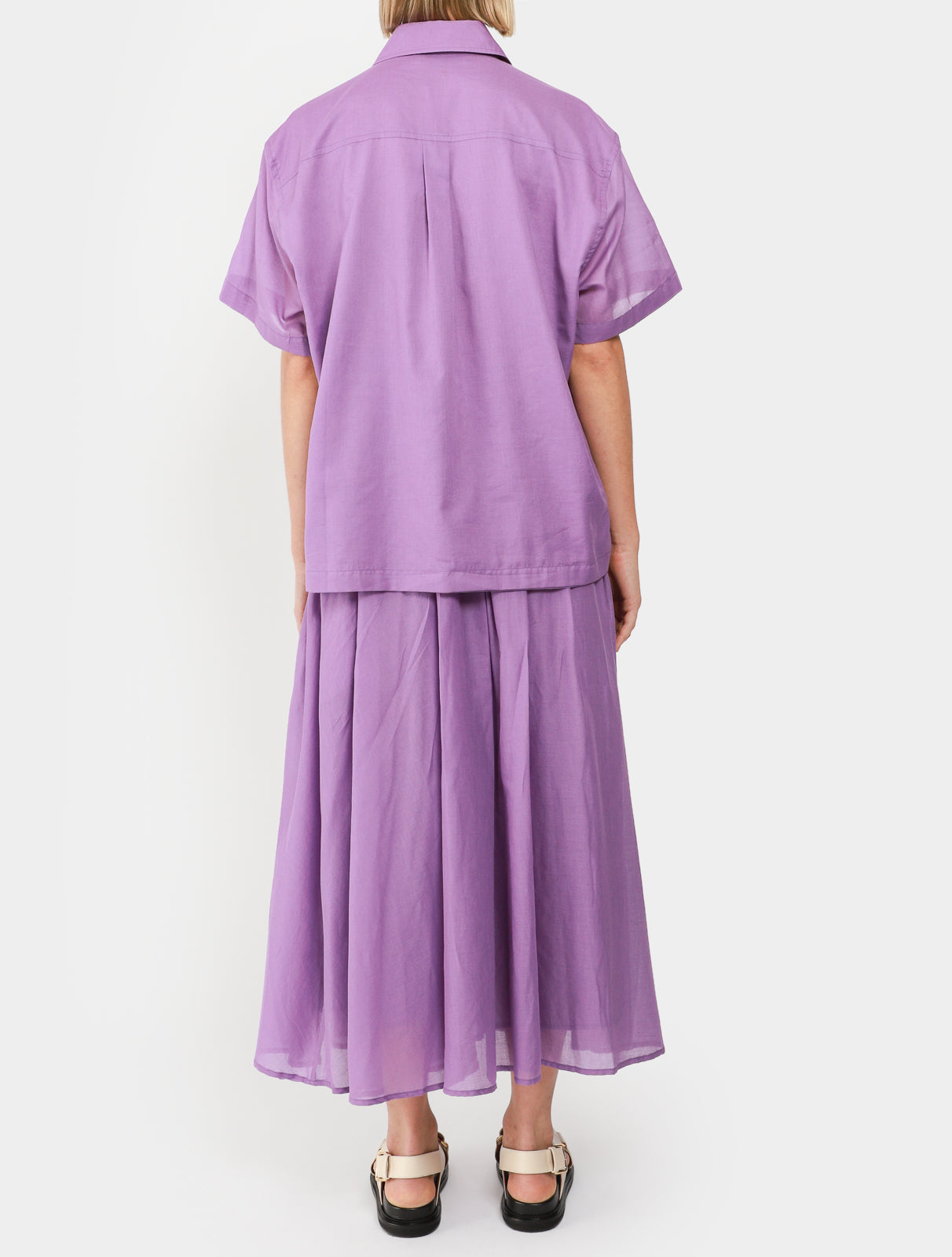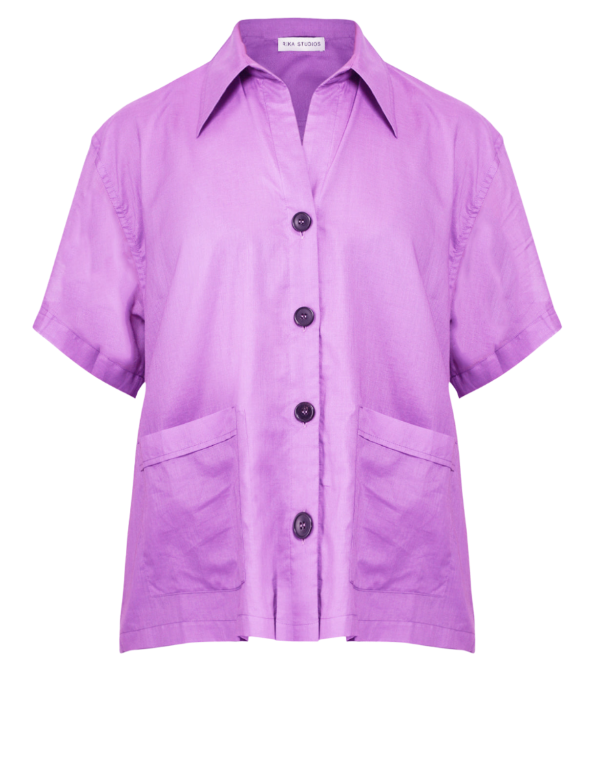 Rika Studios short-sleeve shirt in feather-weight voile fabric, featuring a relaxed fit, classic collar, open neckline, patch front pockets, boxy silhouette, shirt buttons at front to close.