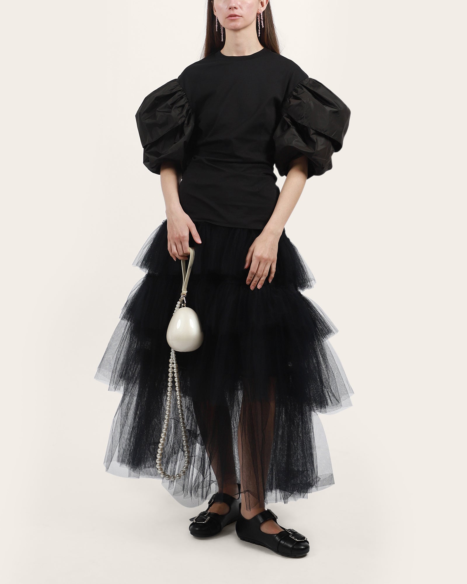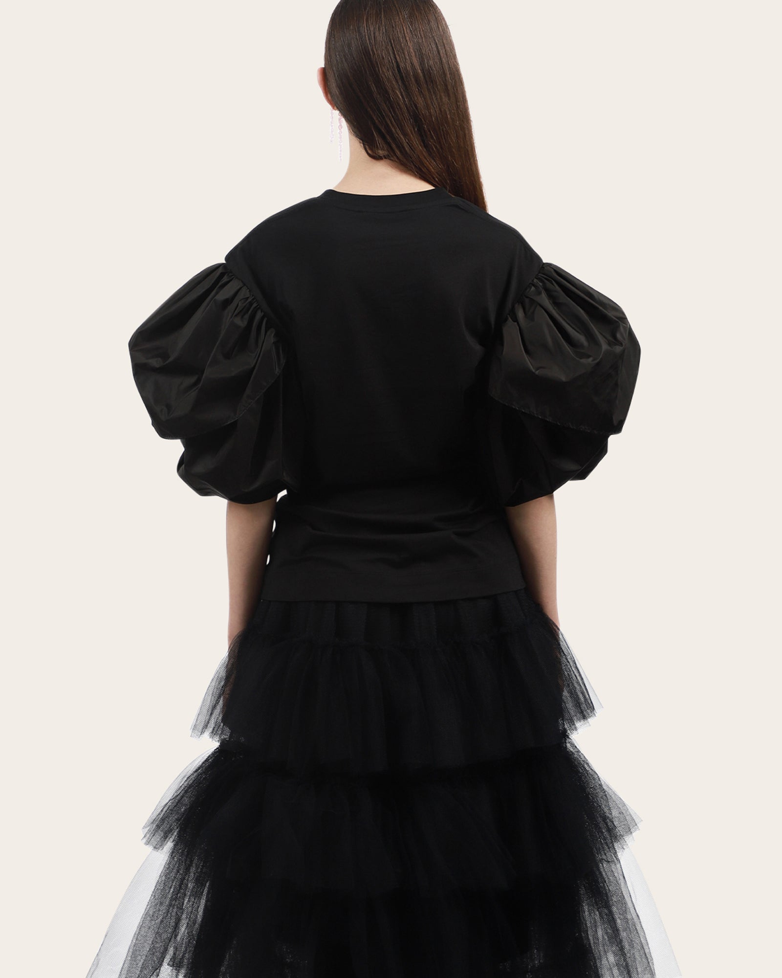Bold and dramatic, this black top redefines a classic silhouette with its voluminous puff sleeves. Crafted from structured fabric for maximum shape, it balances statement sleeves with a fitted bodice and a clean crew neckline. Perfect for adding instant impact to any look.