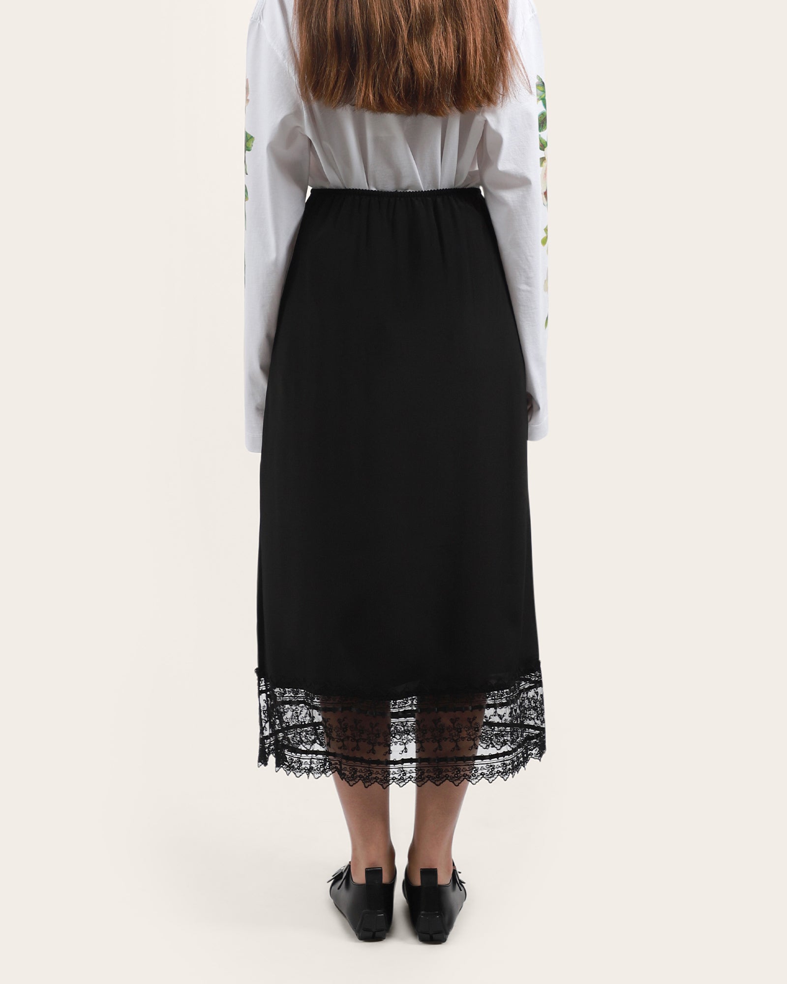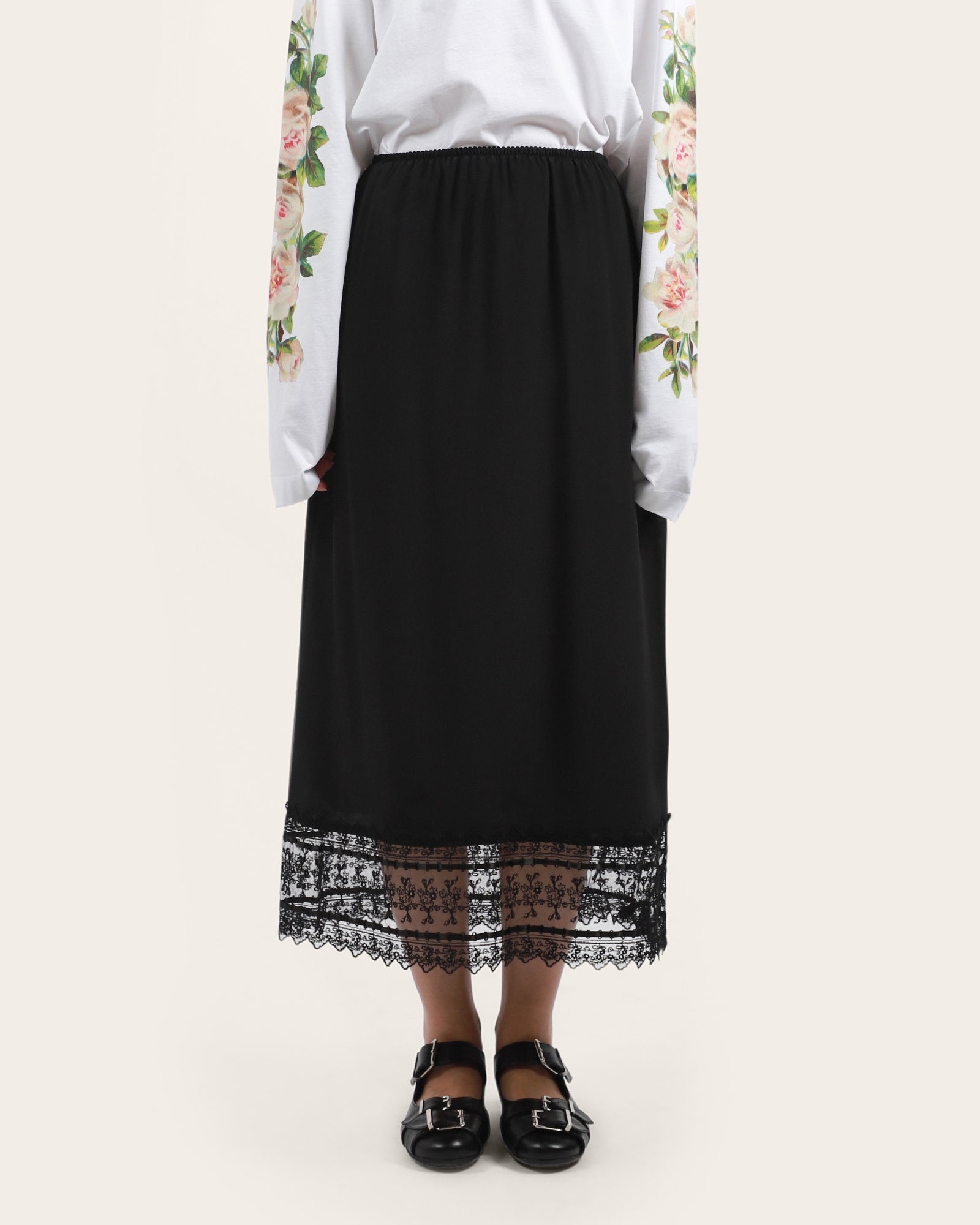 A timeless essential with a delicate twist. This black slip skirt features a classic straight silhouette with a soft elastic waistband for all day comfort. The hemline is beautifully finished with sheer floral lace trim, adding a touch of romance and subtle allure. Perfect for layering or wearing solo, it’s a versatile piece that transitions effortlessly from day to night.