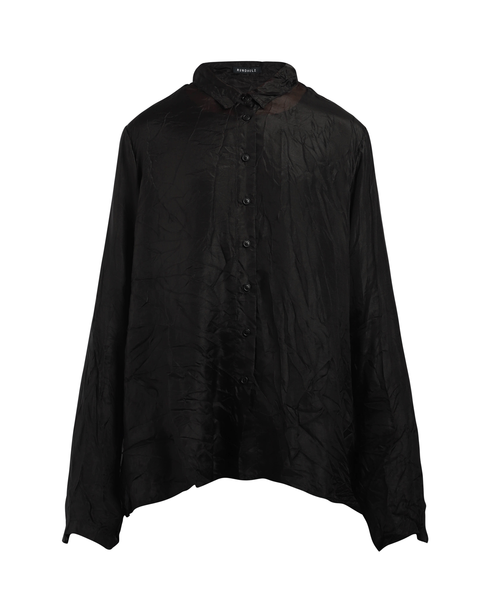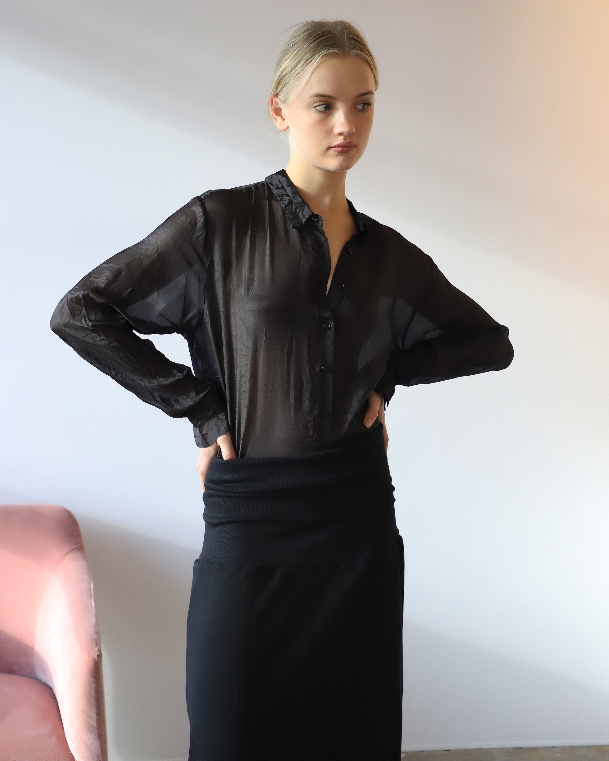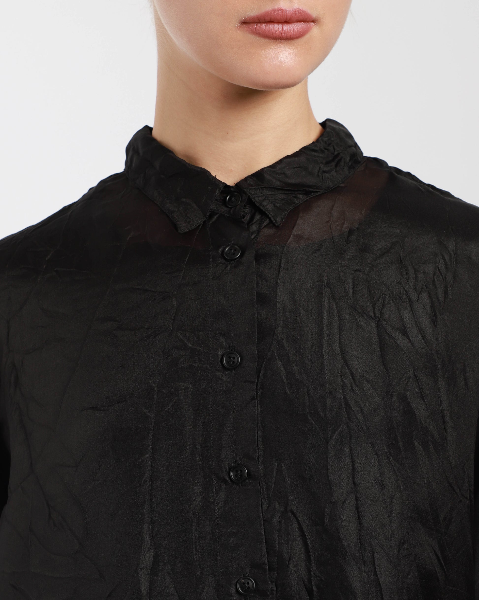 A delicate blouse, made from 100% silk, featuring a sheer look, a classic collar, long sleeves with buttons at cuff, and buttons at front to close.
