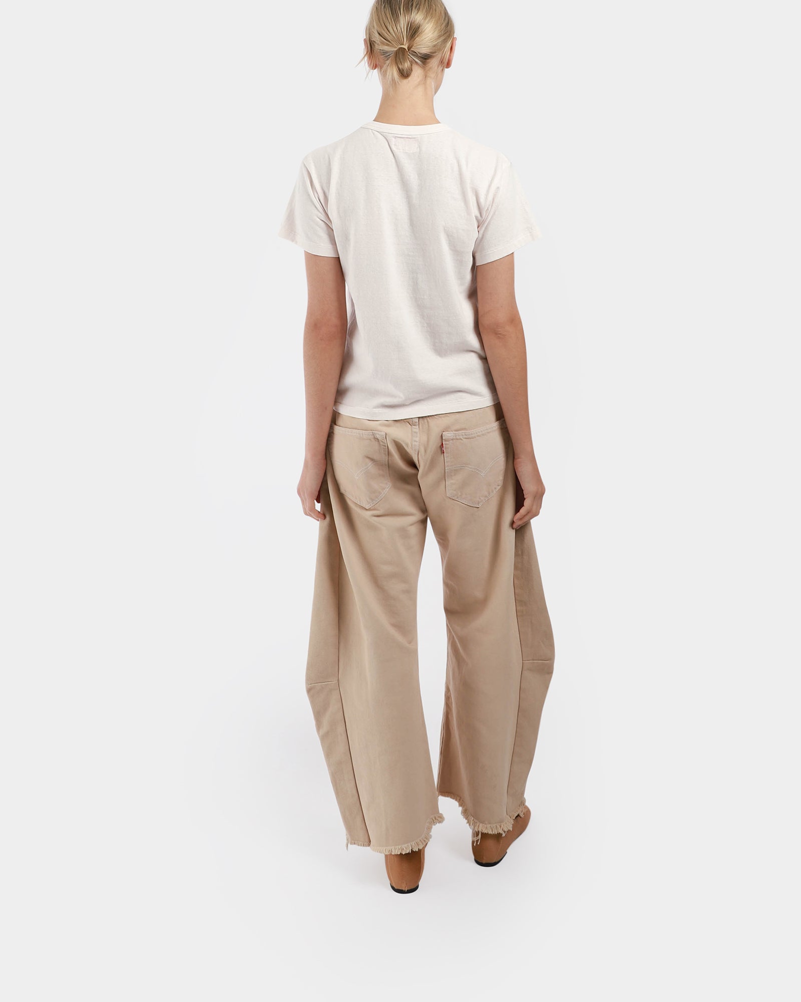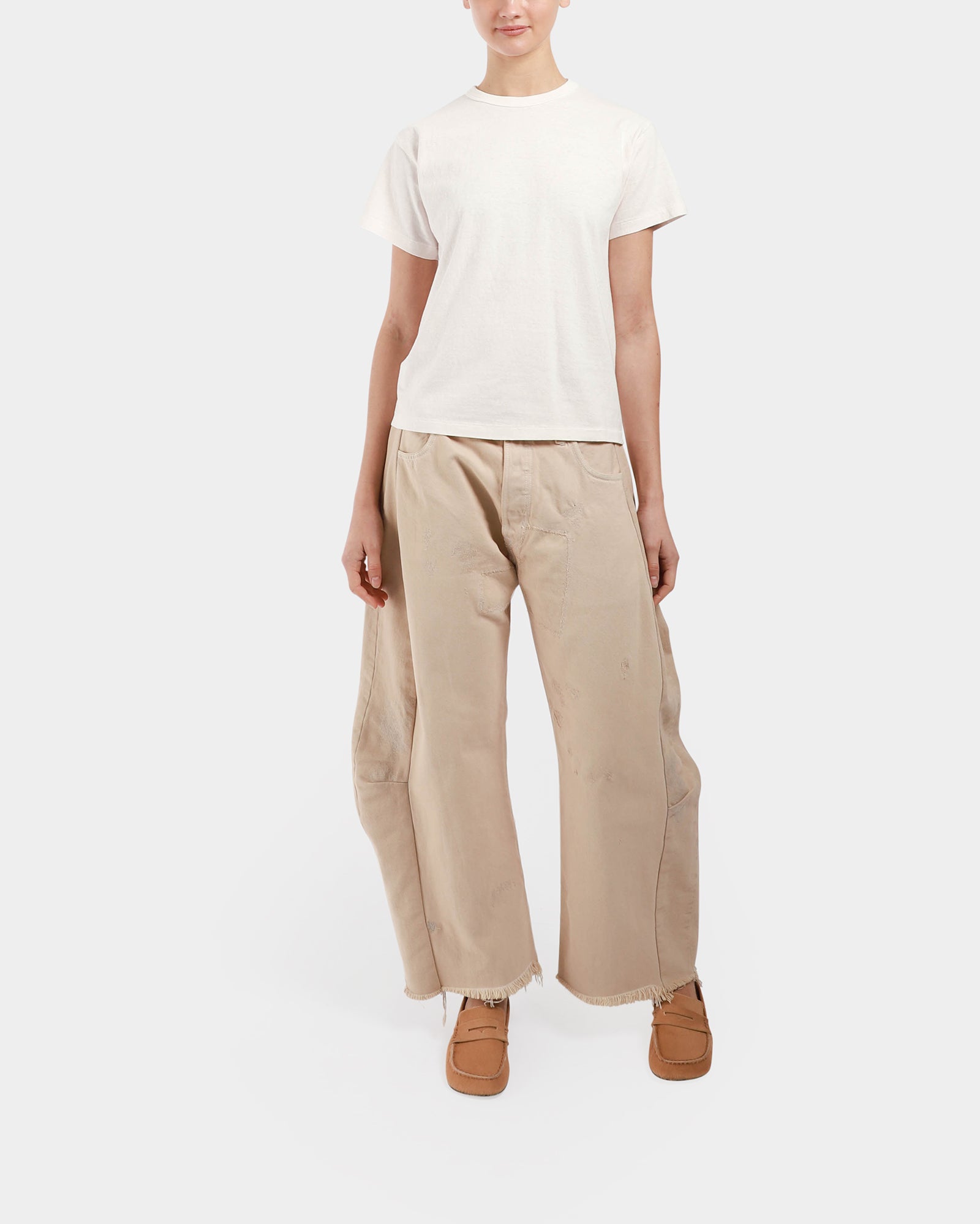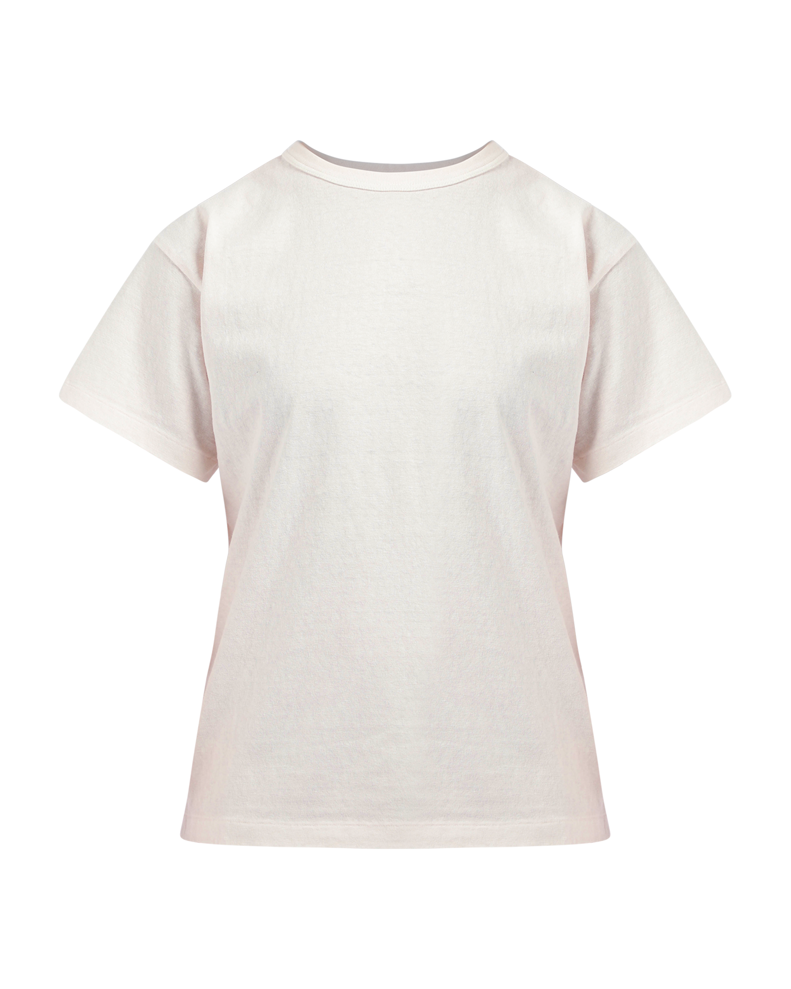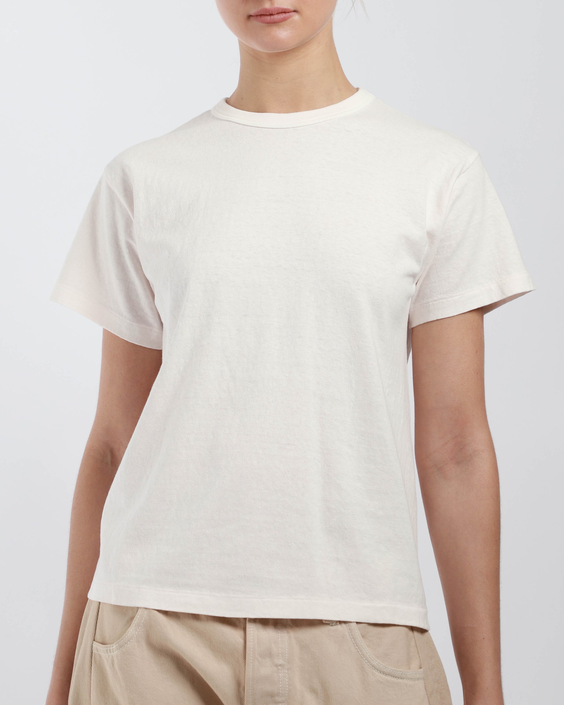A short sleeve t-shirt, made from 100% recycled Ochiwata jersey cotton, features a round neckline, ribbed finishing and is pigment dyed. This piece is made on an antique circular knitting machine, meaning it is a slow knitting process that allows the garment to have no side seams and produces no tension on the yarn, so it will almost never warp. Made in Japan. - Round neckline