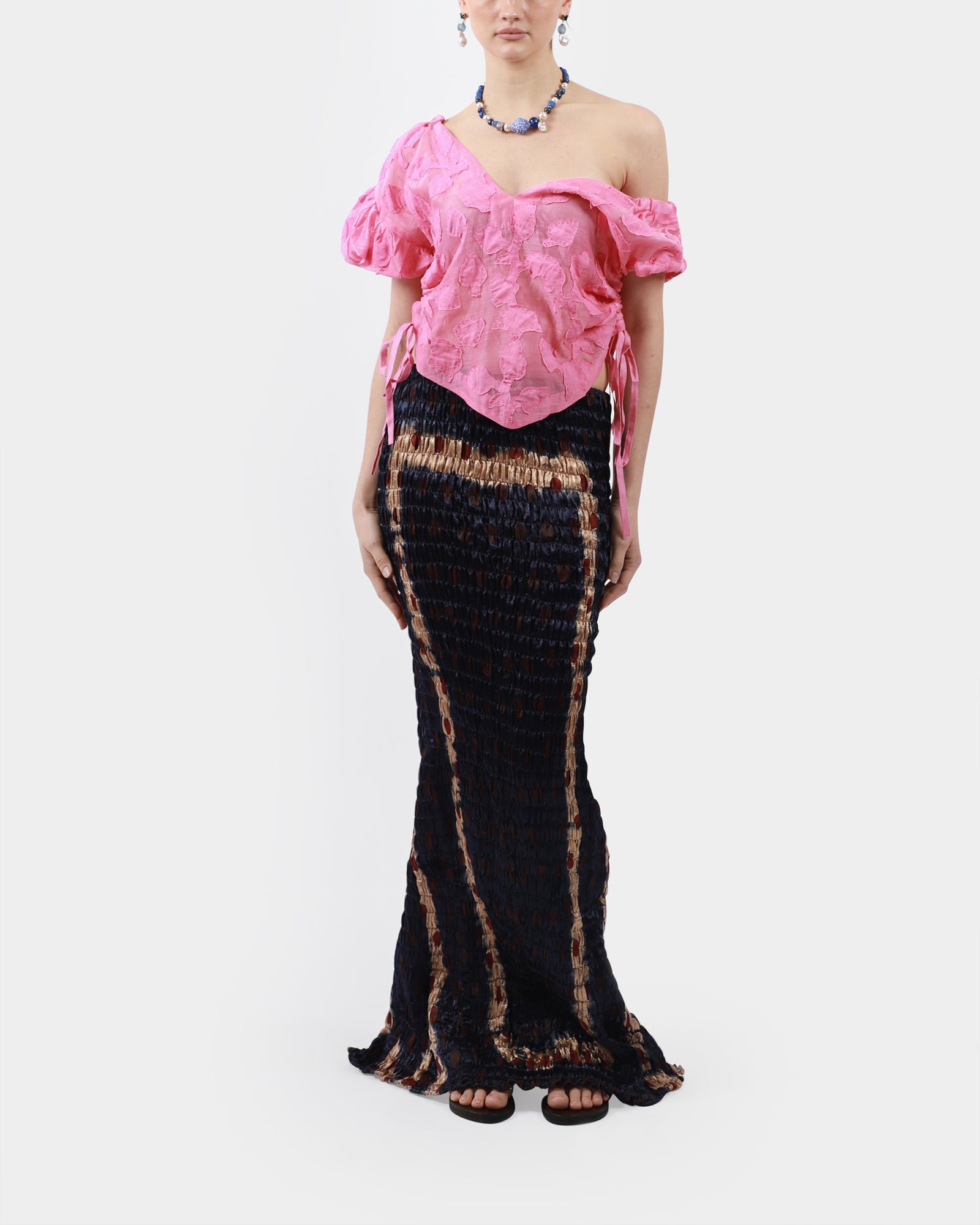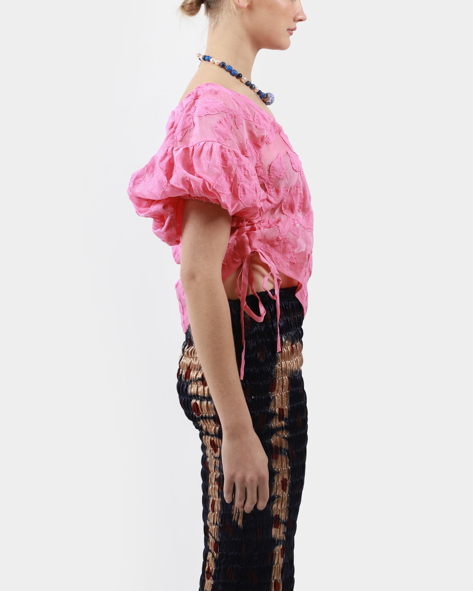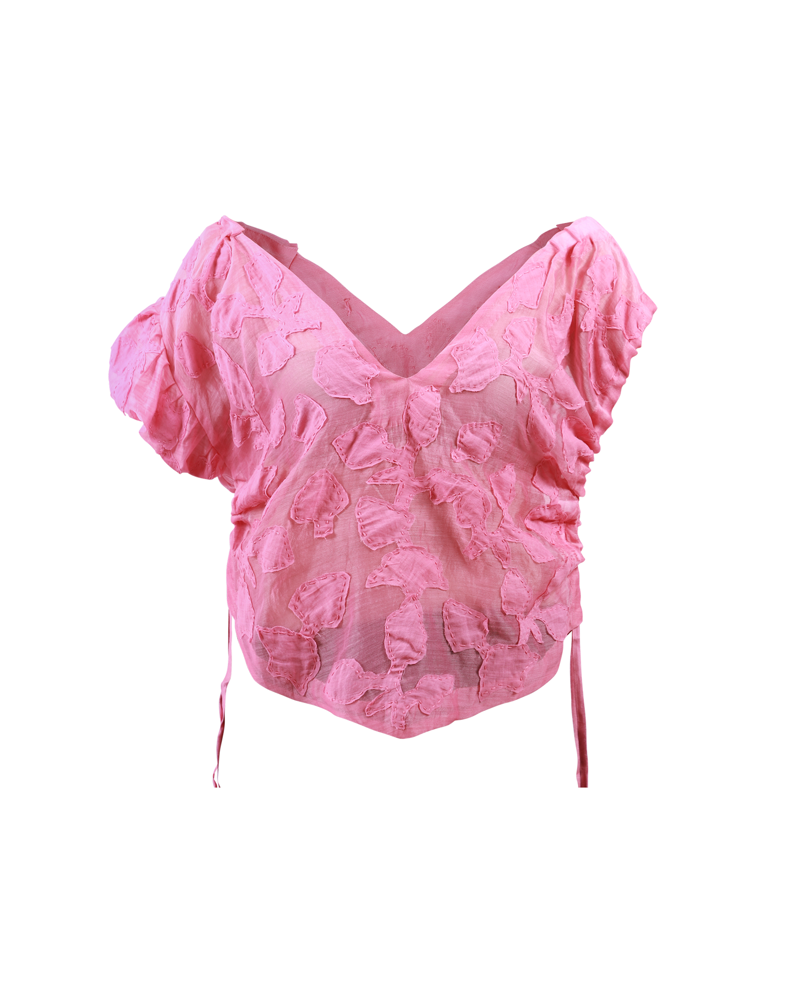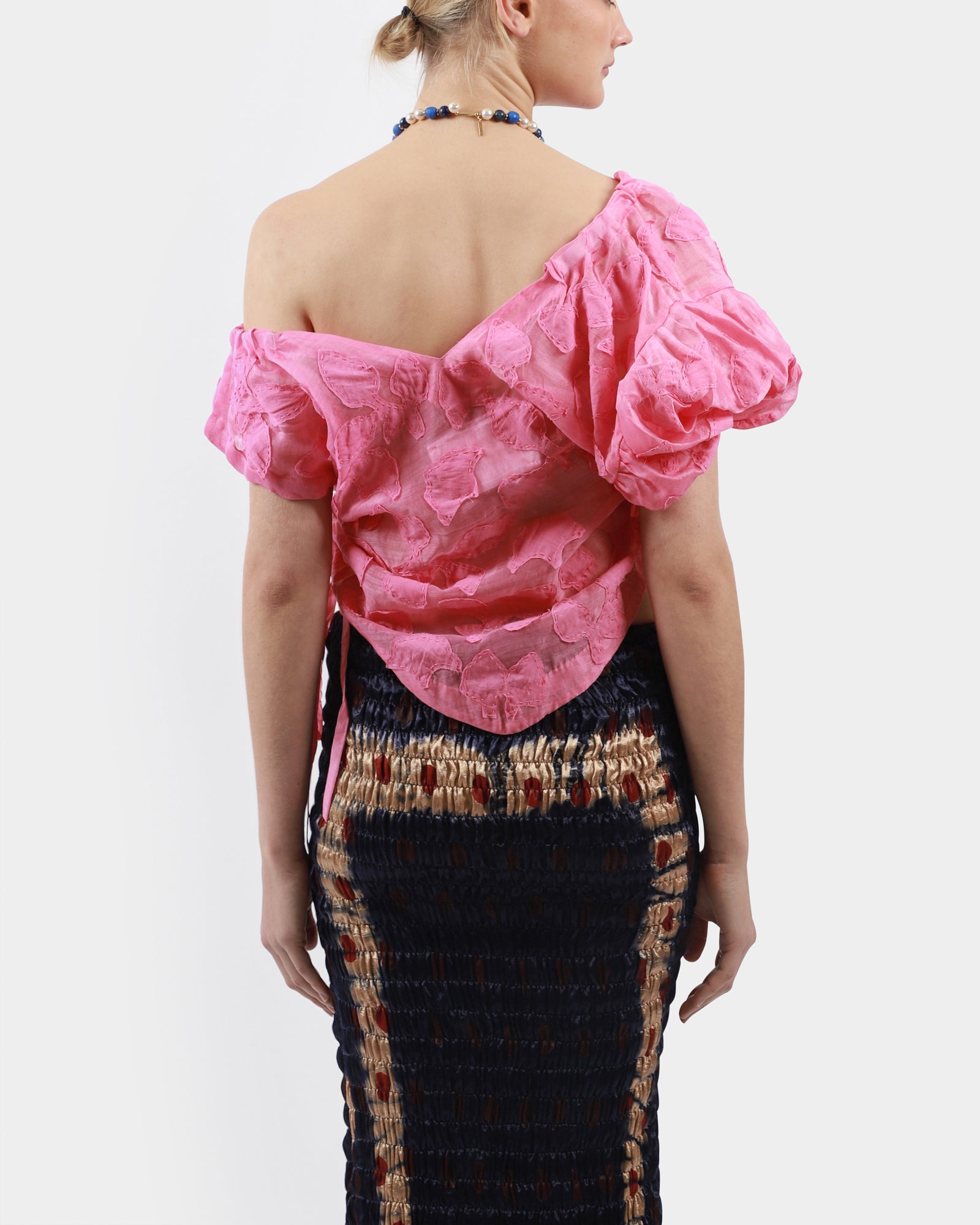 A cropped top, delicately hand-woven in silk and cotton applique work, offering a v-hemline, short asymmetric sleeves with adjustable drawstring sides and a subtle v-neckline. Handmade in India.