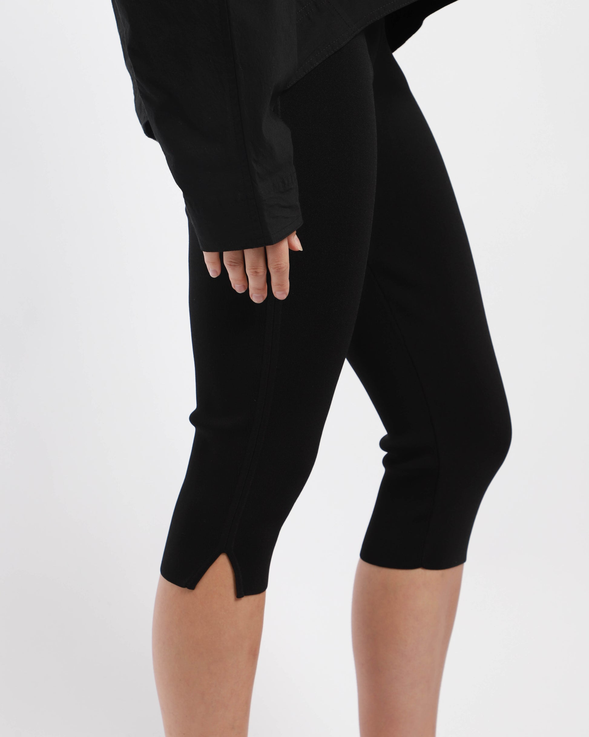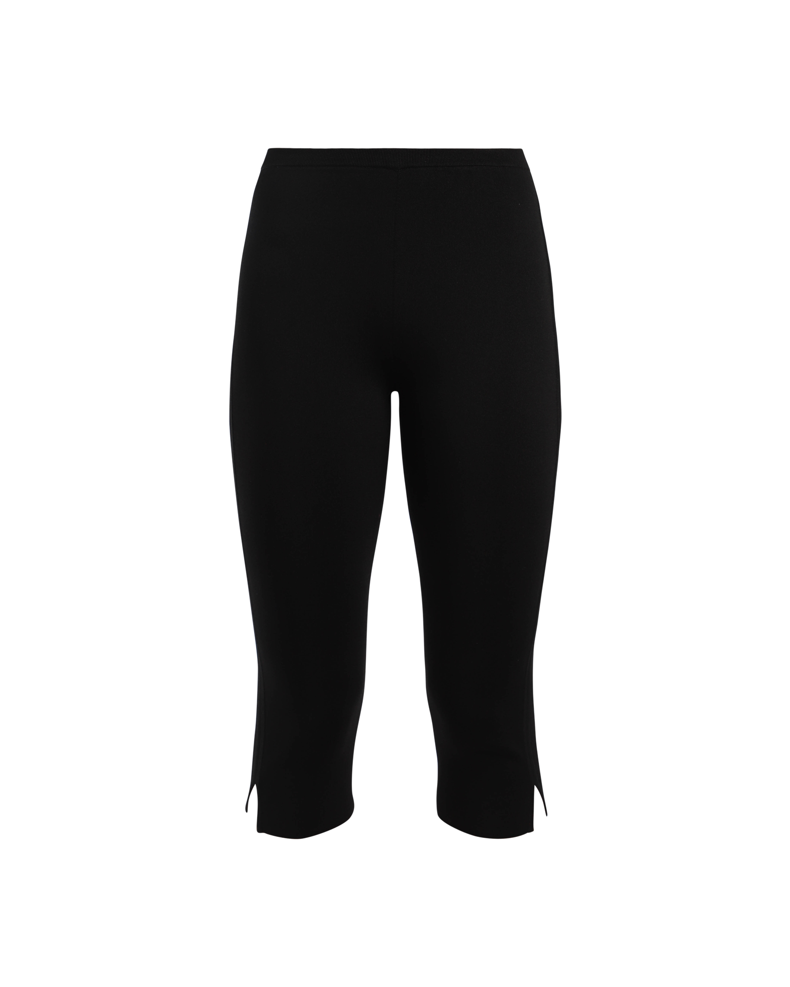 A knitted trouser falling just below the knee, featuring an elasticated waistband, slim legs with intricate tubular side stitching and small hem slits.