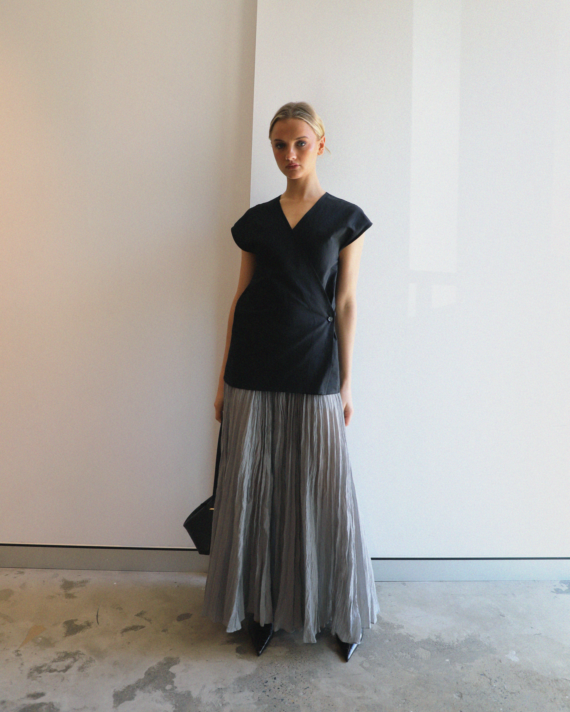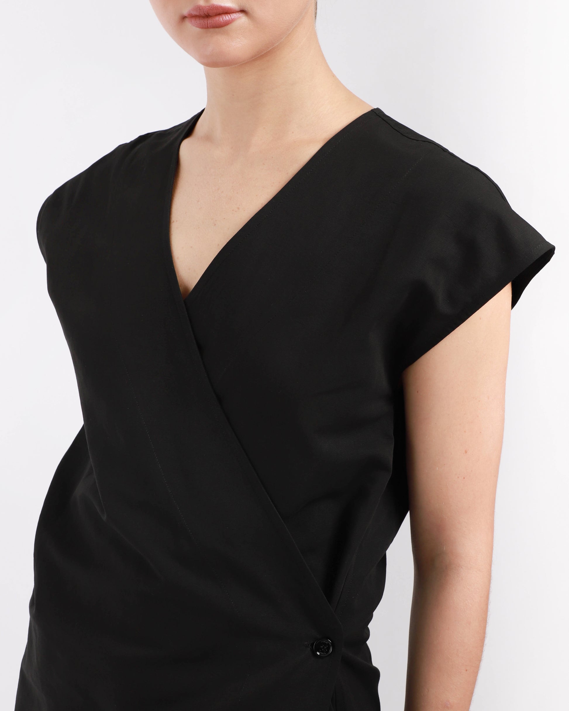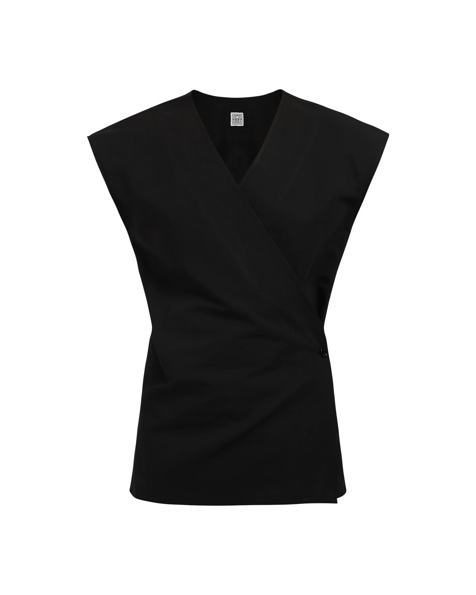 A lightweight wrap blouse from Toteme, made from a breathable cotton-linen blend. It features a V-neckline, short sleeves, and a side button closure for a clean, minimal look.