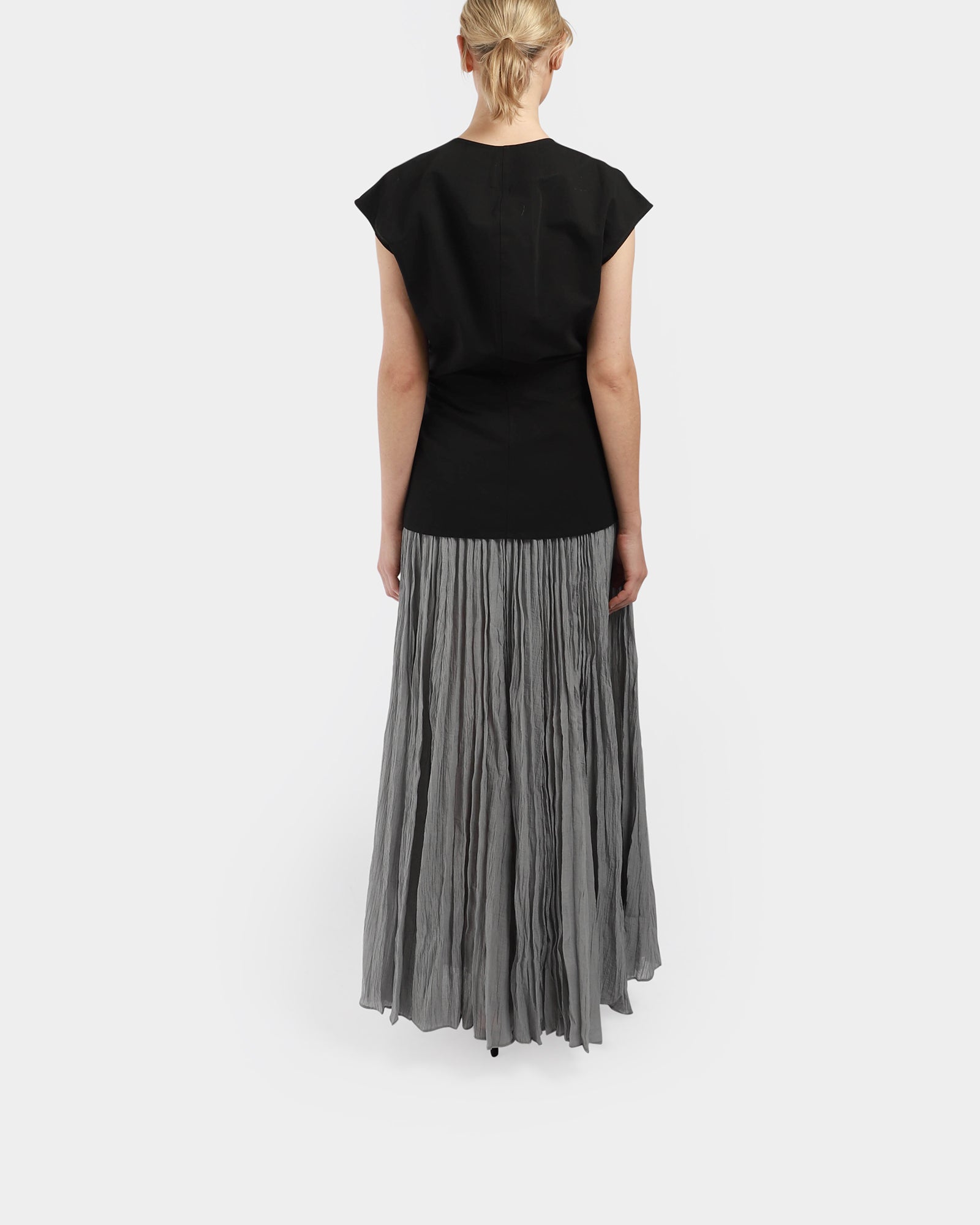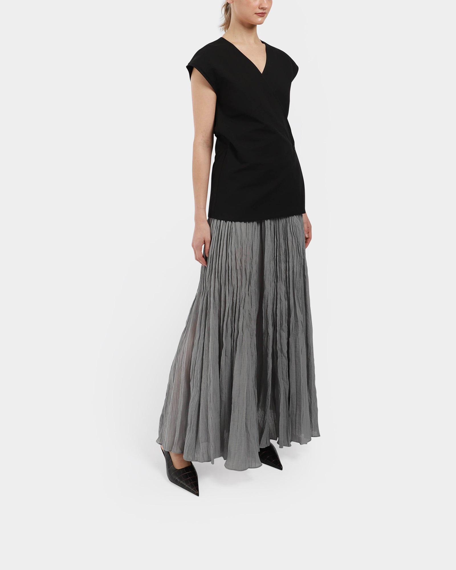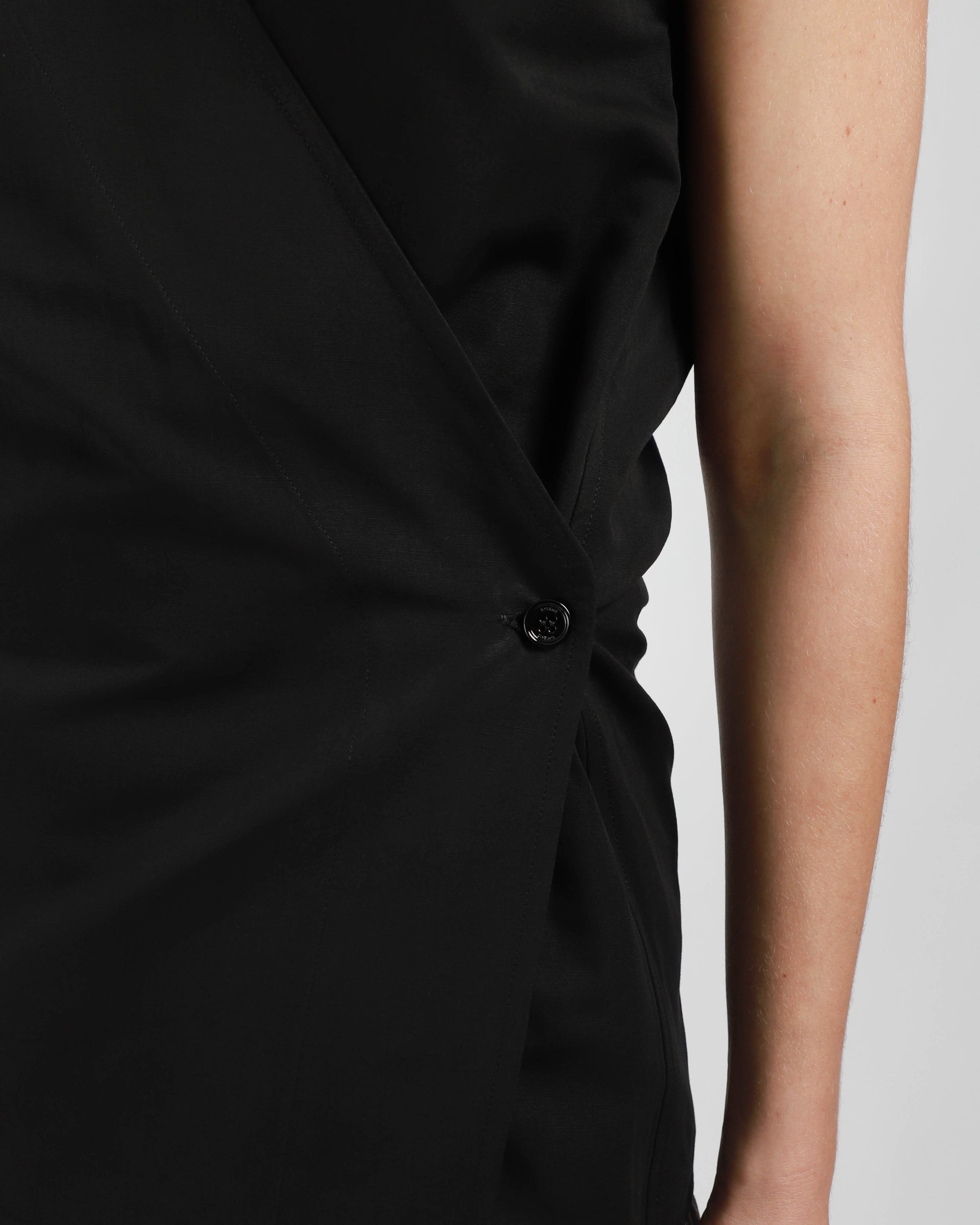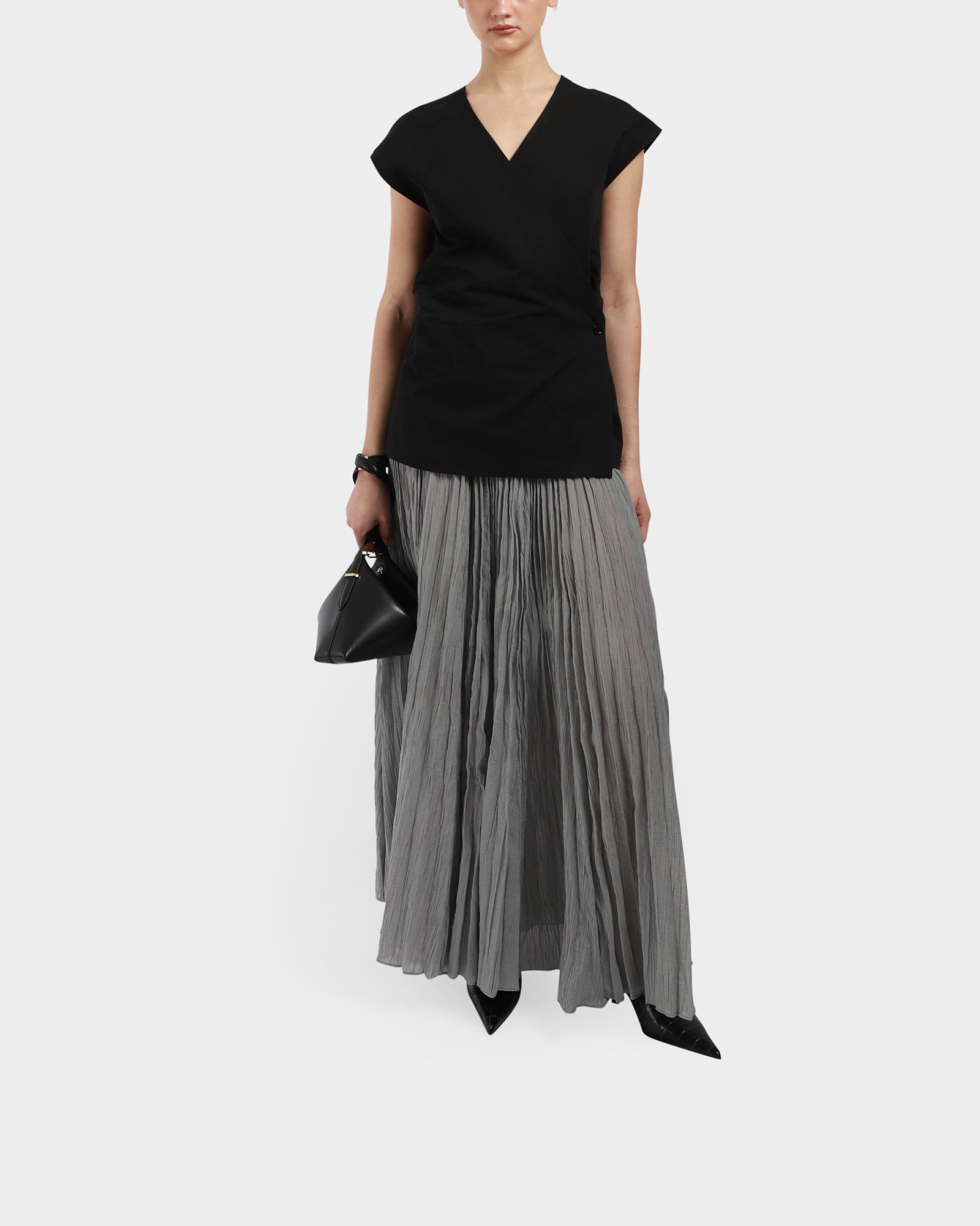 A lightweight wrap blouse from Toteme, made from a breathable cotton-linen blend. It features a V-neckline, short sleeves, and a side button closure for a clean, minimal look.