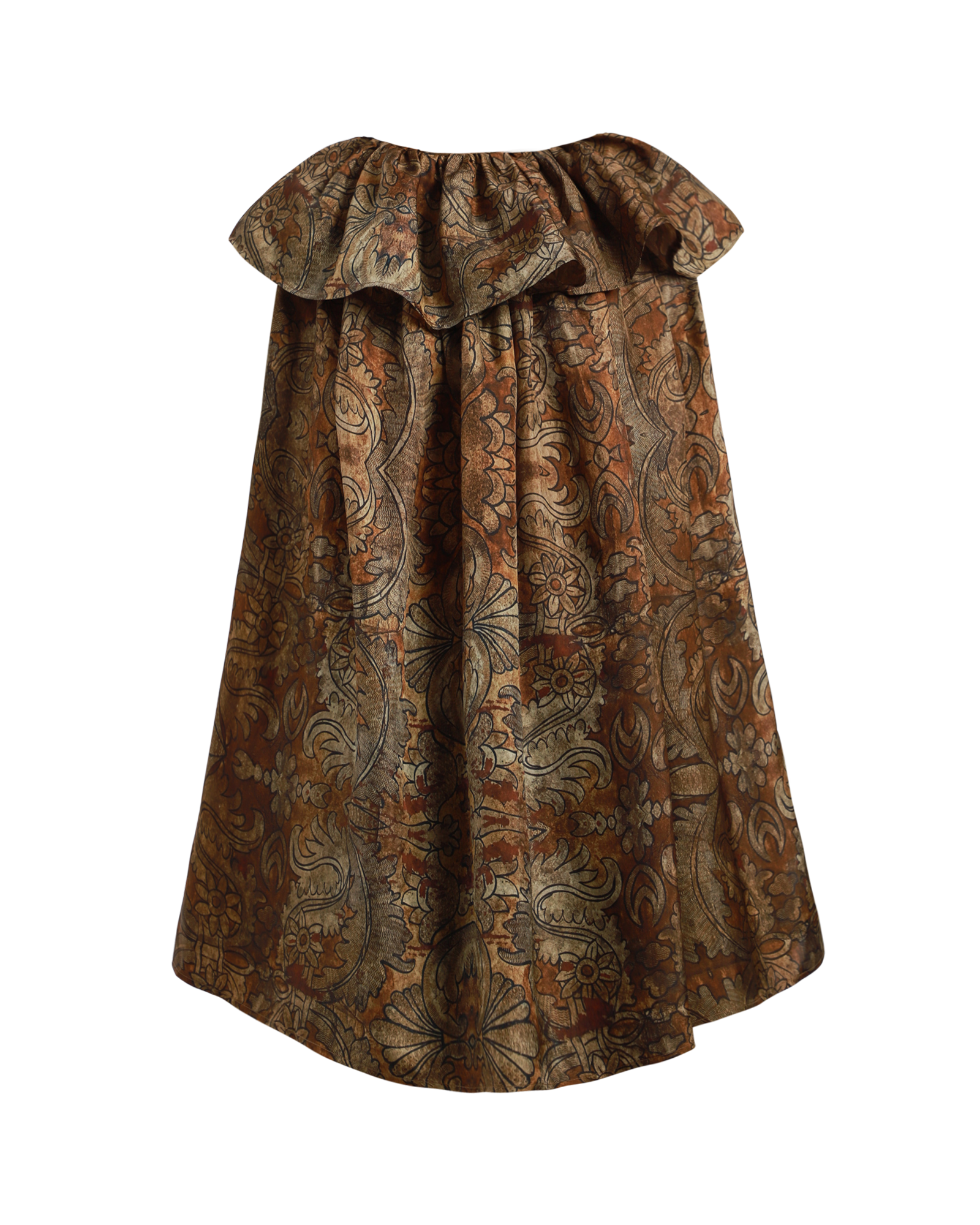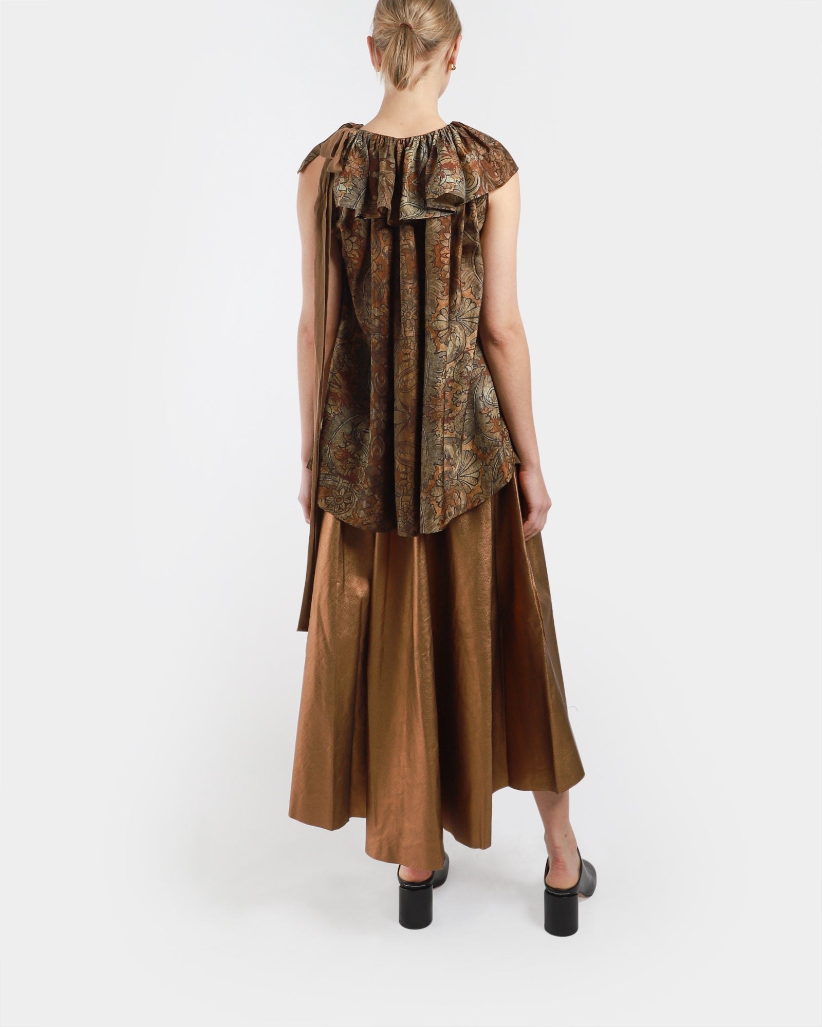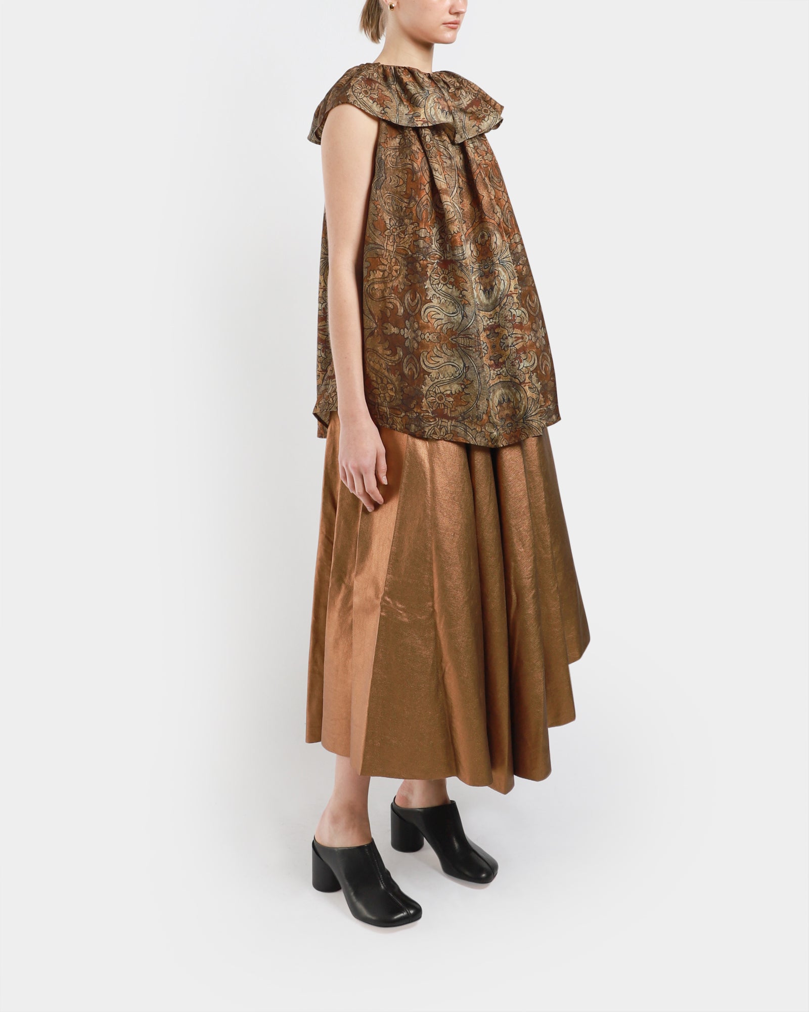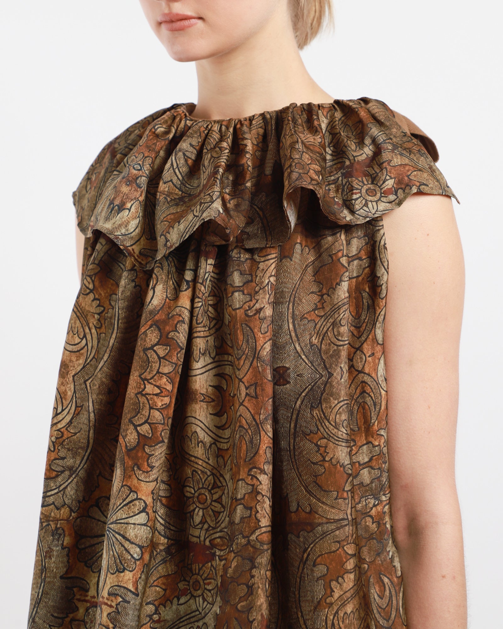 The Tait Top by Uma Wang is crafted from a soft, silky cupro blend. It features a rounded ruffled neckline, a tie closure at the back left, and an elongated silhouette.