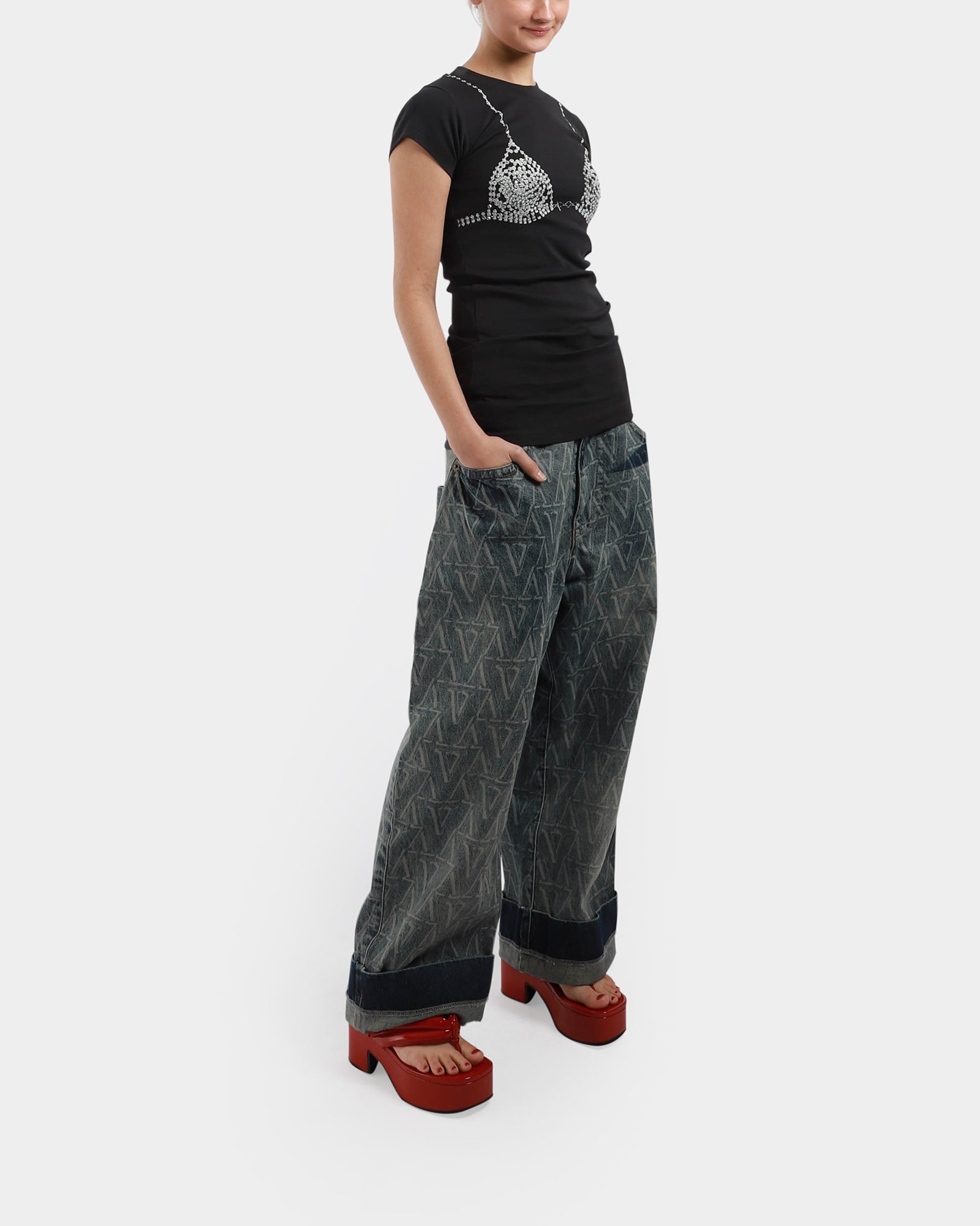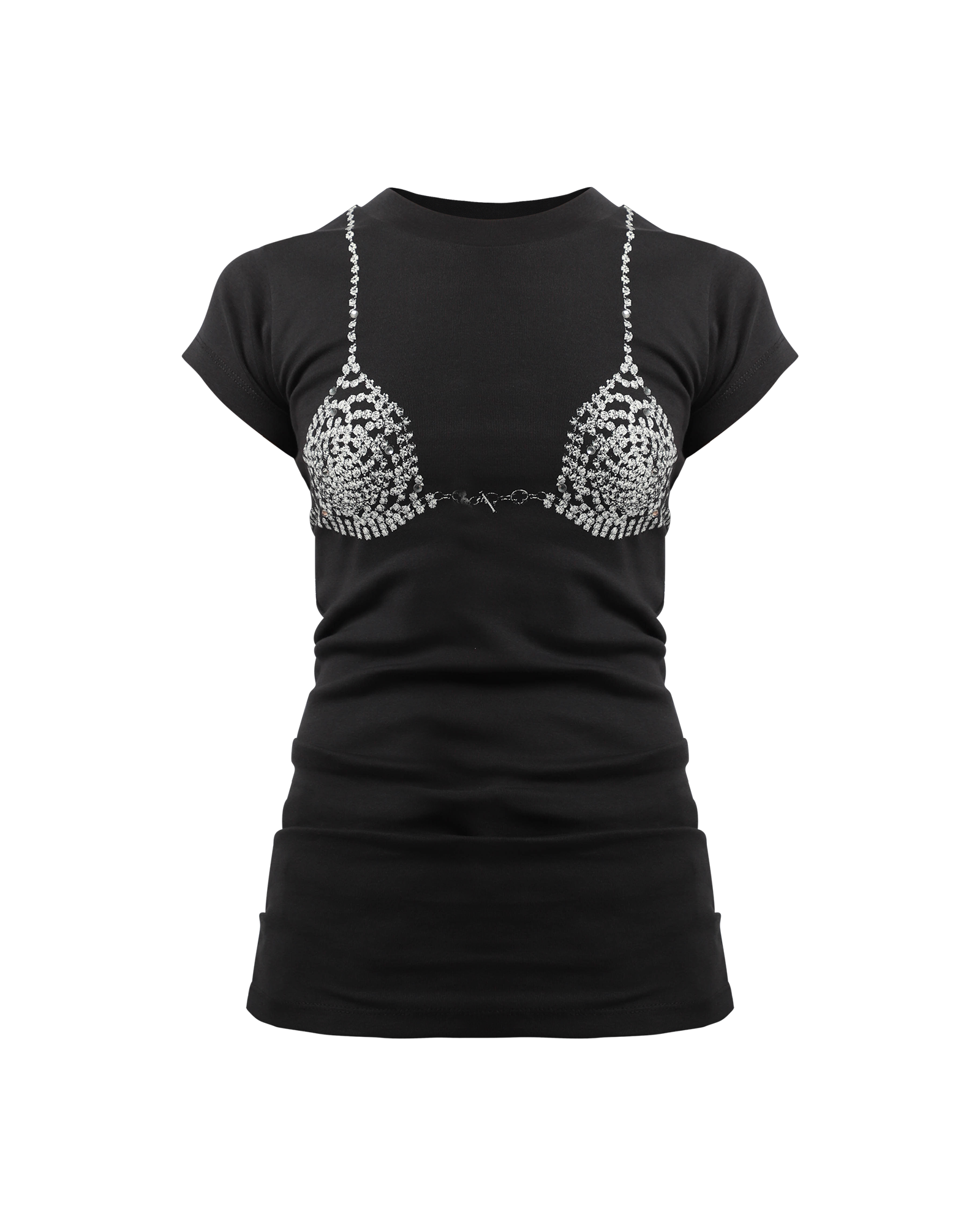 • A classic t-shirt, featuring a trompe l'oeil rhinestone bra print on front, a round neckline, short sleeves and a fitted silhouette.