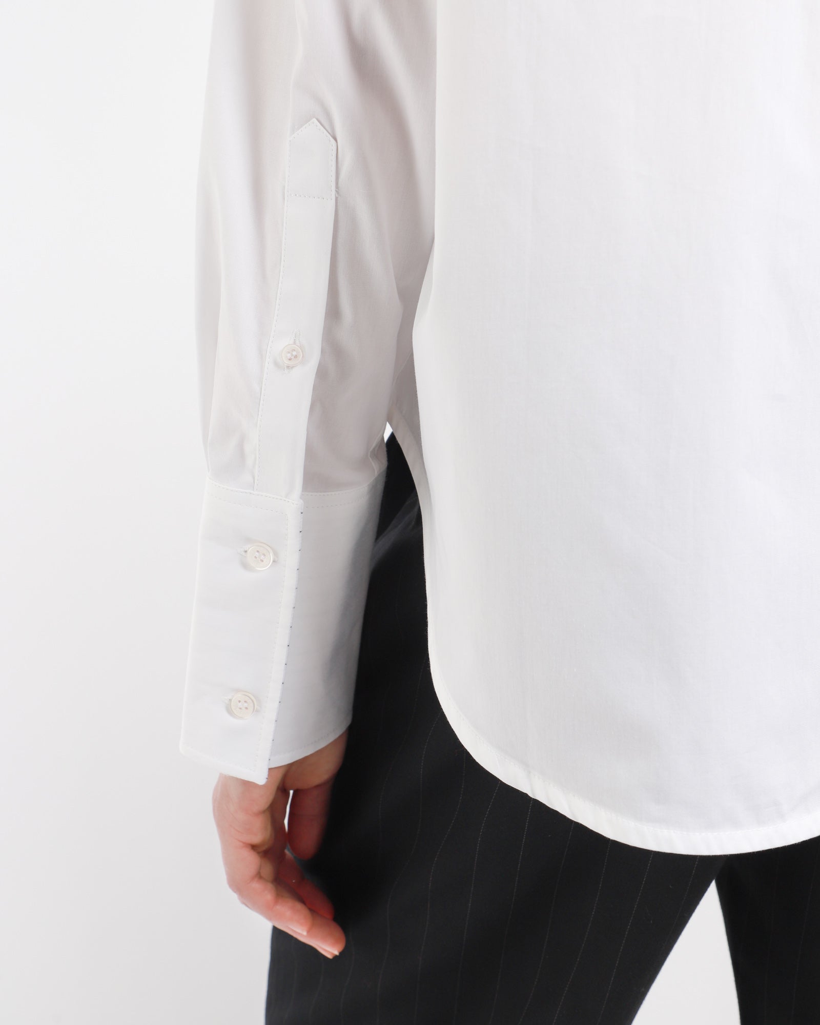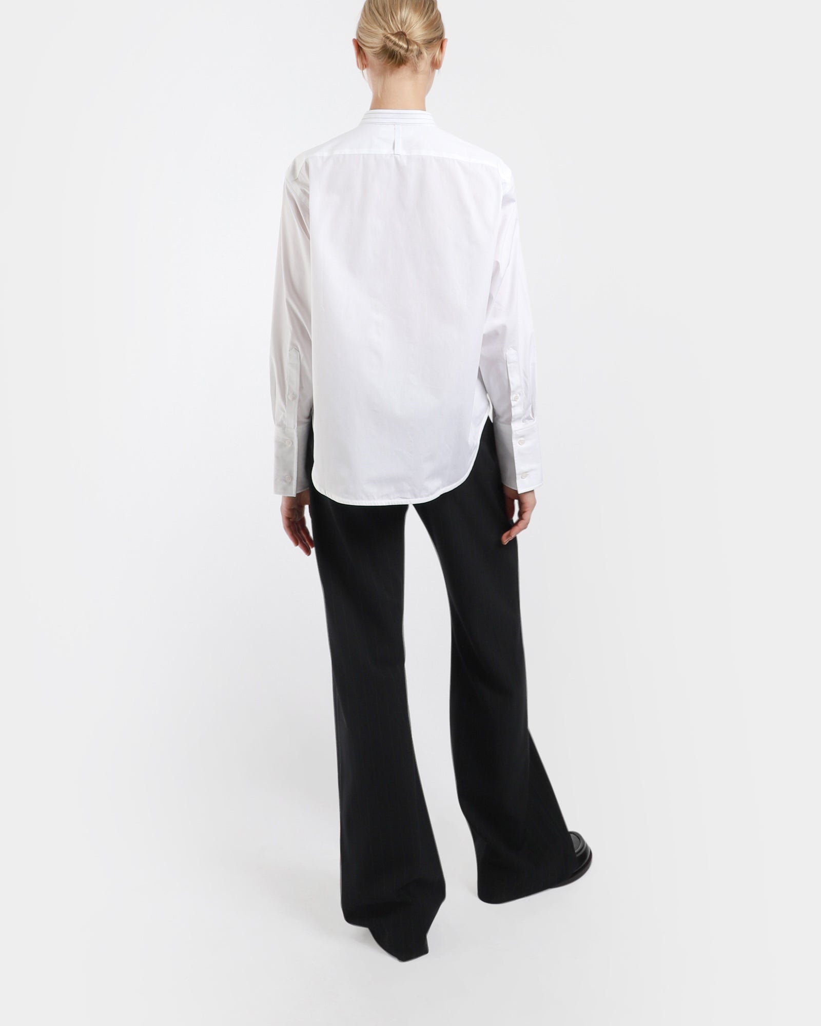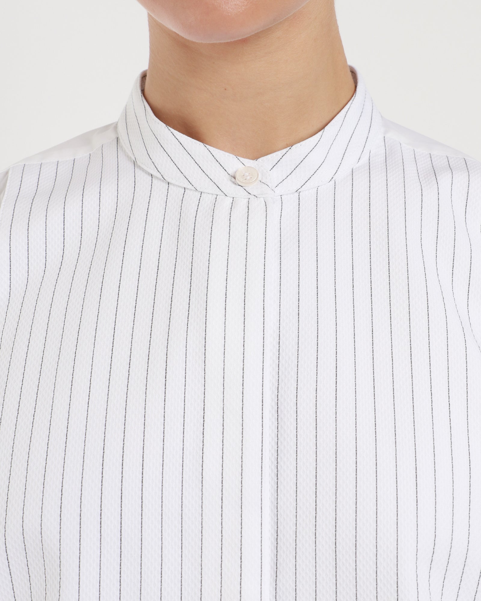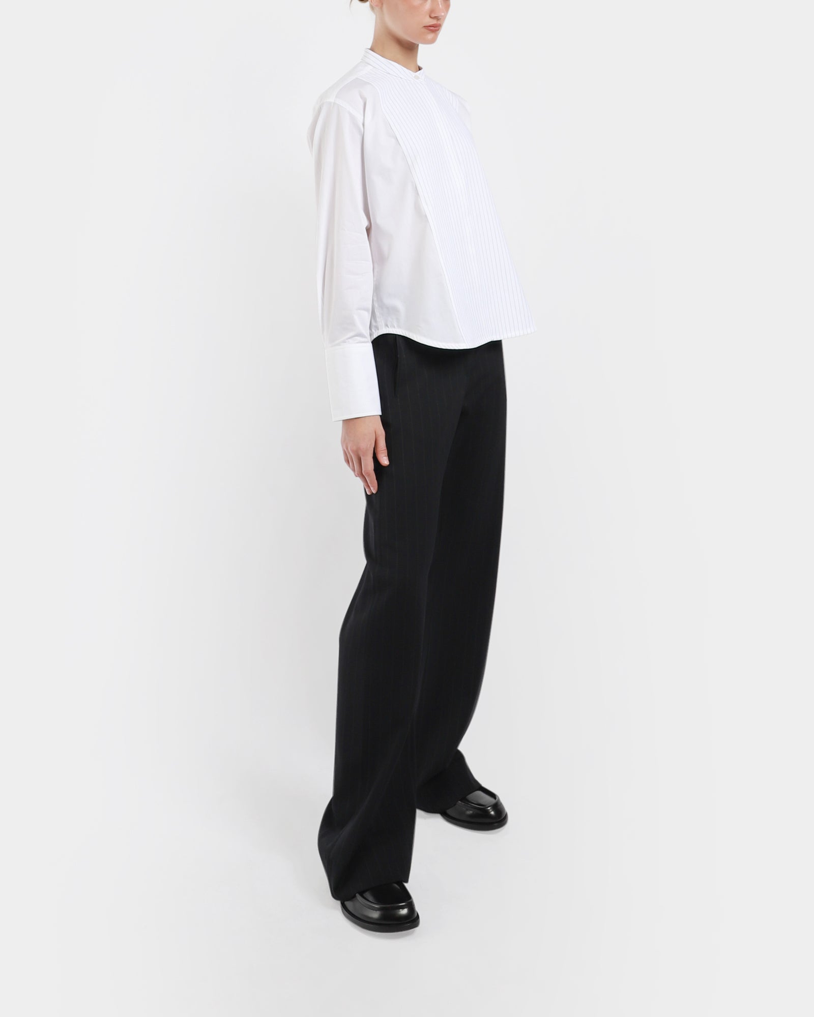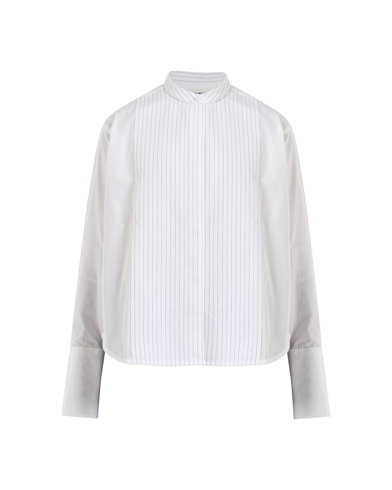 The Cropped Tux Shirt offers a fresh take on traditional masculine shirting. It features a striped bib, collar, and cuffs, with a cropped hemline for a feminine touch. Crafted from organic cotton in Turkey.