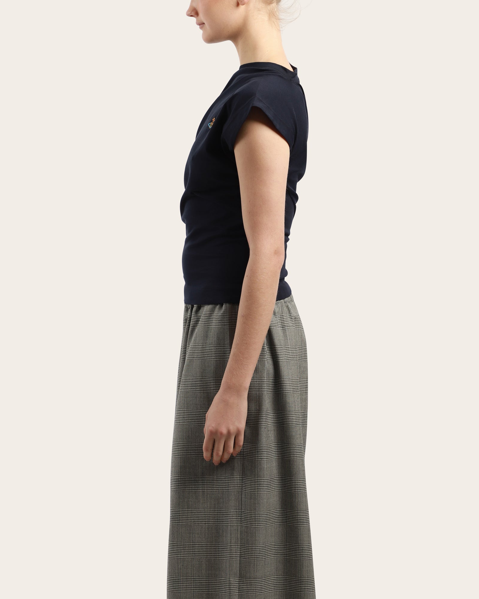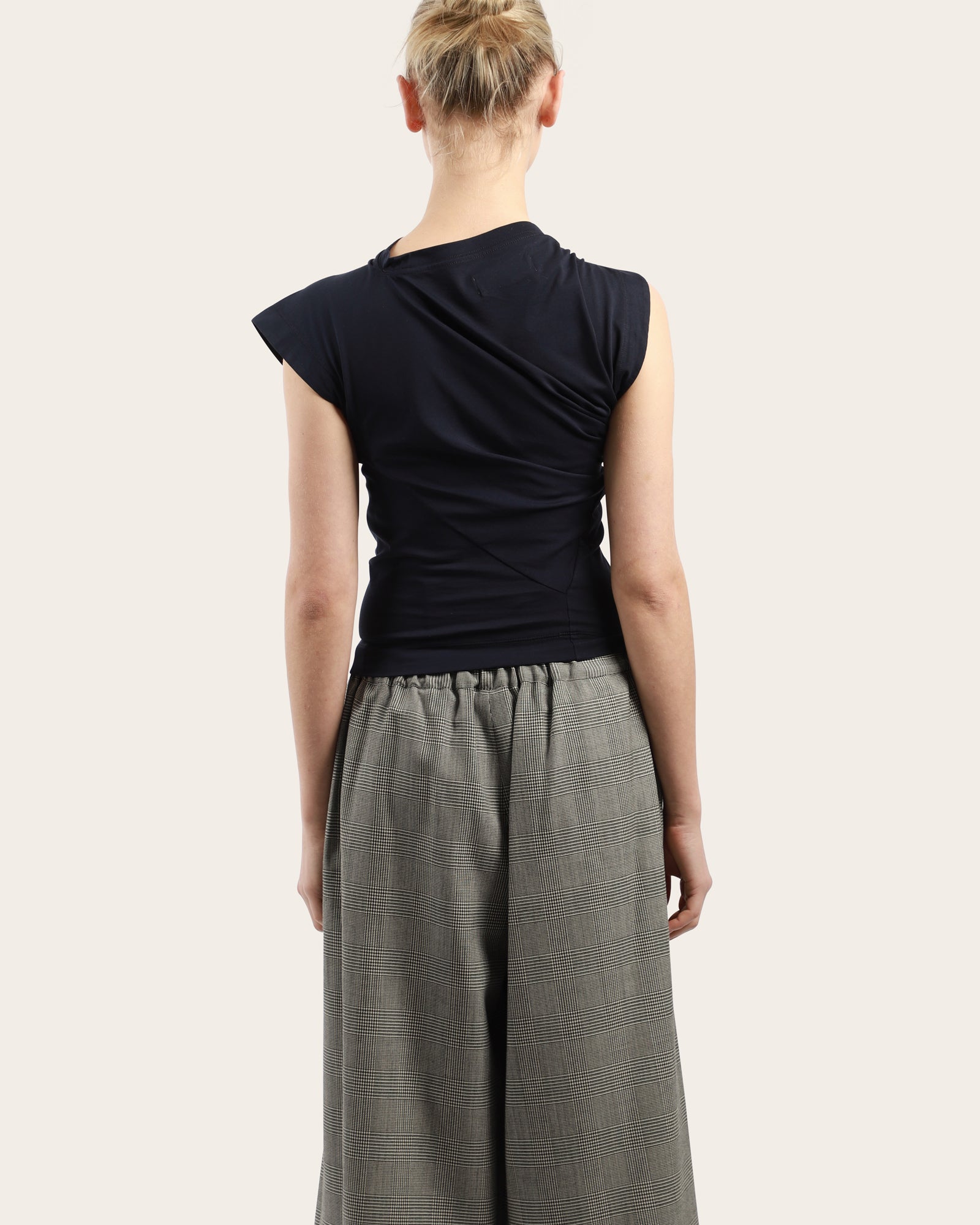 This sleeveless black top features an asymmetric draped neckline and a fitted silhouette. Detailed with the embroidered Orb logo at the chest, it brings a subtle twist to a classic wardrobe staple.