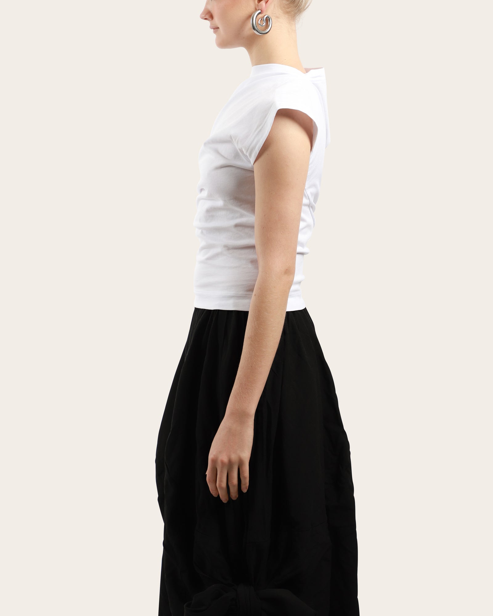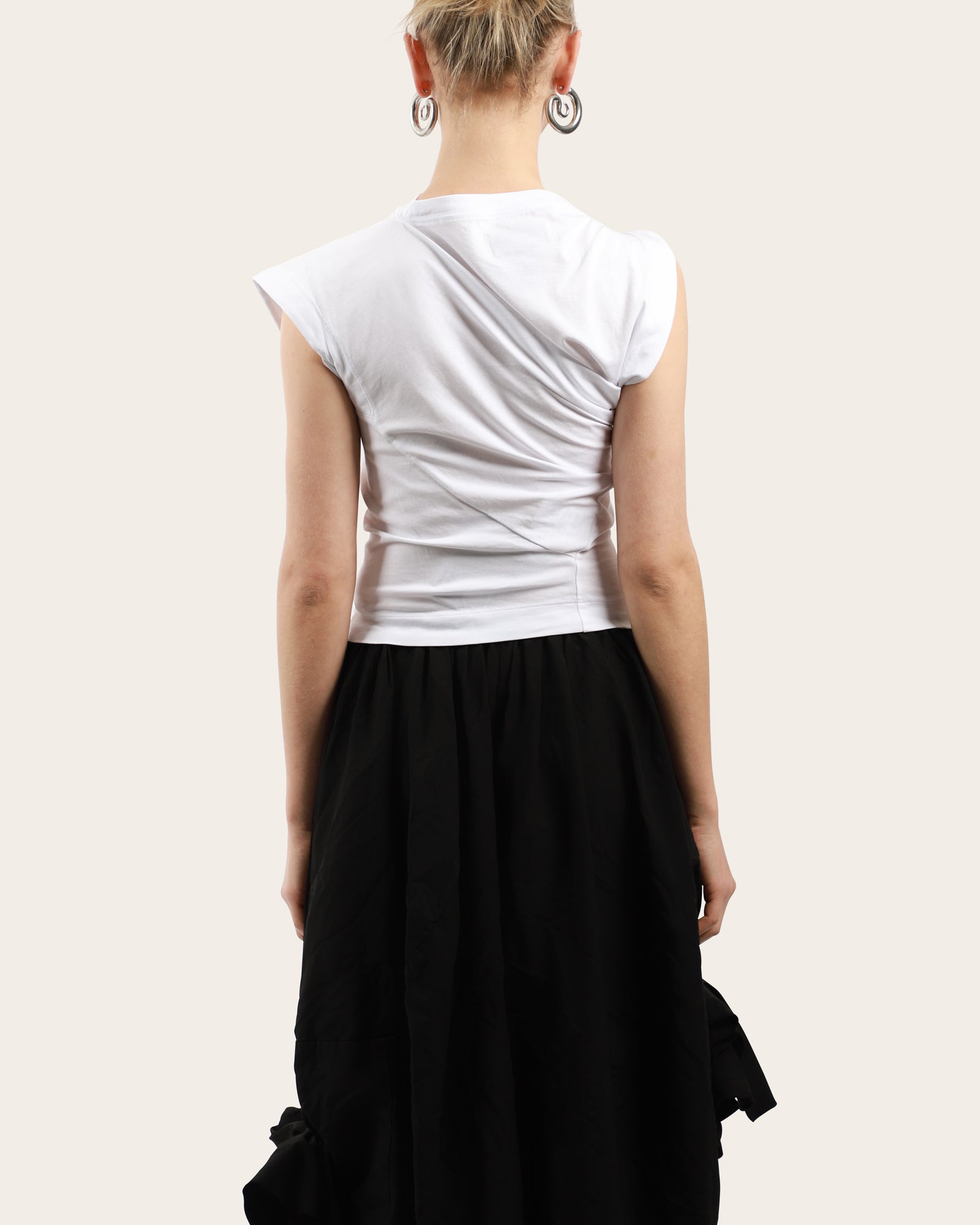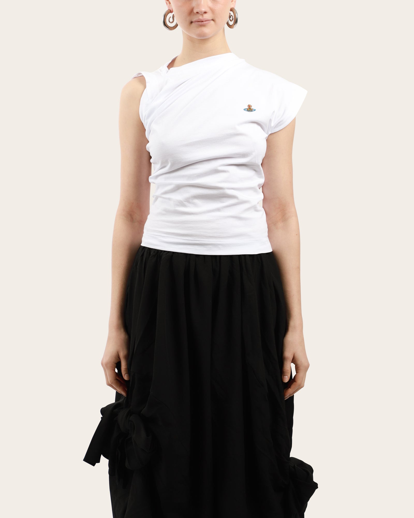 This sleeveless black top features an asymmetric draped neckline and a fitted silhouette. Detailed with the embroidered Orb logo at the chest, it brings a subtle twist to a classic wardrobe staple.