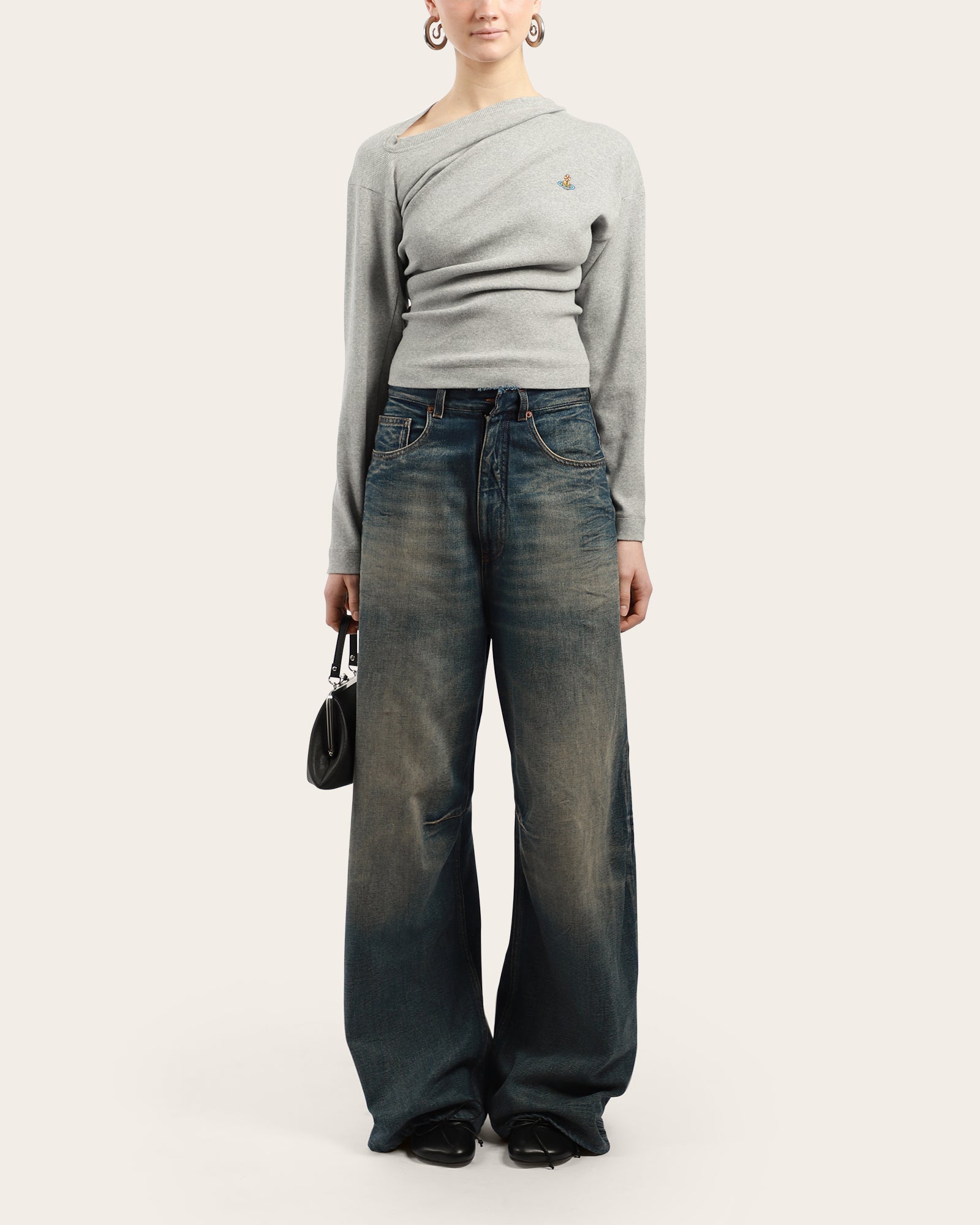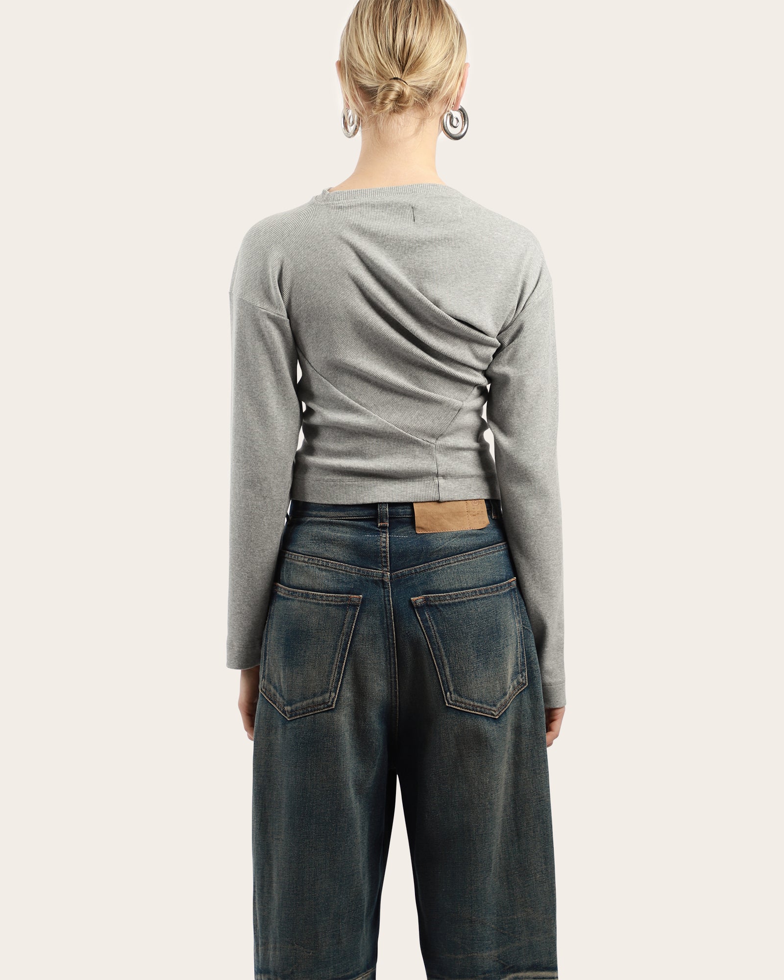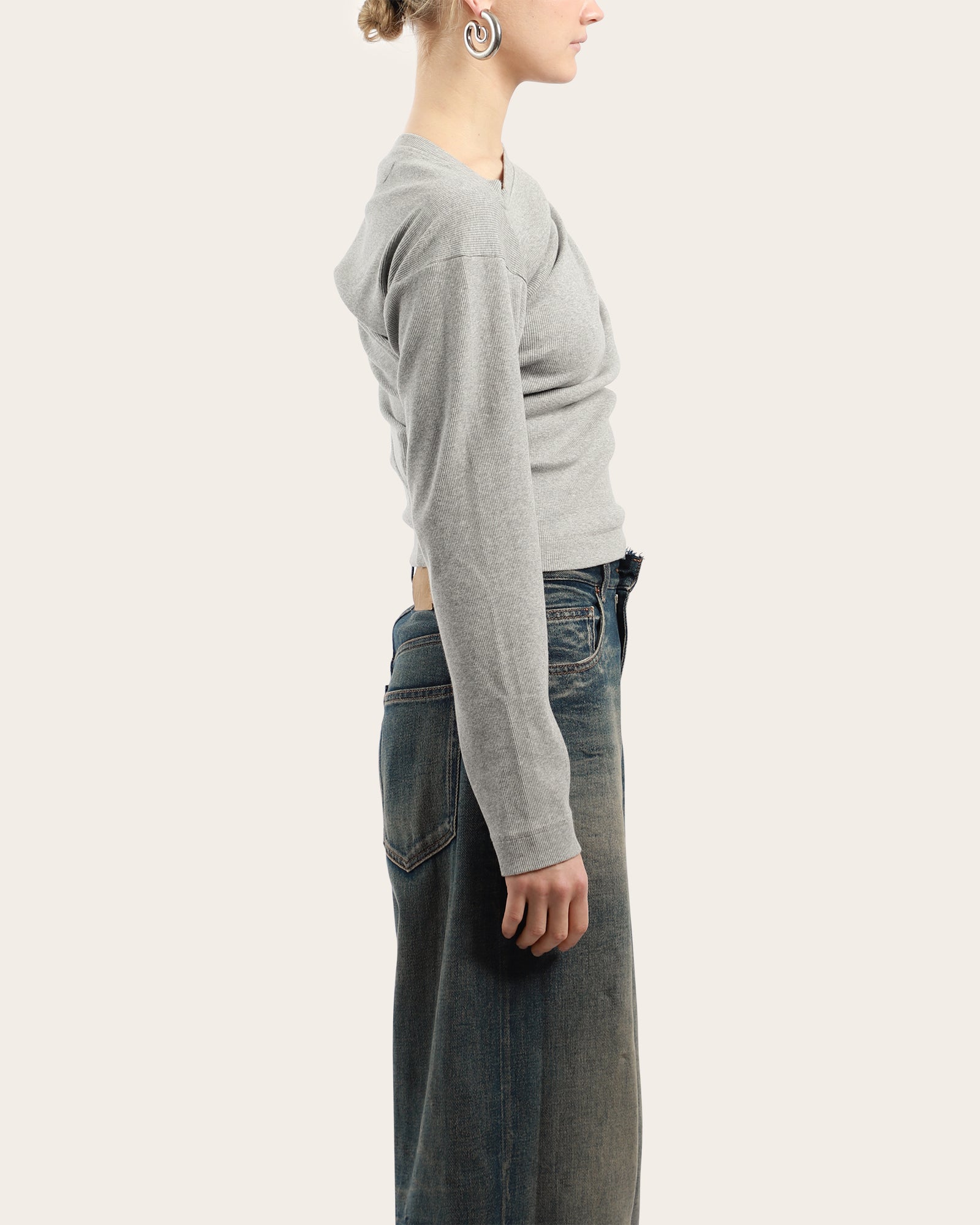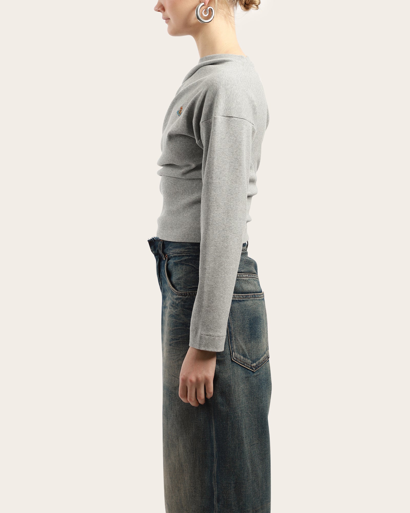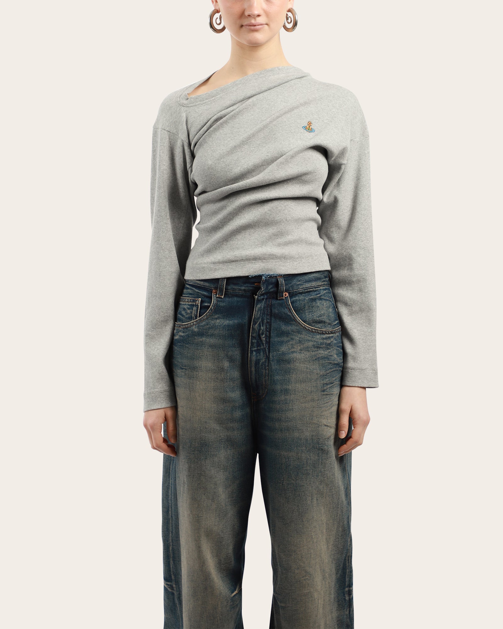 This grey long sleeve top features an asymmetric draped neckline with gathered detailing for a sculpted effect. Finished with the signature embroidered Orb logo at the chest, it offers a modern twist on a classic wardrobe staple.