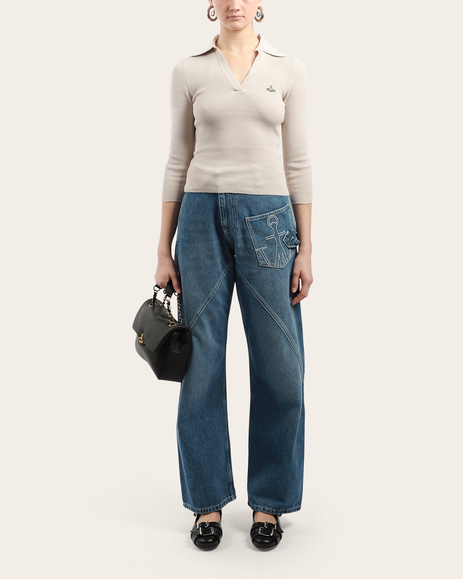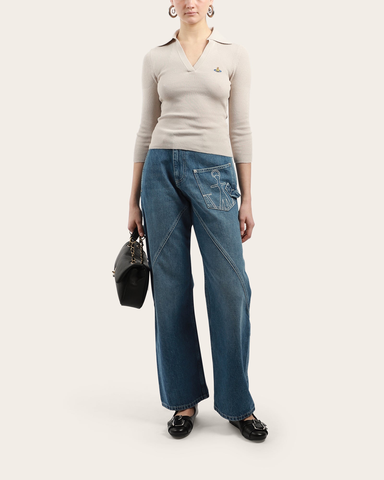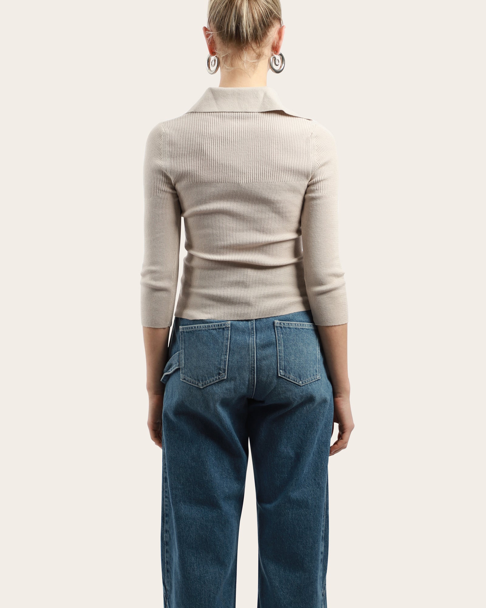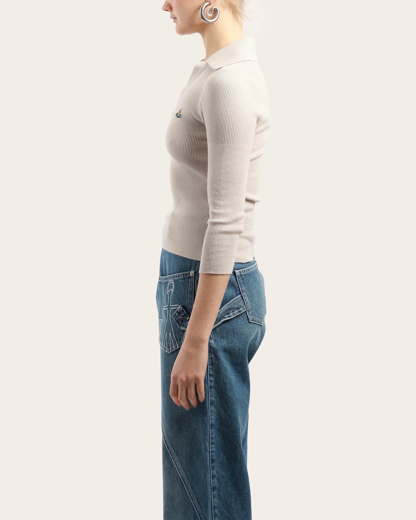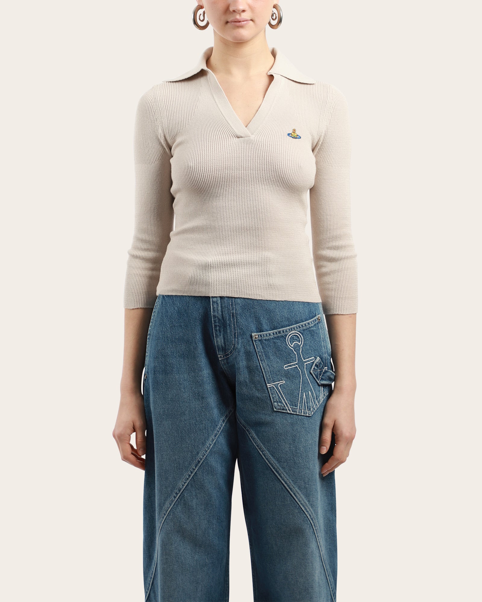This beige ribbed knit top features a sharp open collar, V-neckline, and three-quarter sleeves. Finished with the signature embroidered Orb logo at the chest, it offers a refined yet casual look.