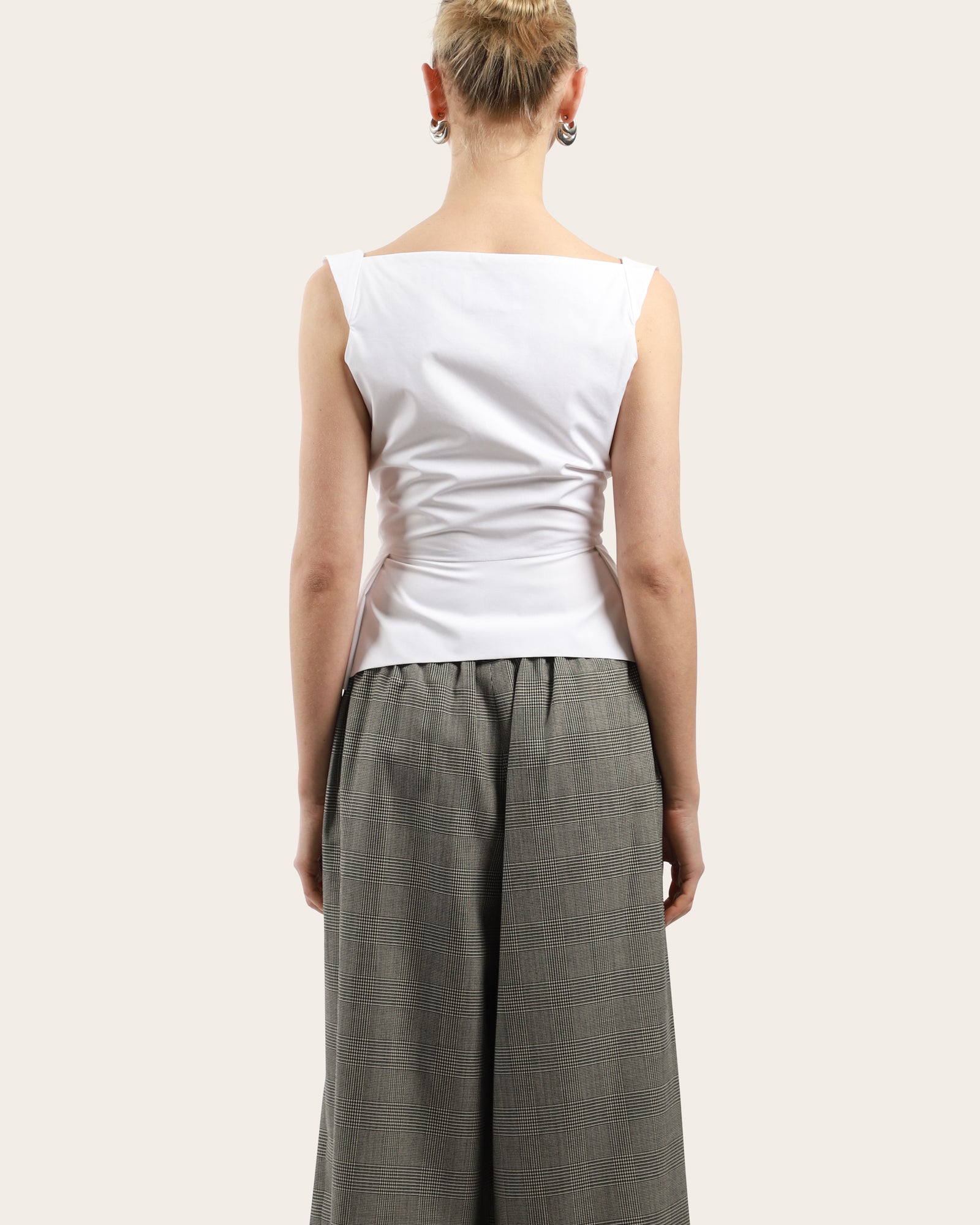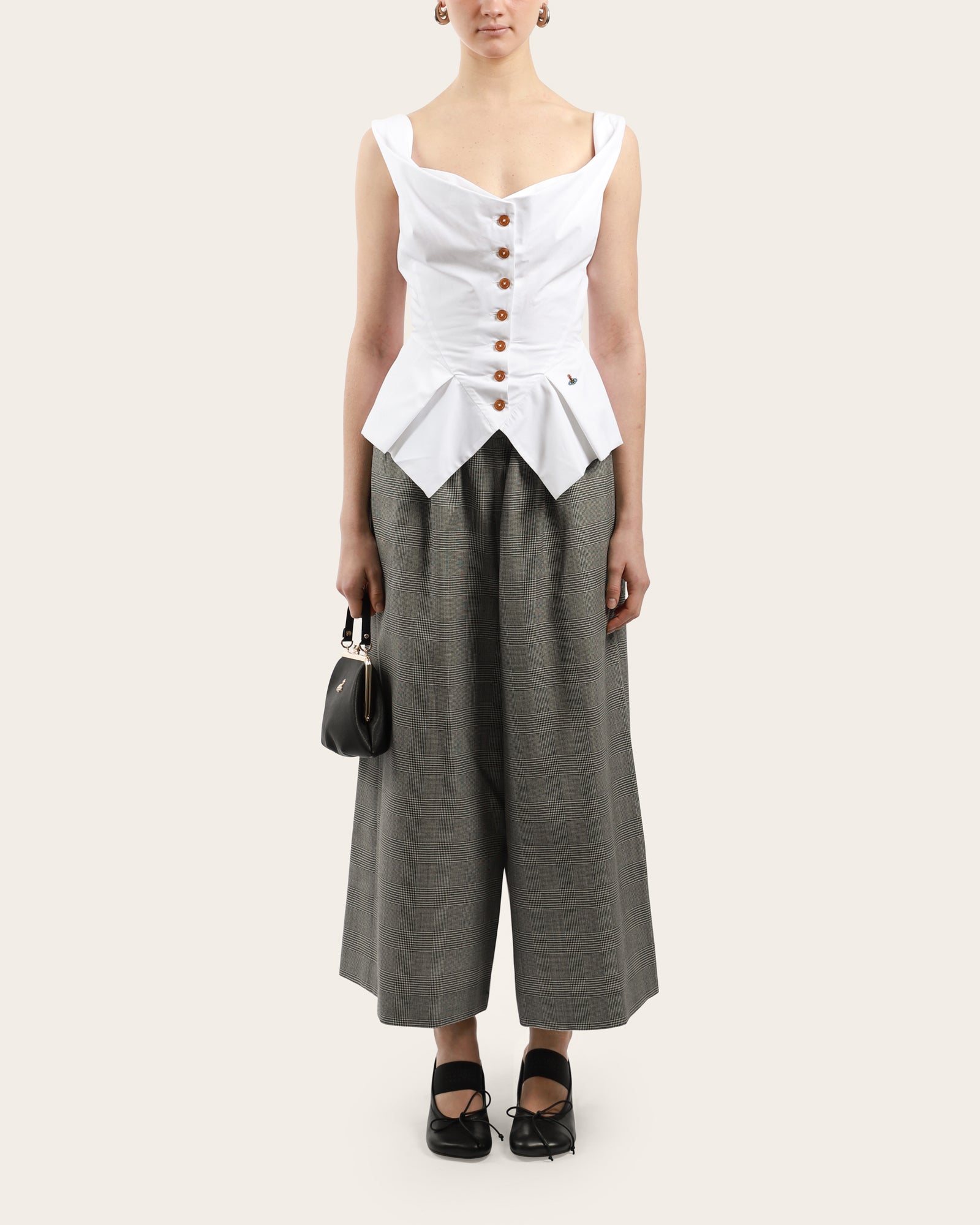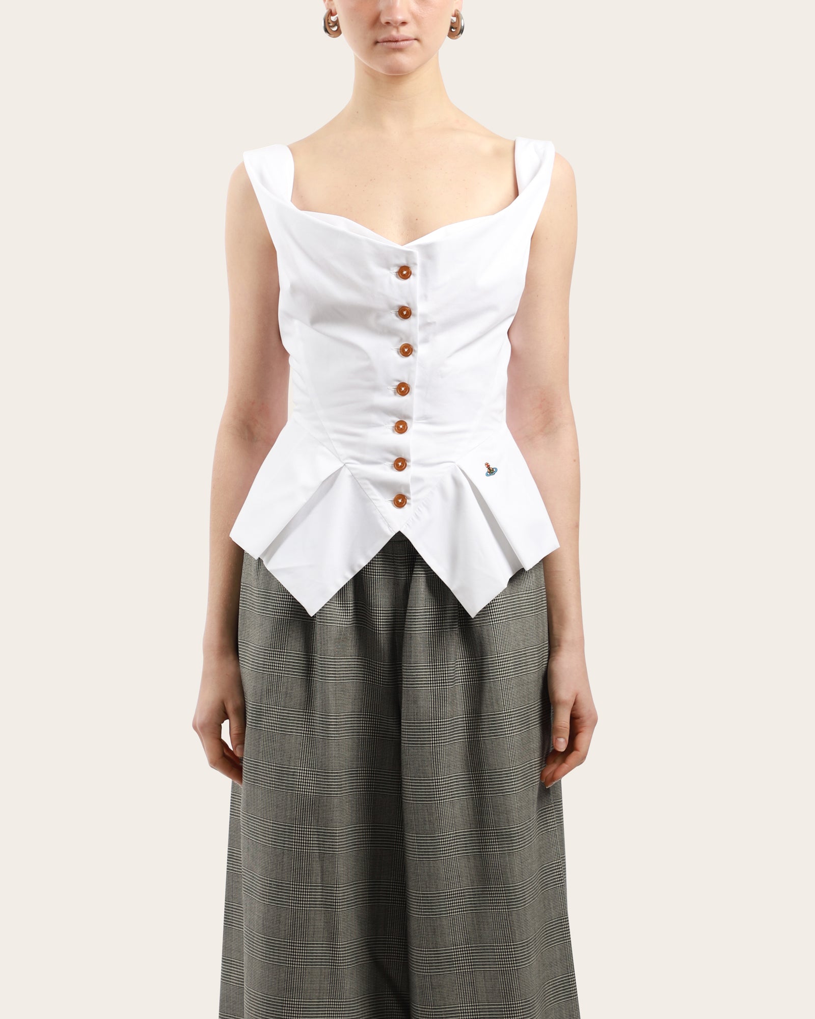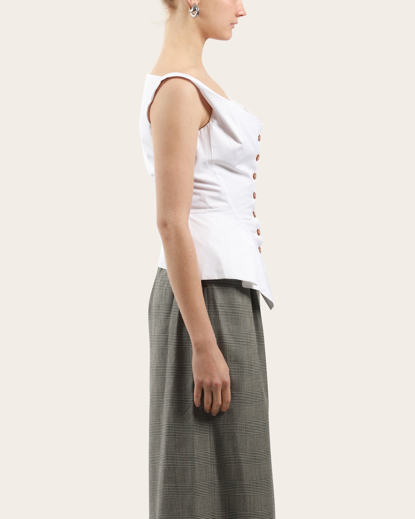 This sleeveless top features a flattering draped neckline and a sculpted, corset-inspired silhouette. Accented with a row of wooden buttons down the front and a pointed peplum hem, it combines elegance with a touch of vintage flair. Finished with the signature Orb logo for a distinctive touch.