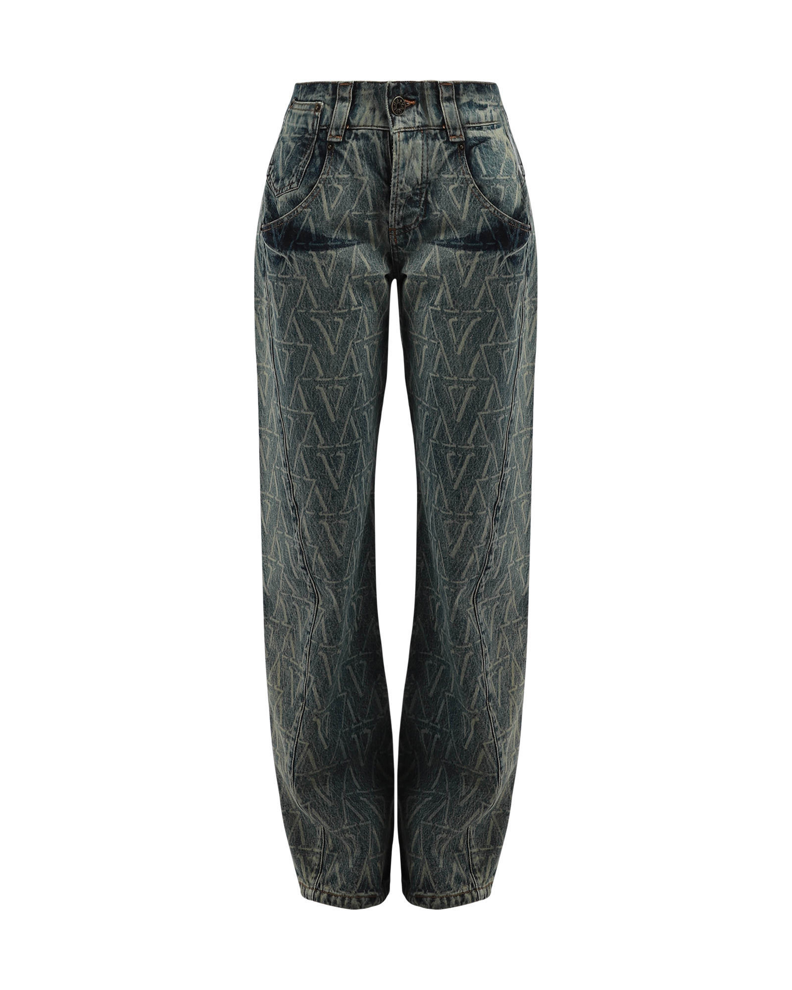 These twisted jeans feature monogram print all-over, mid-rise and wide leg fit, twisted seam, front pockets and back patch pockets, belt loops, button and zip fly closure at front.