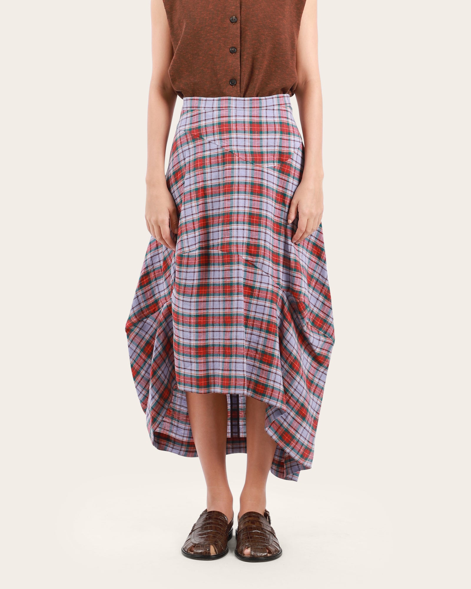The Aeroplane Skirt is a high-rise skirt with a soft asymmetric hemline and voluminous folds.
