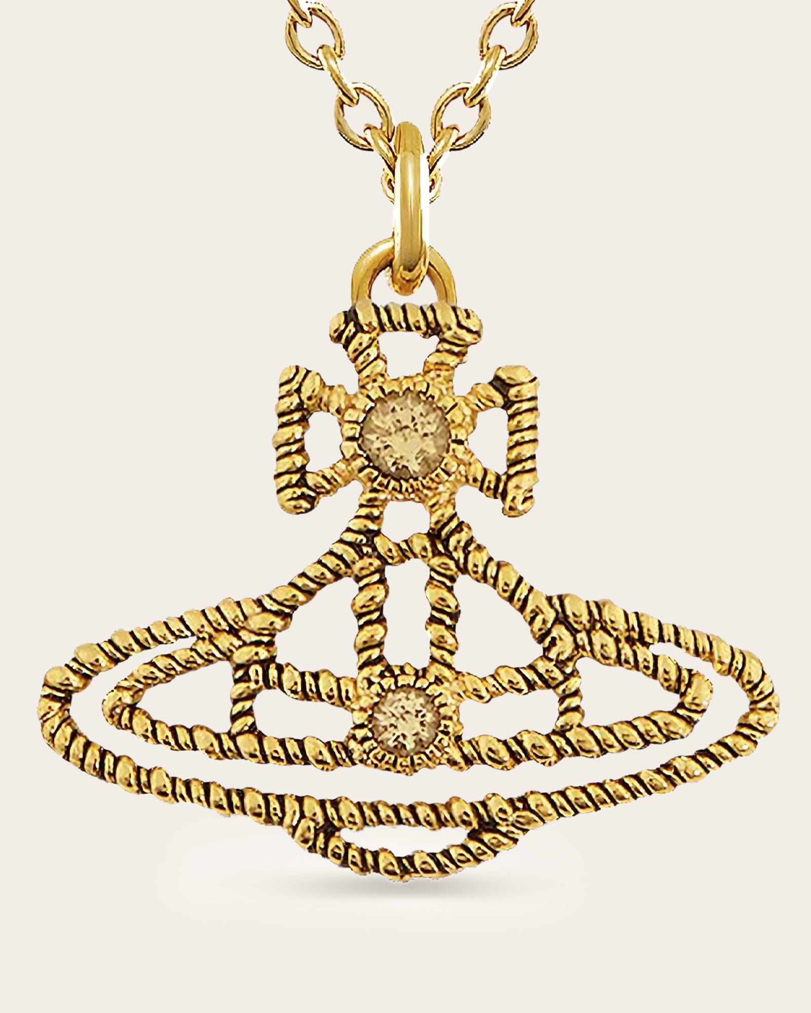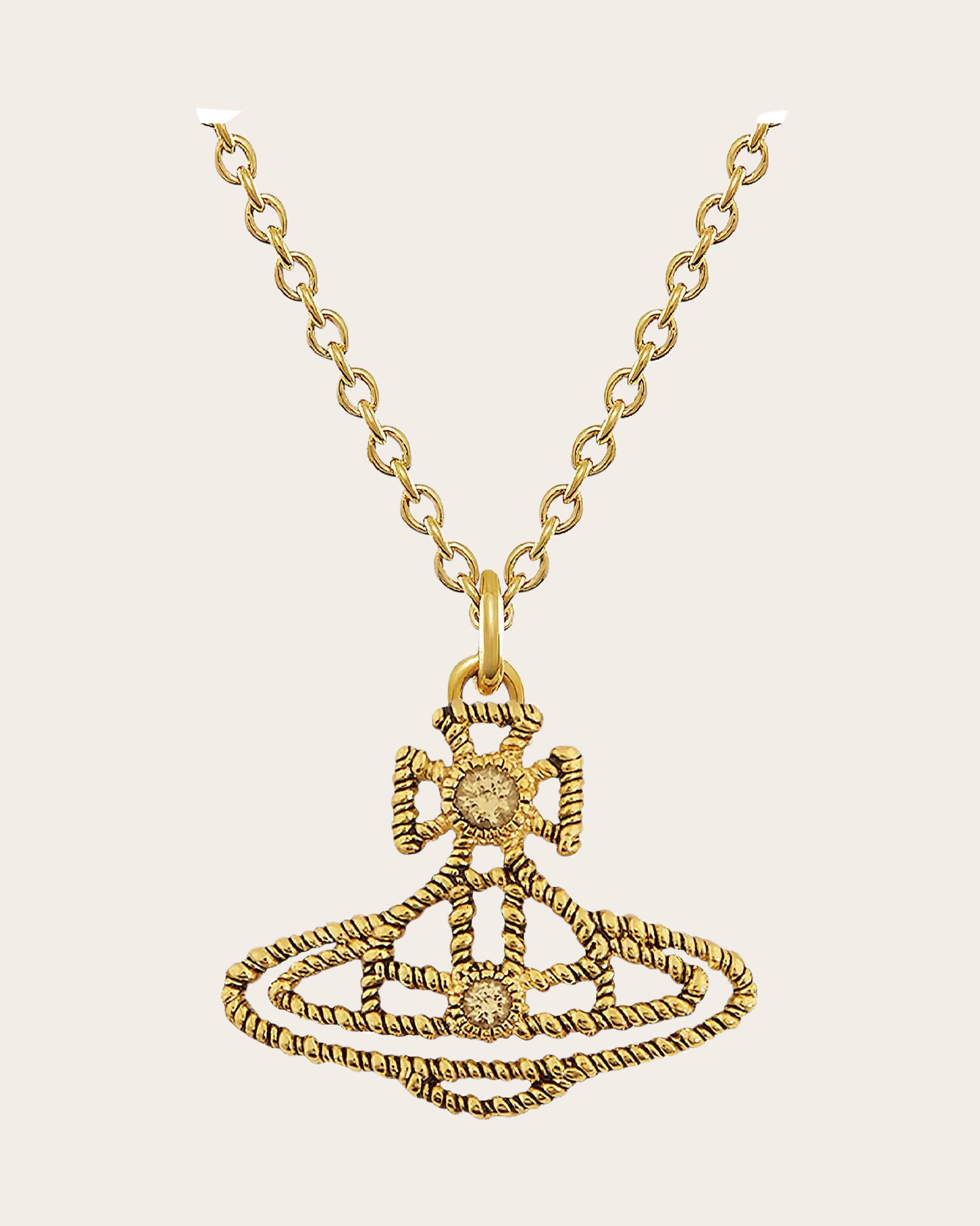 The Coretta Pendant Necklace is a new-season design that reimagines the house’s signature orb silhouette with elegant twisted rope detailing. Finished with a subtle patina to highlight its intricate texture, the pendant hangs from a fine trace chain, complete with a lobster clasp and extender for an adjustable fit.