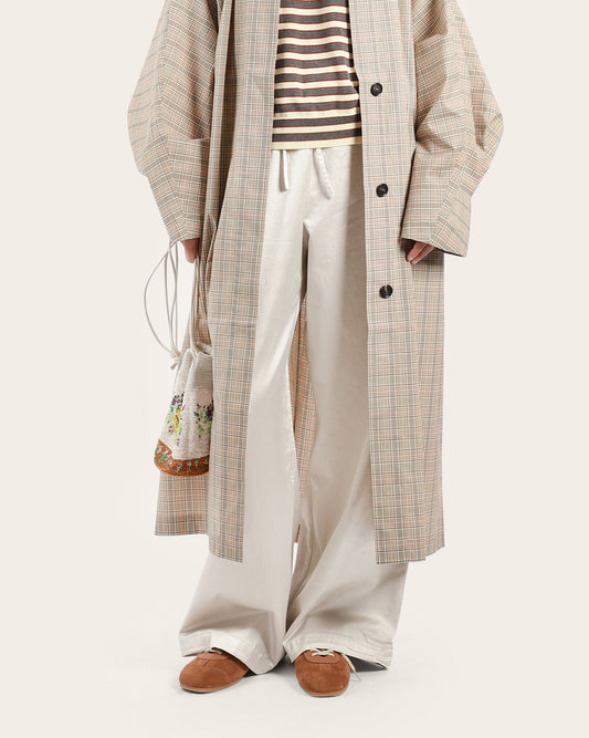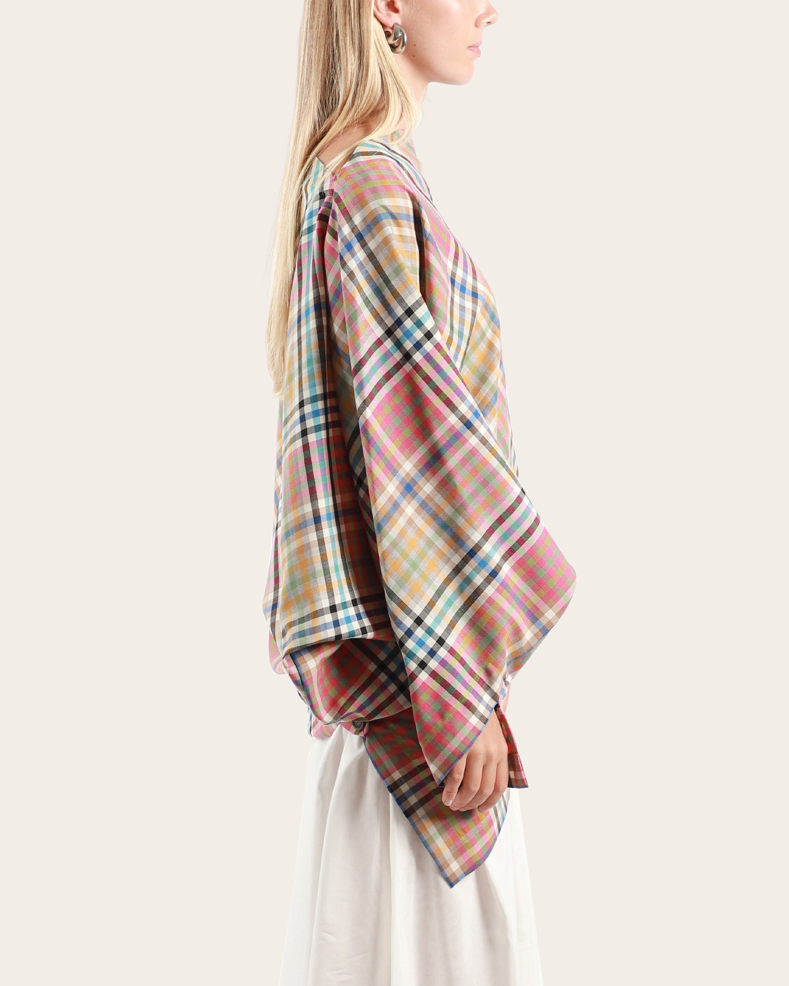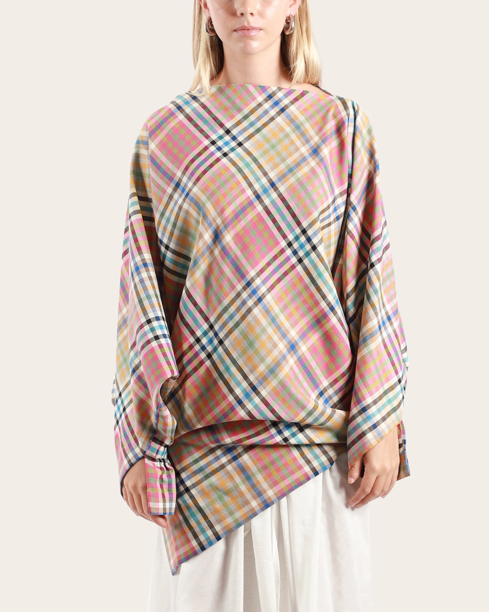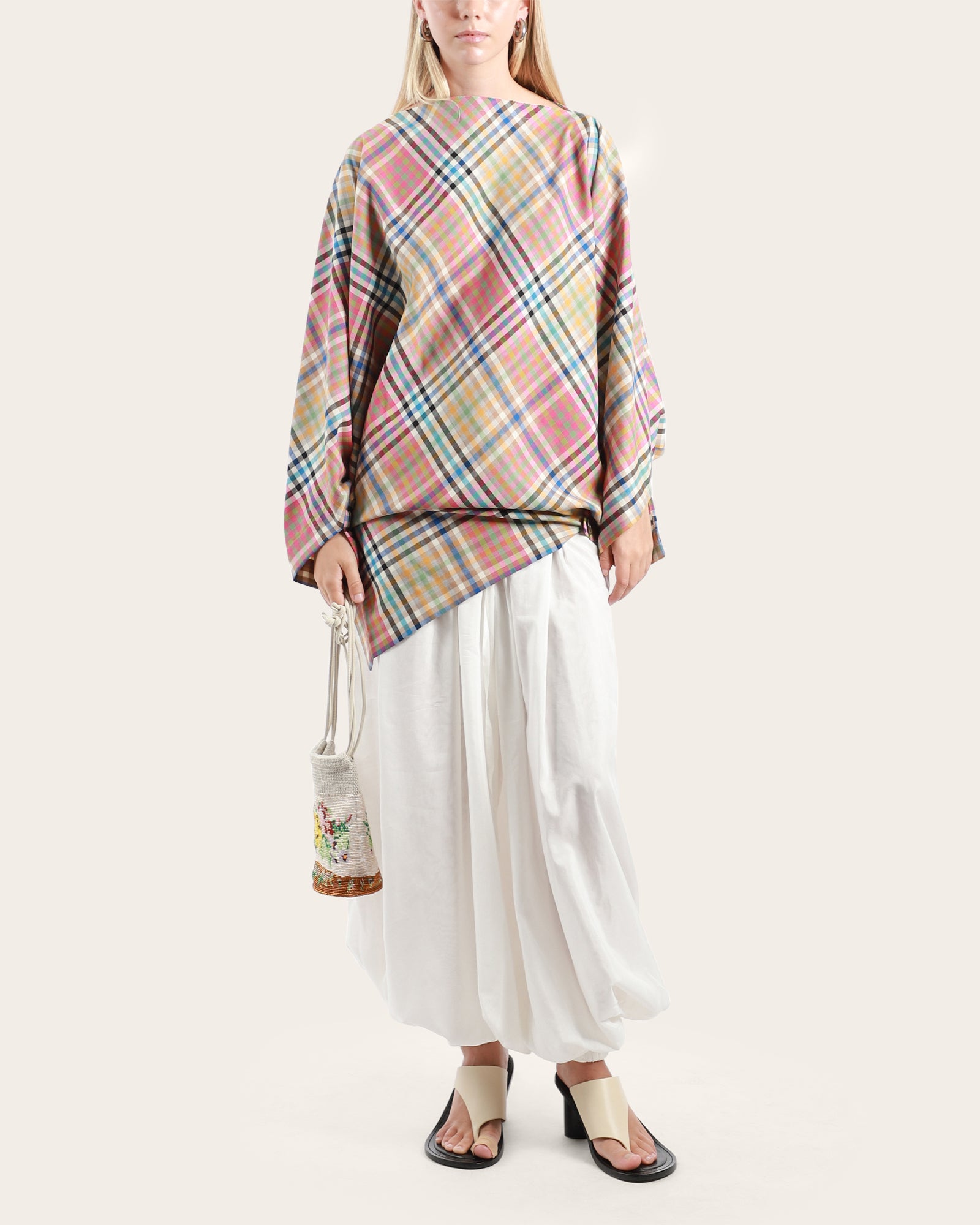 The Infinity Top is crafted from wool and detailed with a tartan check all-over. Long sleeves that gather at the wrists and a wide boat neckline with dropped shoulders, draping into an oversized silhouette that ends in an asymmetric hemline.