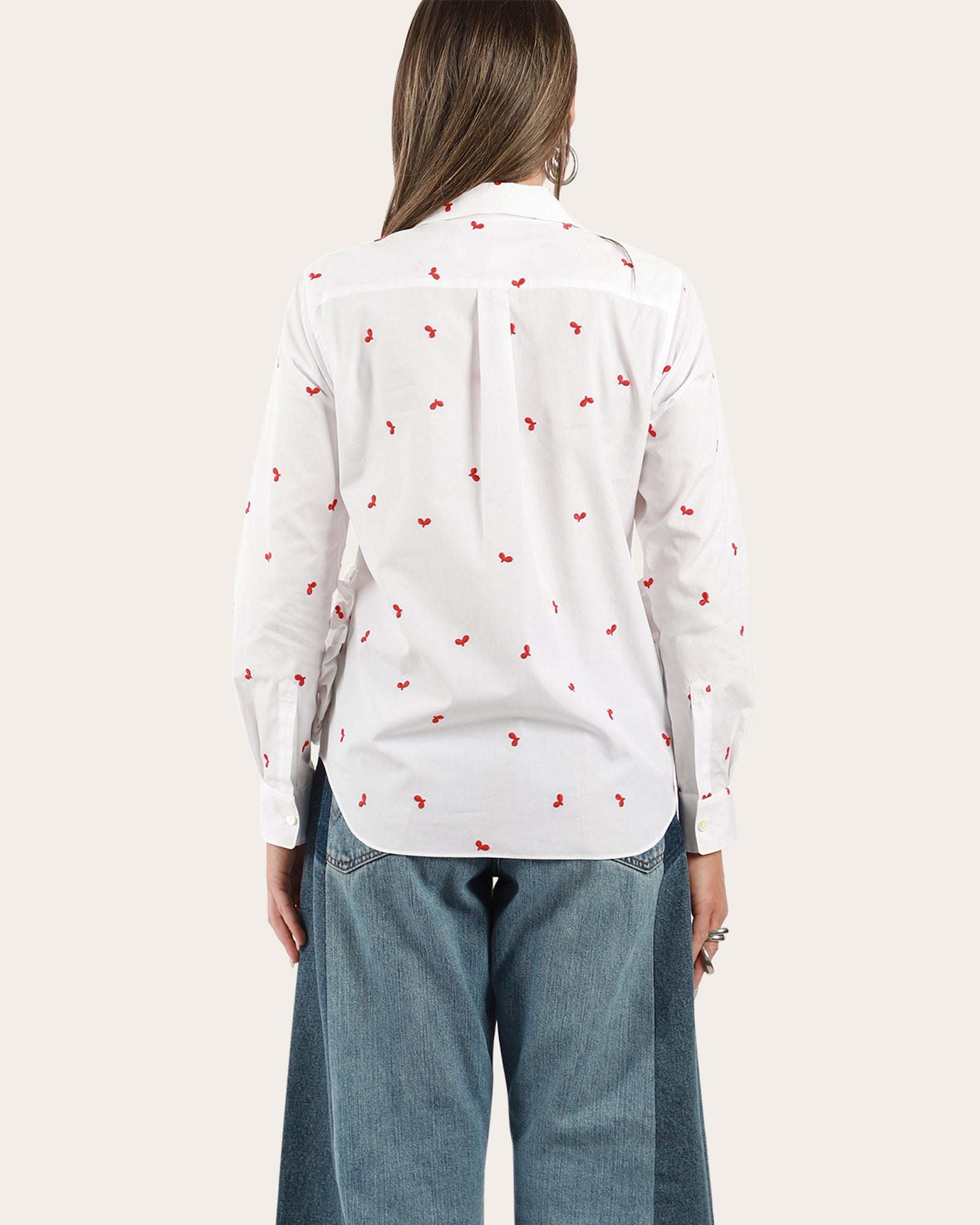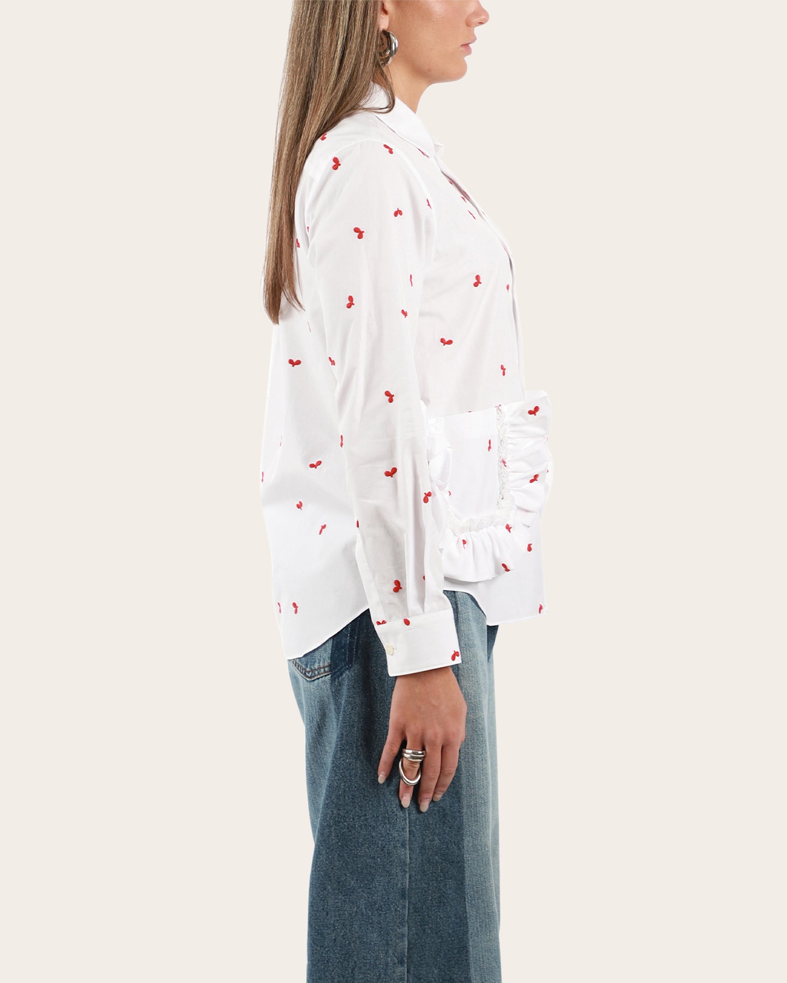 • A fitted shirt, featuring a round collar, buttons at front to close, red embroidery detail all over, side pockets with frills detail, finished with a curved hem. Made in Japan.