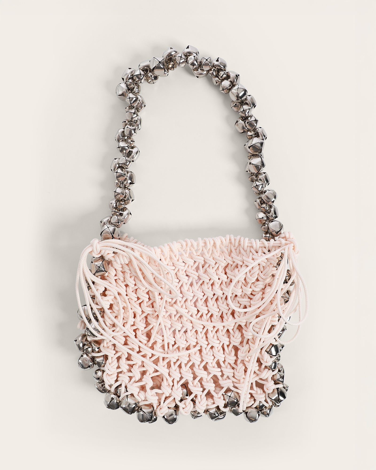 Designed by Niccolò Pasqualetti, this structured mini bag effortlessly blends minimalist design with refined functionality. Featuring a sleek, architectural silhouette, it includes a practical top handle with little bells attached together, draped strap detailing on each side, main compartment, with a woven design. Perfect from day to evening, this sophisticated piece adds a touch of effortless polish to any outfit. Handmade in Italy.