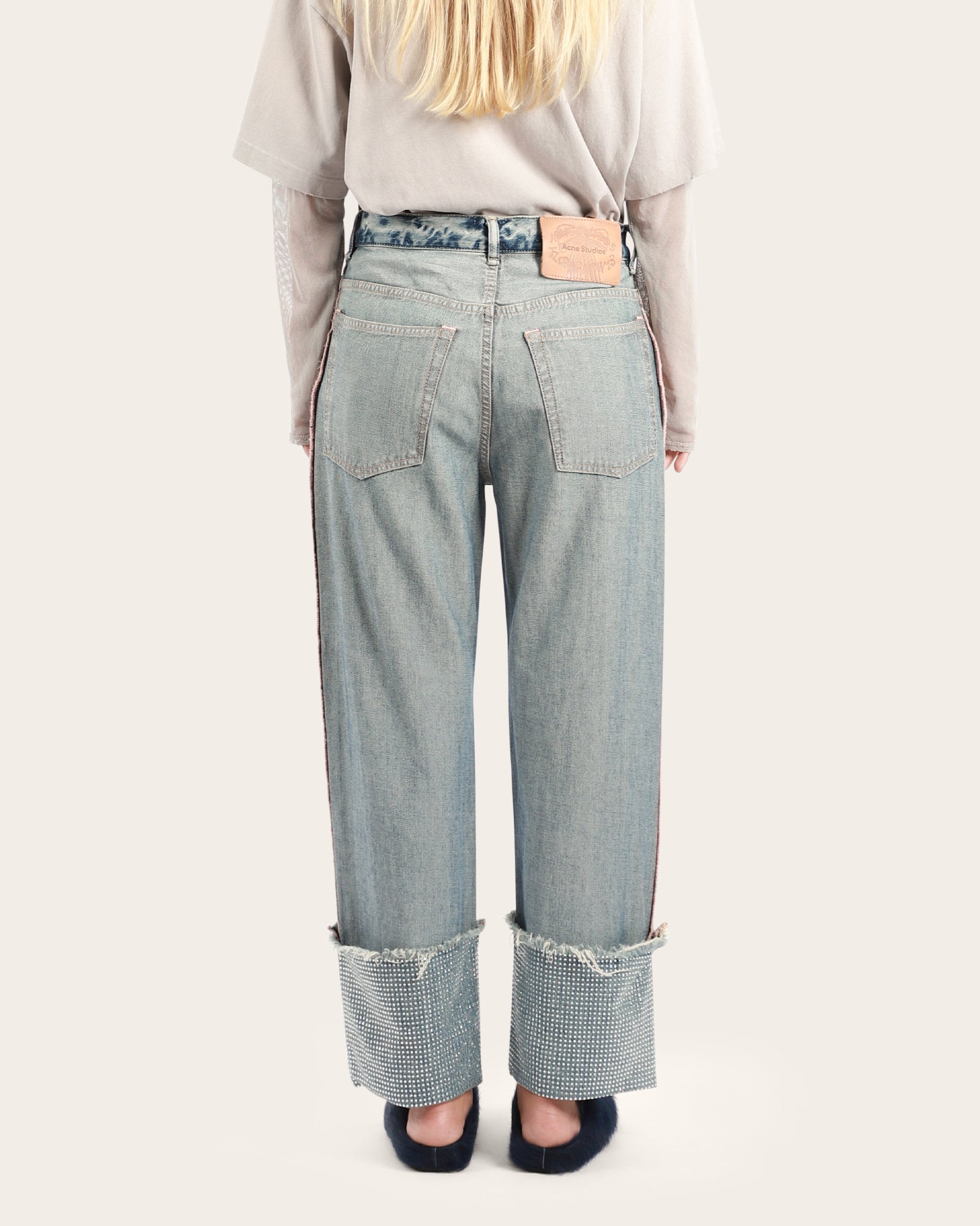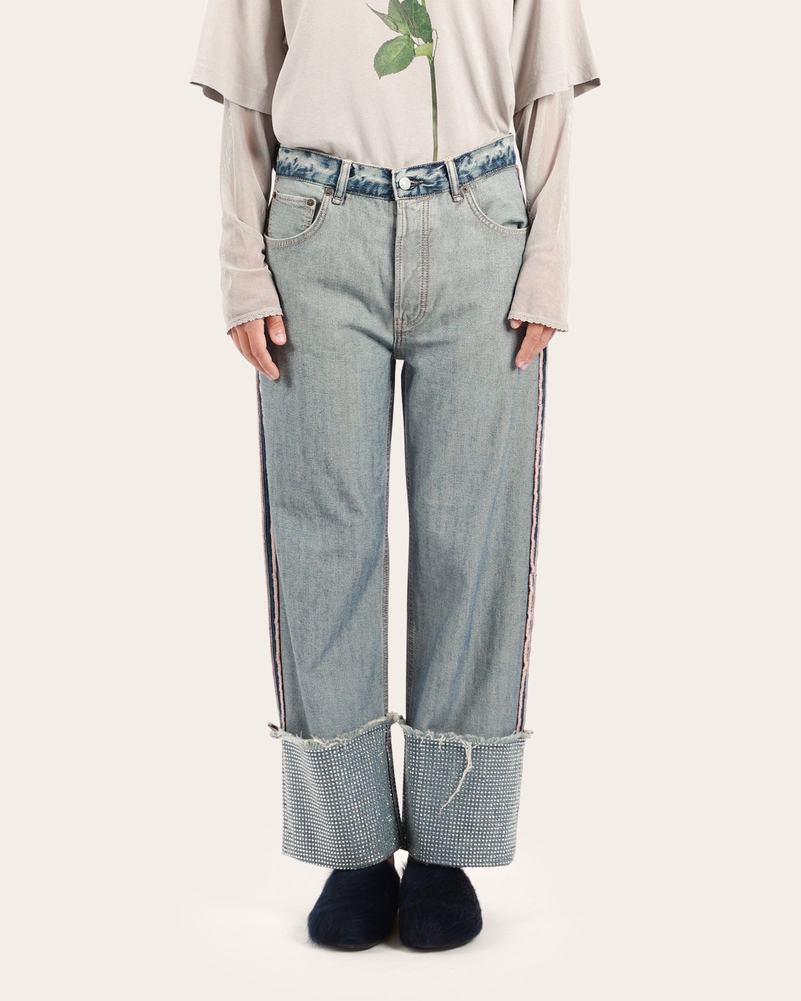 Denim trousers with a unique inside-out look and classic 5-pocket design. Upturned cuffs reveal subtle rhinestone detailing. Regular fit with a mid waist, straight leg, and ankle-length hem for a versatile, modern silhouette.