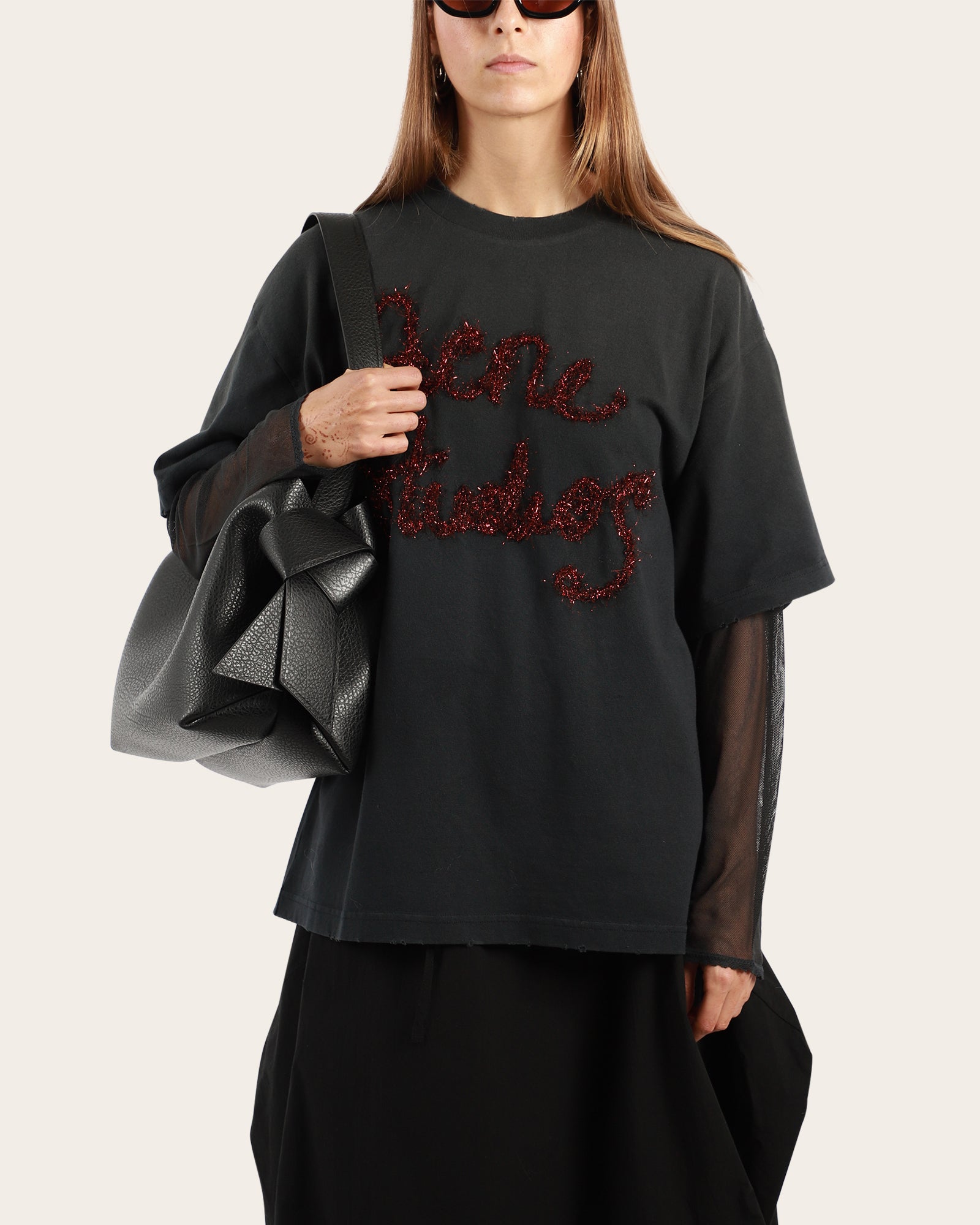 Midi shoulder bag featuring twisted musubi knots on each side, inspired by traditional Japanese obi sashes. Made from textured calf leather and finished with an embossed Acne Studios logo. Includes a central zippered compartment and a discreet magnetic closure for secure storage.