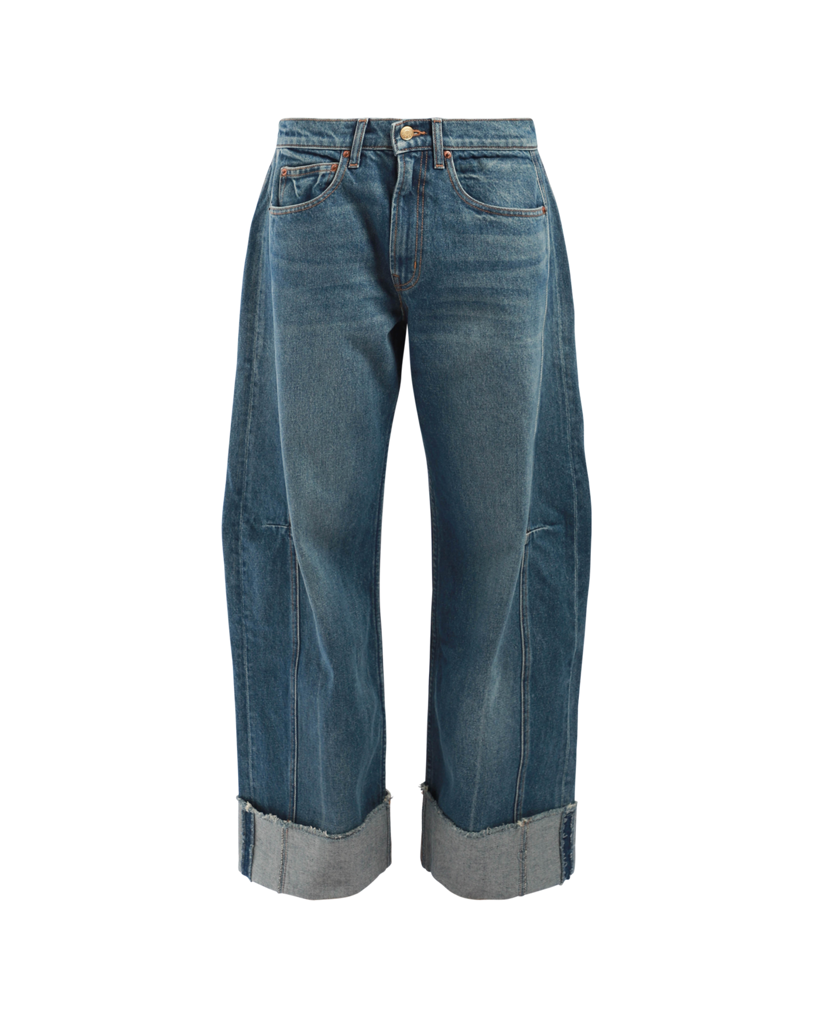 A heavy, cotton-rich denim finished for a relaxed look. Designed to sit at the natural waistline, it features a pieced outseam, kinked leg shape, and cuffed hemline.