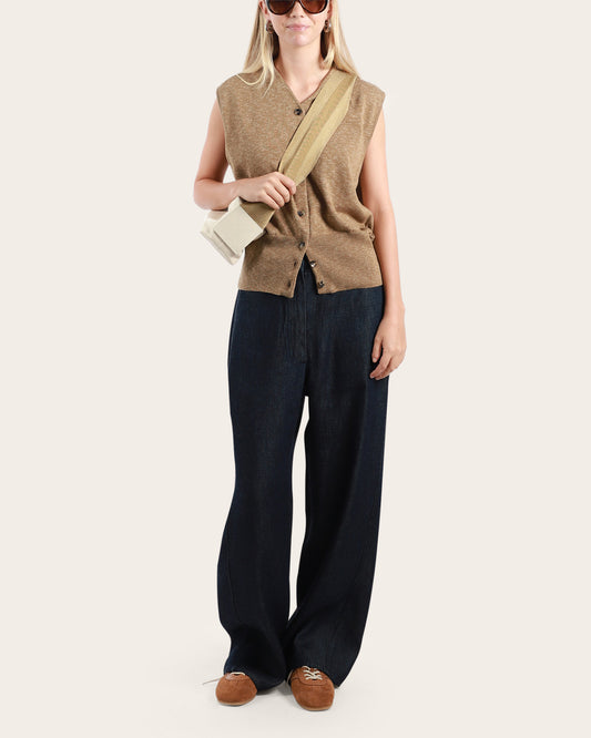 This flecked cotton waistcoat features a regular fit with a relaxed upper silhouette and a defined, high ribbed waistband for a flattering shape. Designed with a V-neckline and button-up front, it has wide arm openings that enhance its ease and comfort.