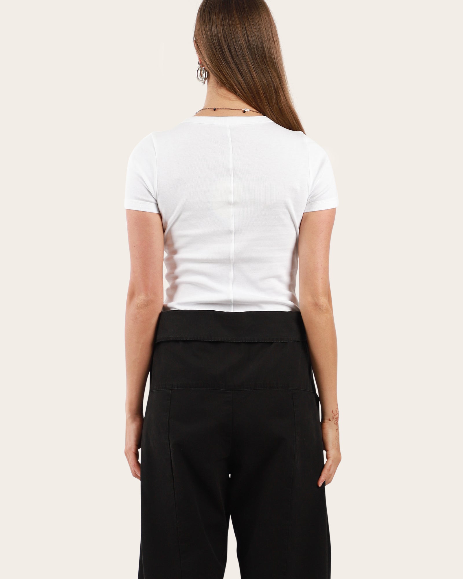 • This fitted tee features extended short sleeves, refined round bindings, and a double-stitched cut-off seam at the back. Made from soft, medium-weight organic cotton rib, it layers effortlessly under a shirt.