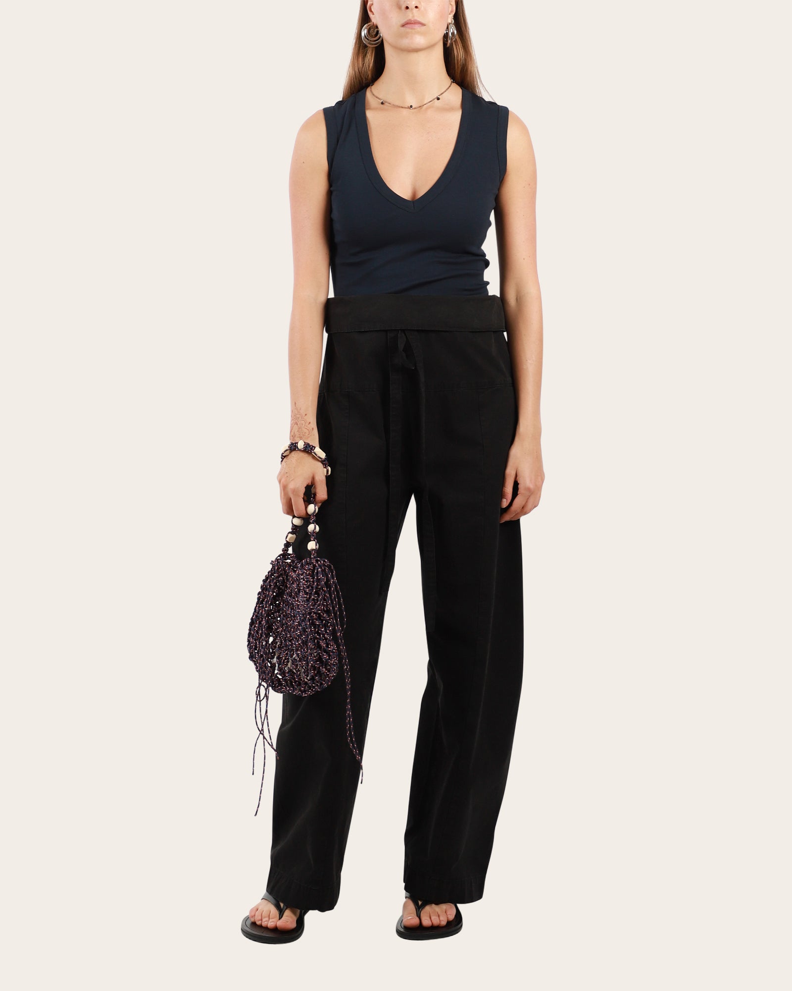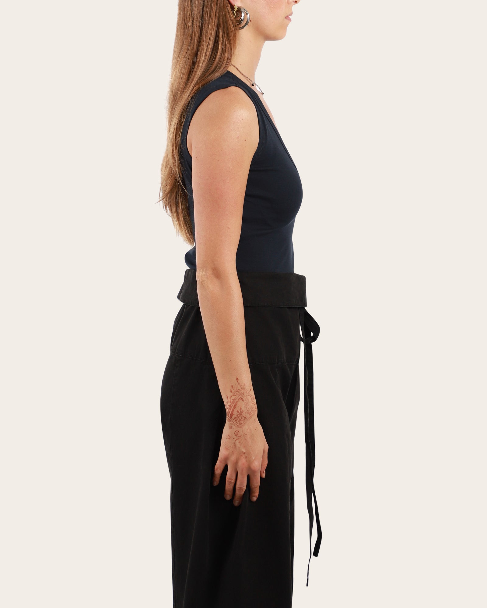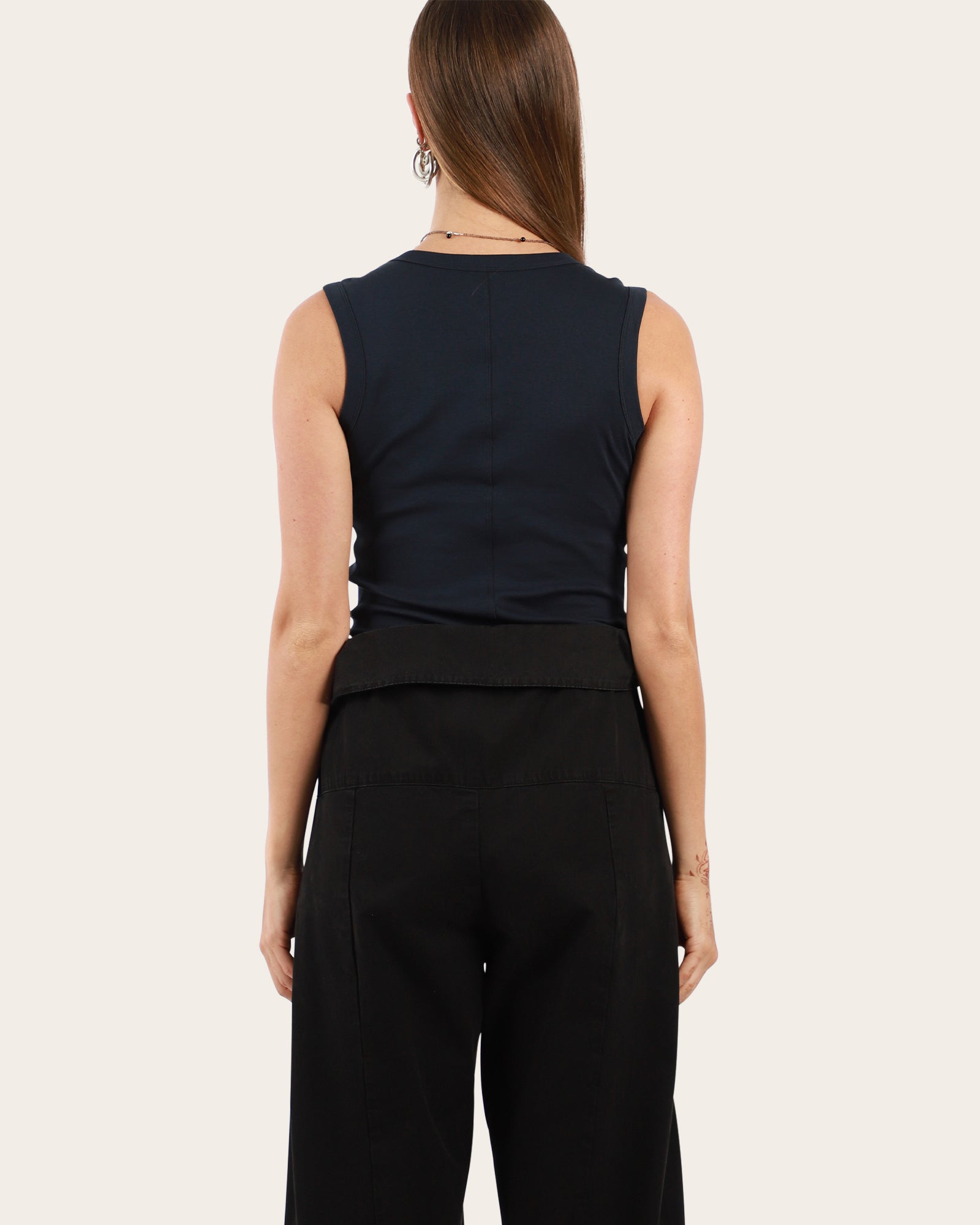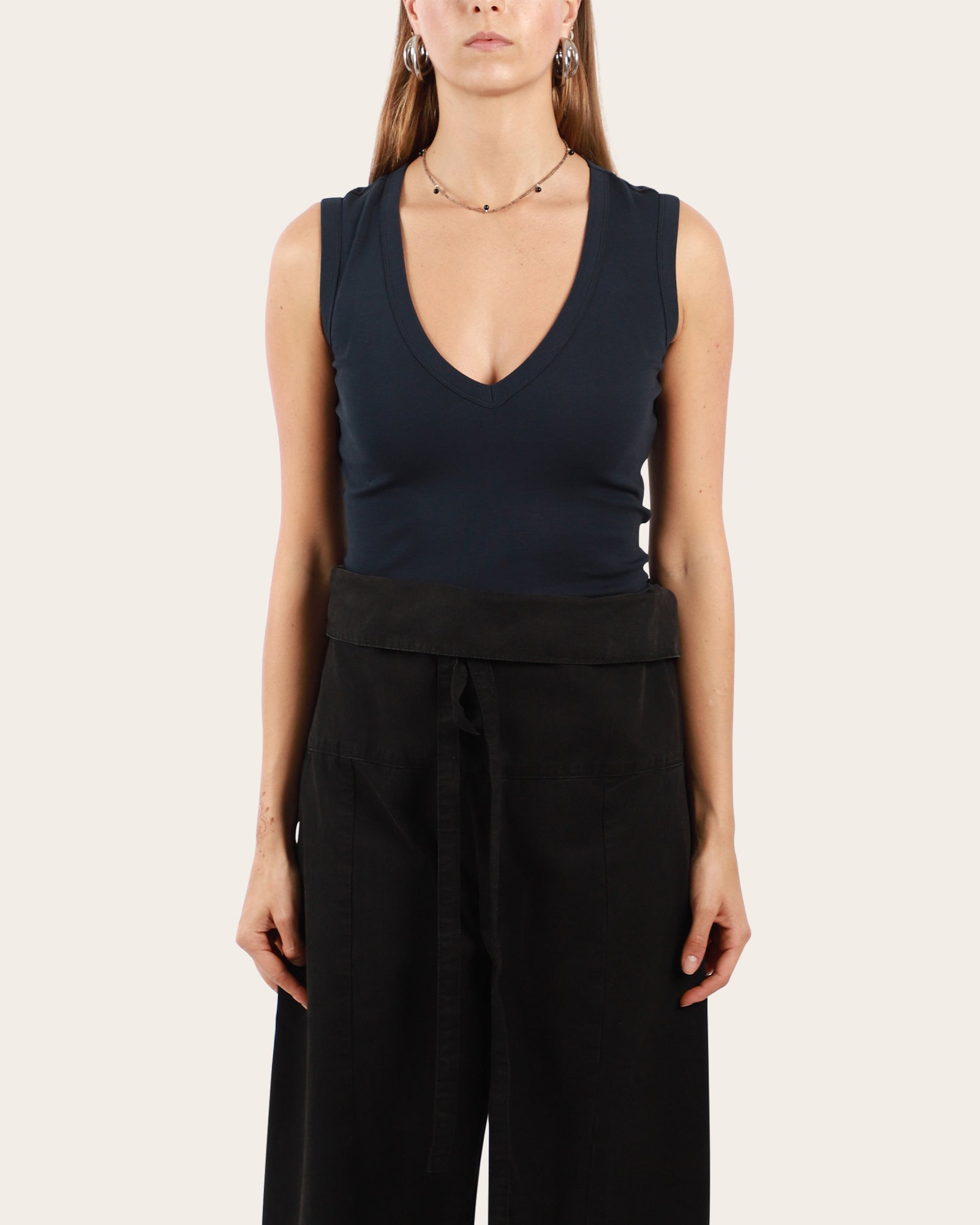 This deep V-neck tank features a refined, modern cut with scooped armholes and a flattering fit. Made from medium-weight organic cotton, it’s designed to layer seamlessly — perfect with a skirt or tailored trousers.