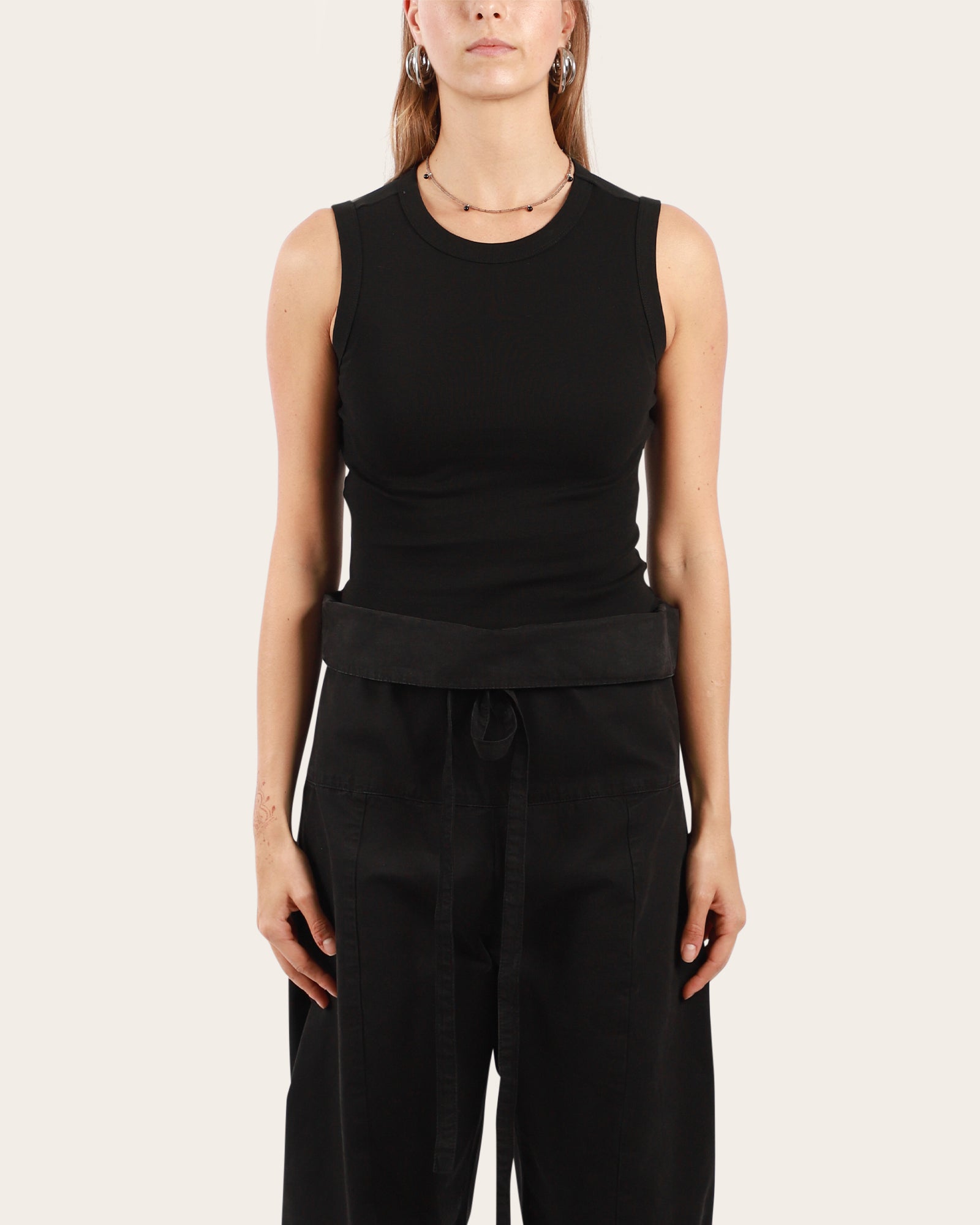 This fitted crew-neck tank features scooped armholes and a subtle cut-off back seam. Made from medium-weight organic cotton rib — effortless on its own or layered.