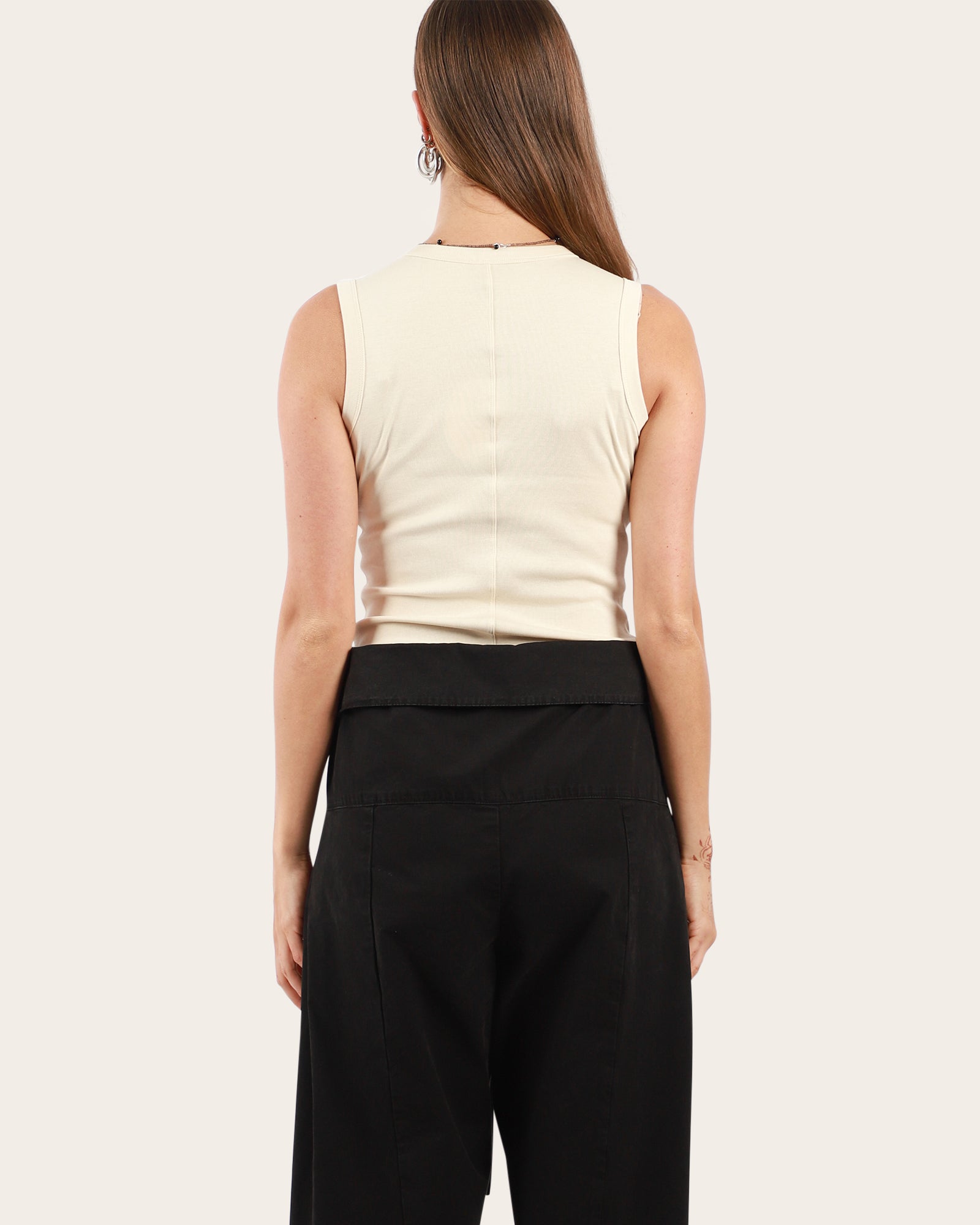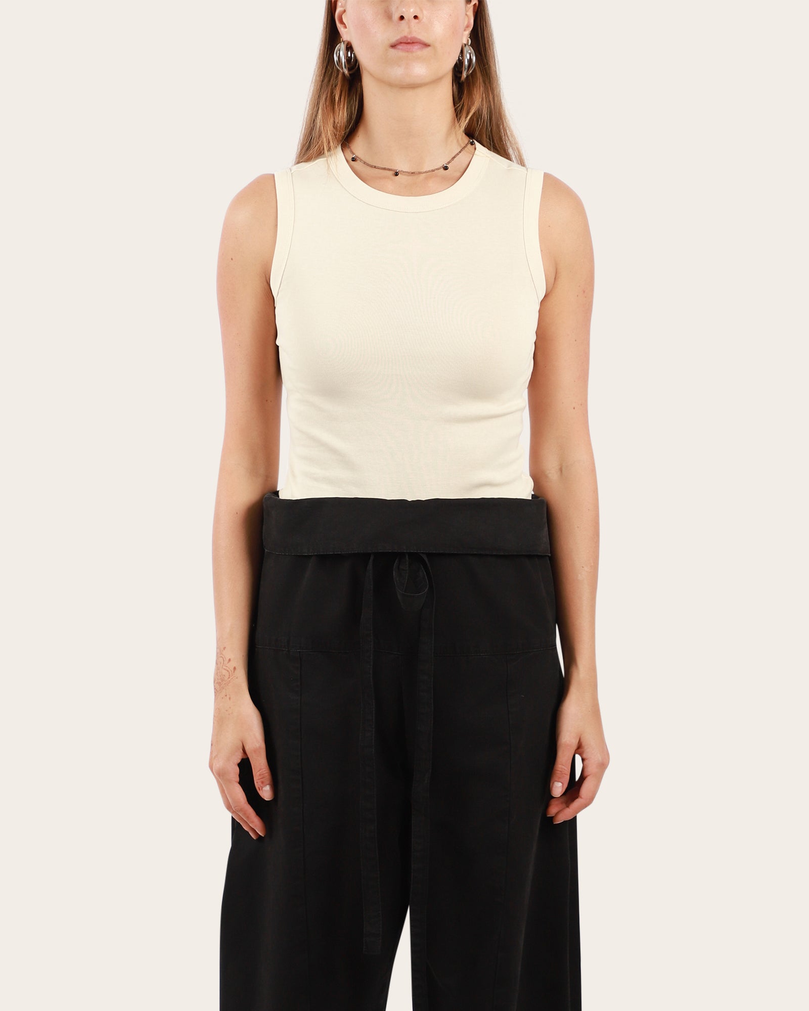 This fitted crew-neck tank features scooped armholes and a subtle cut-off back seam. Made from medium-weight organic cotton rib — effortless on its own or layered.