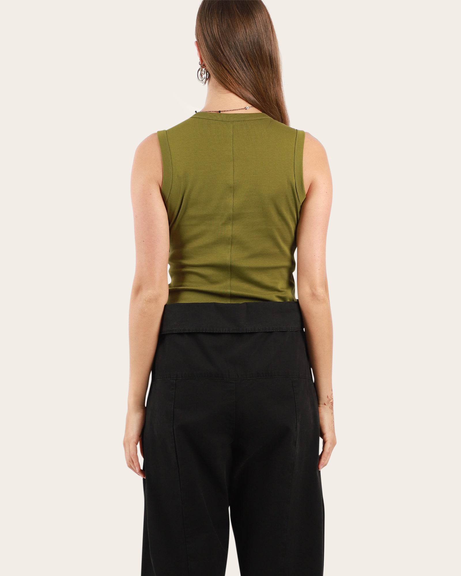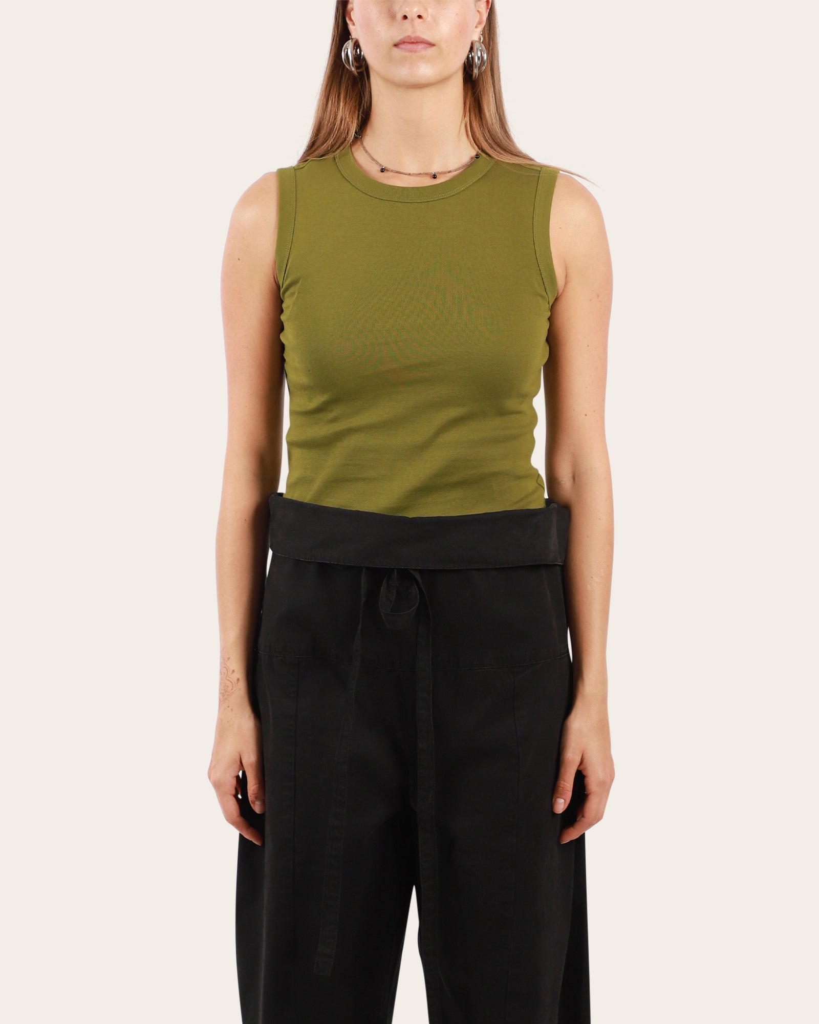 This fitted crew-neck tank features scooped armholes and a subtle cut-off back seam. Made from medium-weight organic cotton rib — effortless on its own or layered.