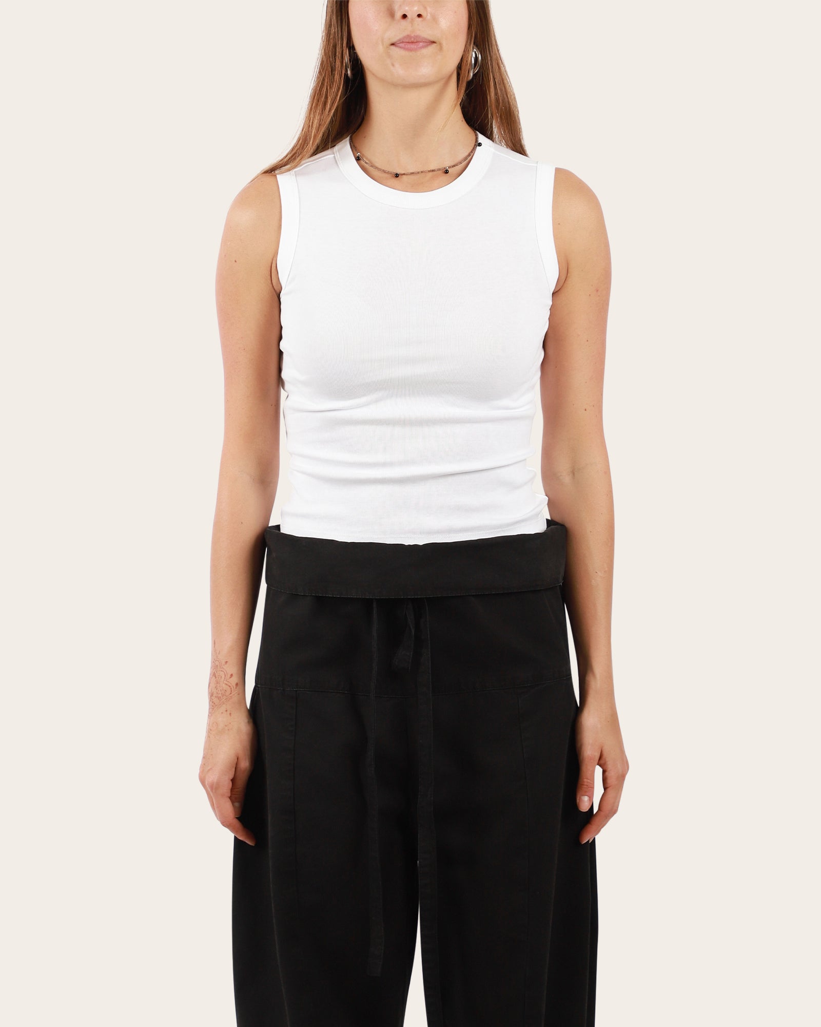 This fitted crew-neck tank features scooped armholes and a subtle cut-off back seam. Made from medium-weight organic cotton rib — effortless on its own or layered.