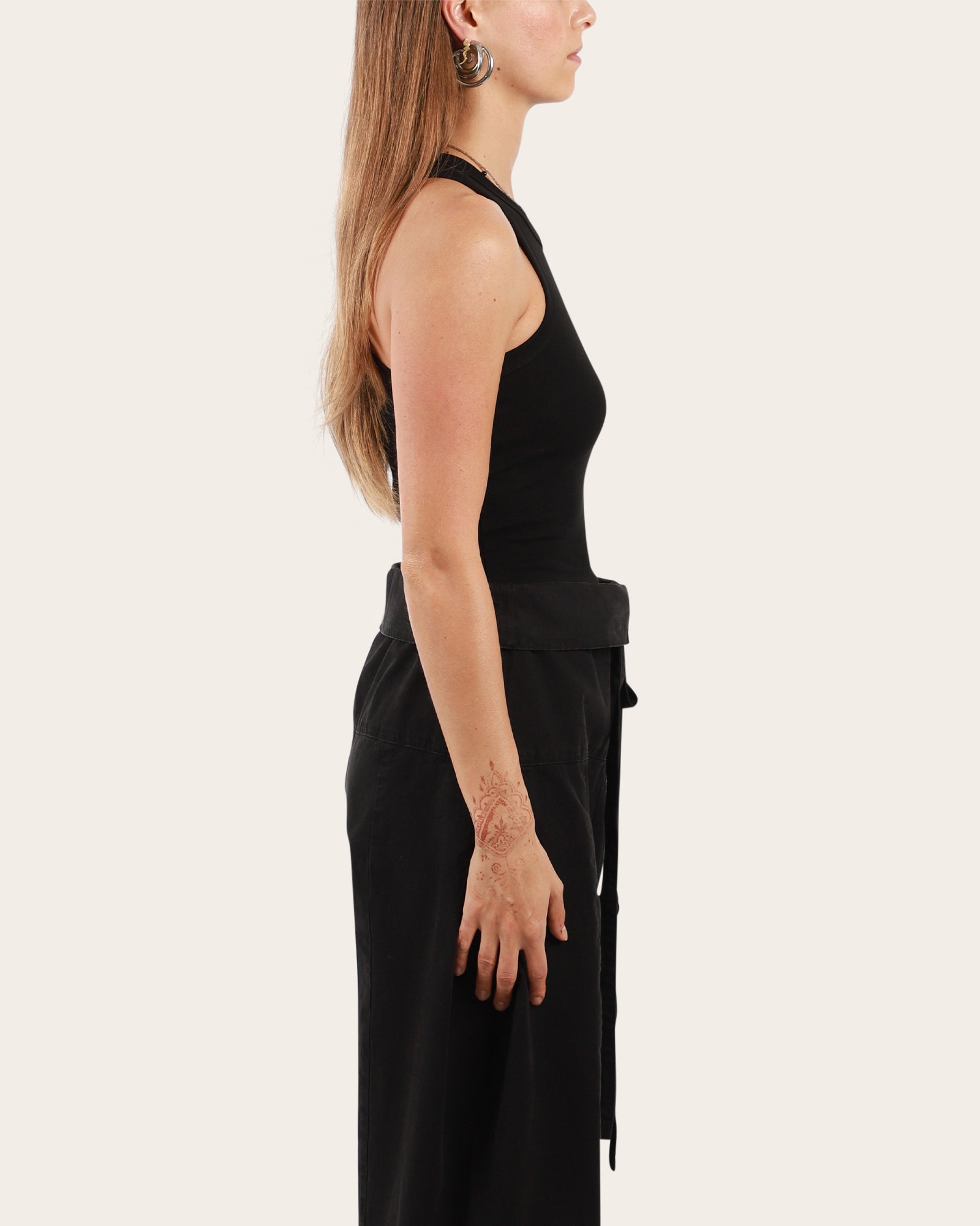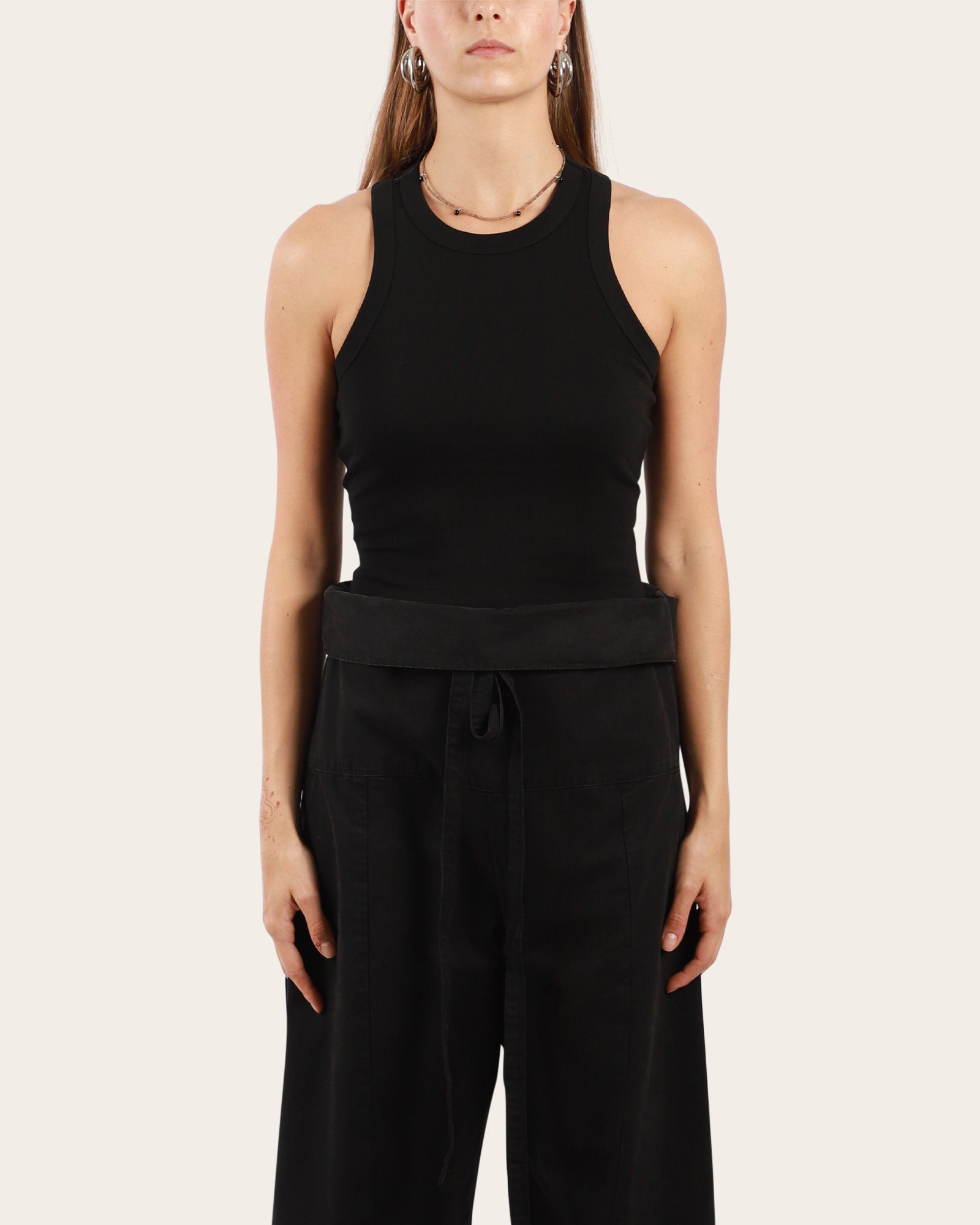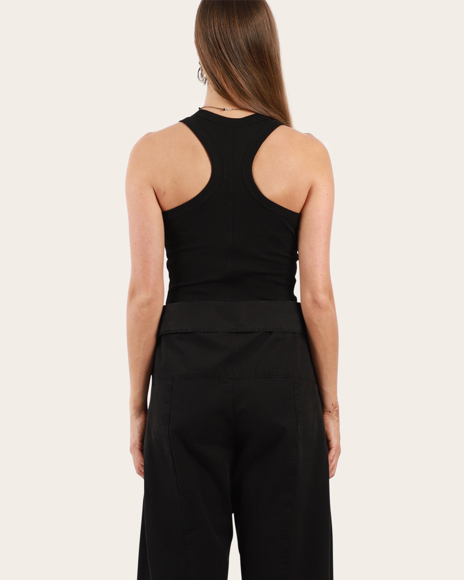 This racerback tank features a subtle cut-off back seam and a streamlined fit. Made from medium-weight organic cotton rib and designed to pair effortlessly with a strapless bra.