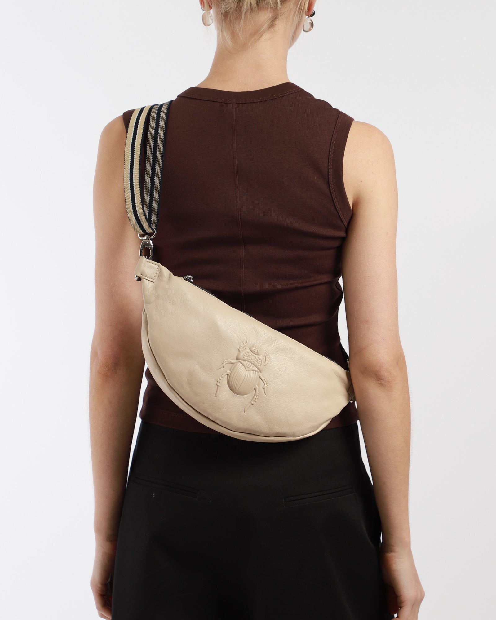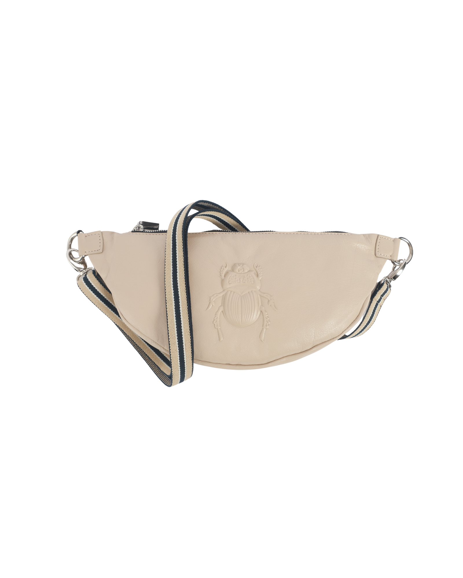 The Scarab Belt Bag is crafted from Italian leather in Italy. It features an adjustable strap that can be worn crossbody or around the waist and is accented with a bold scarab detail on the front.