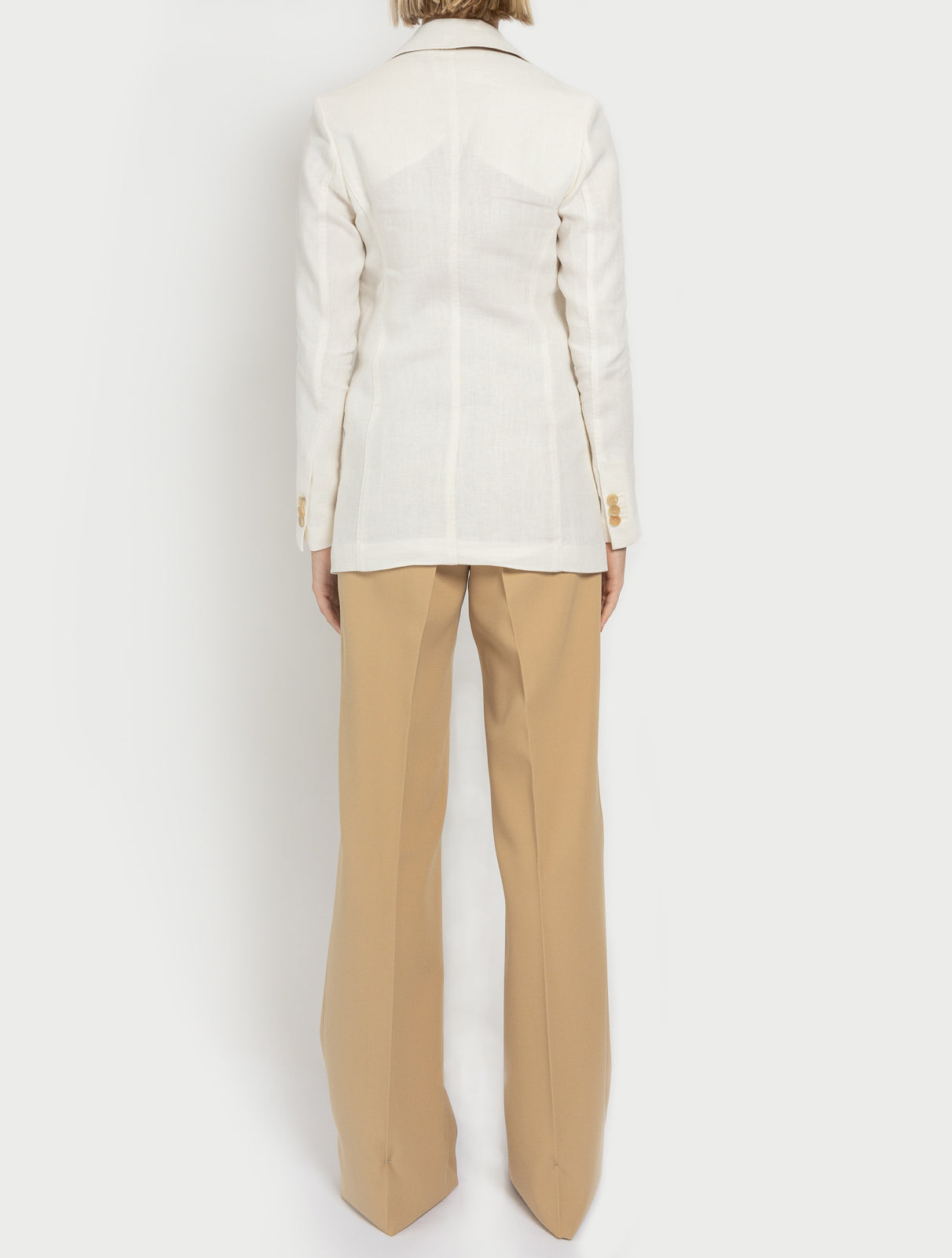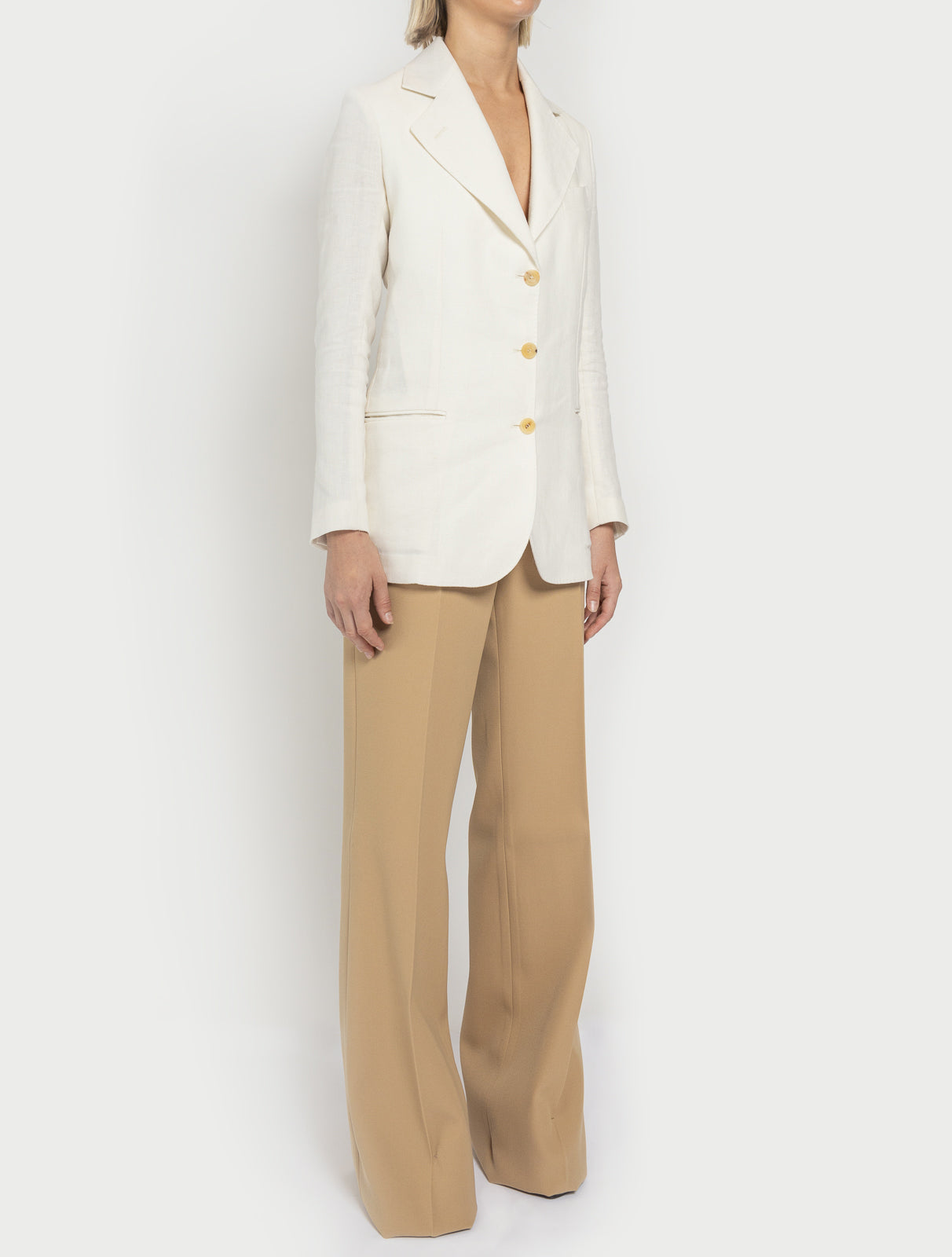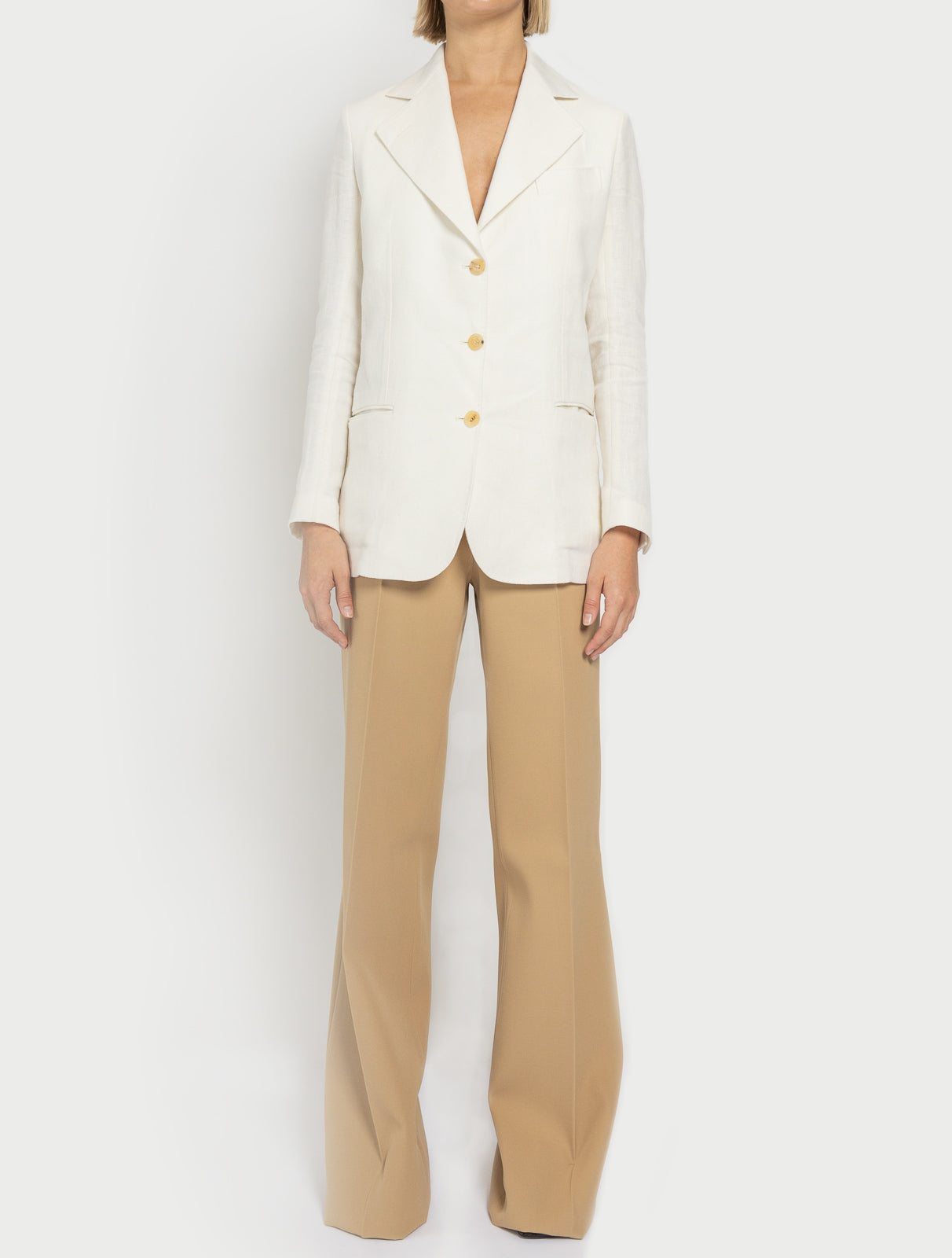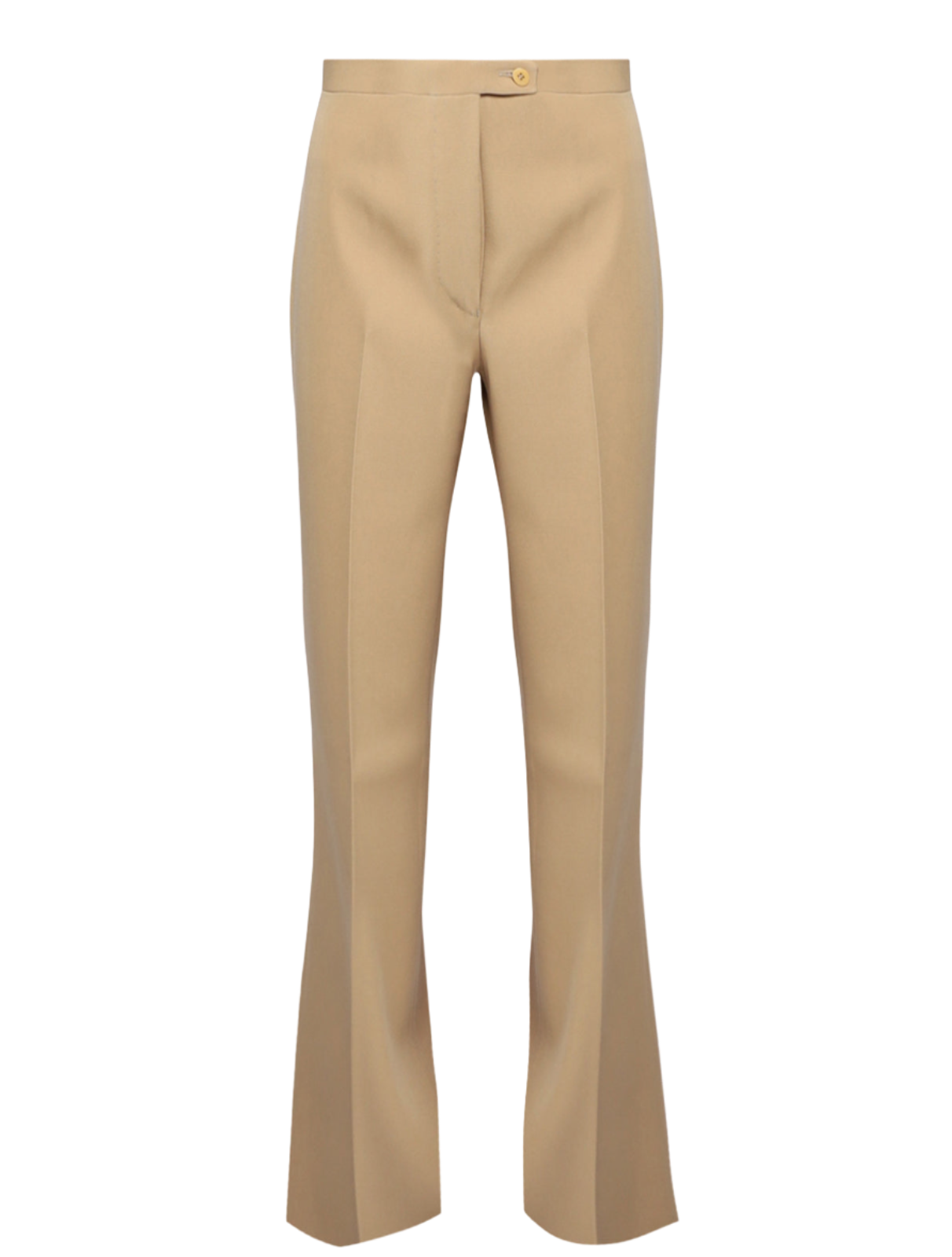 Giuliva Heritage Laura trousers in fine virgin wool, featuring skillfully handcrafted style with high-cut waist, fitted through waist and hip, slim fit over thigh and flared from knee, pressed-crease legs, pants close at front with concealed buttons. Legs are left unhemmed for a personalised fit.