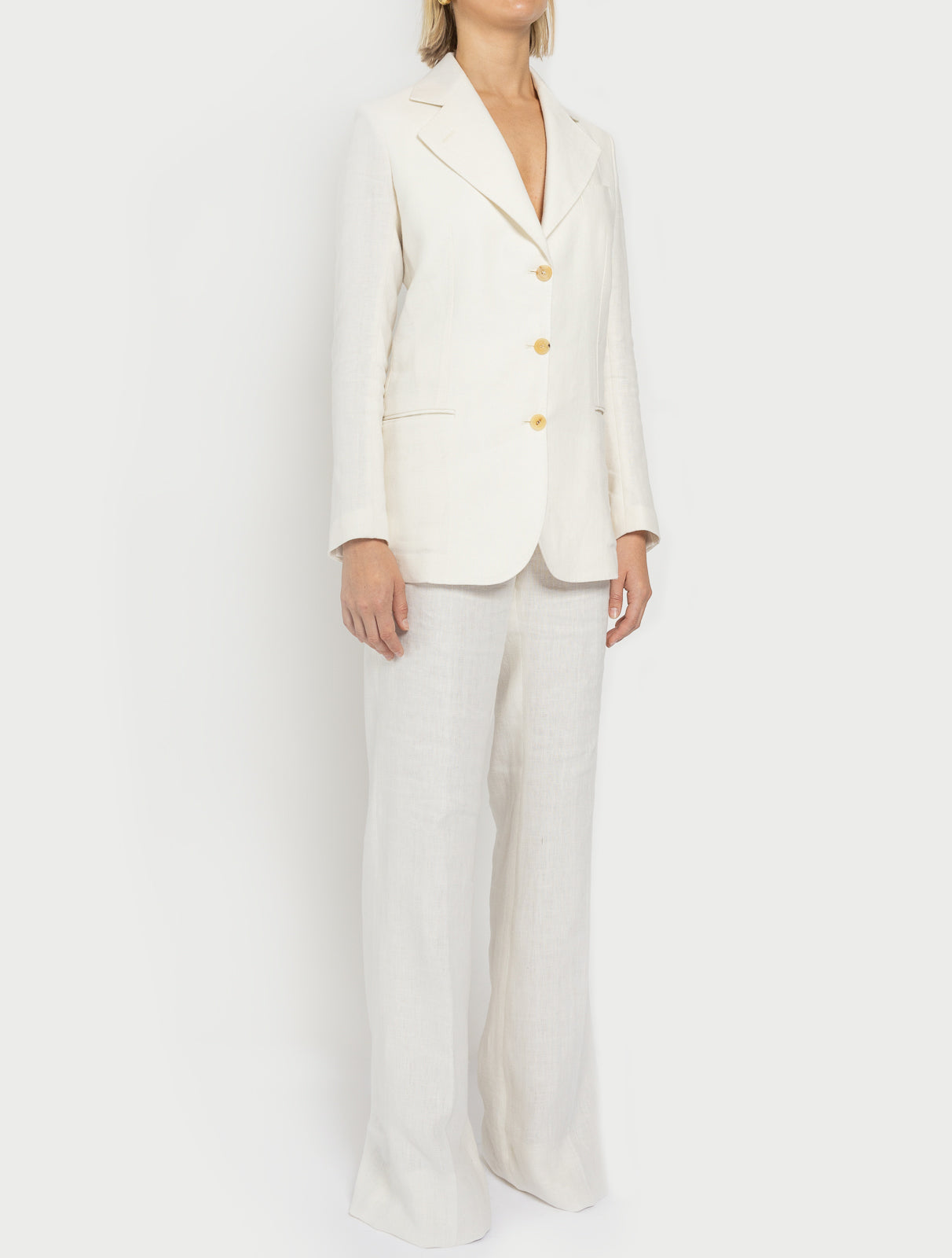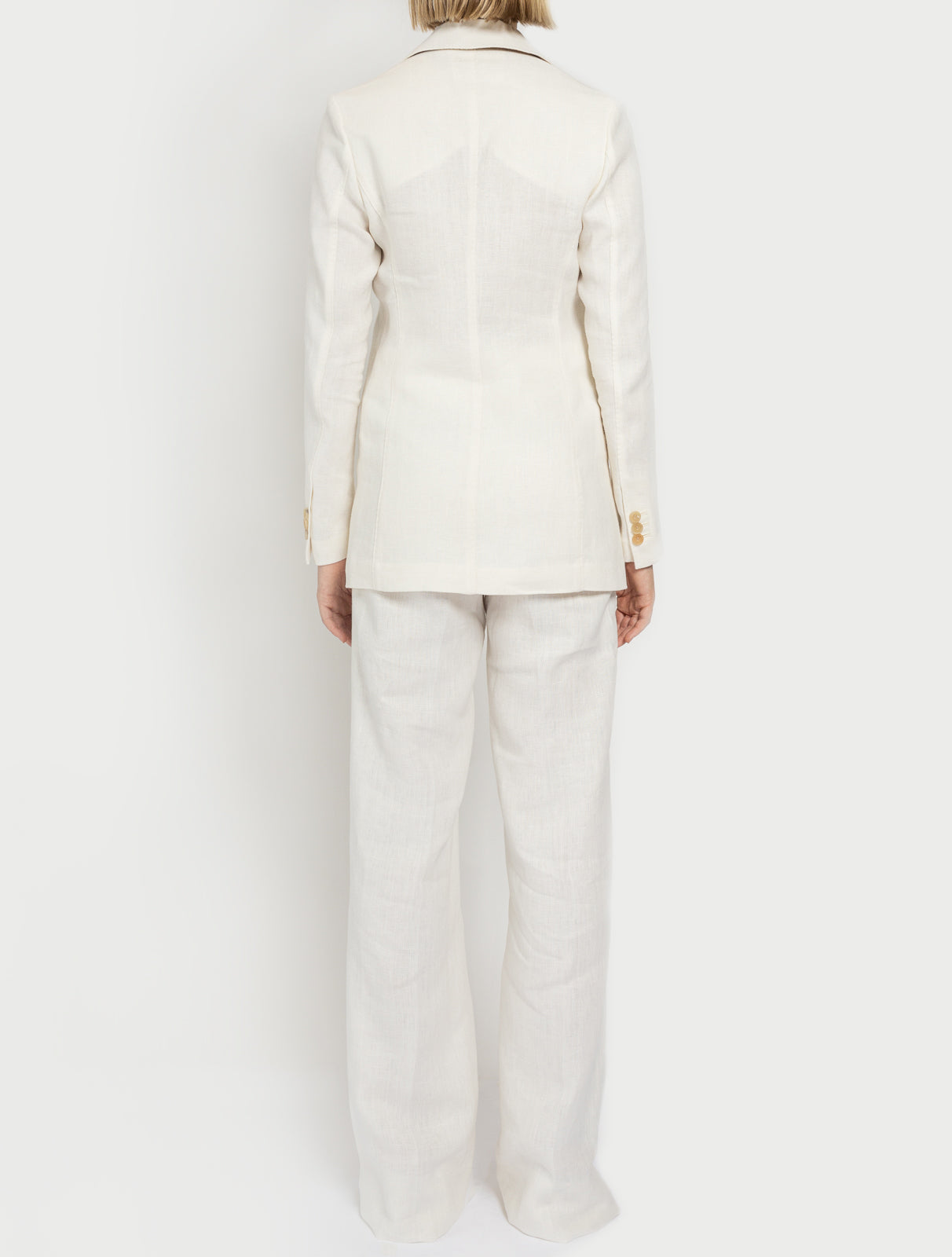 Giuliva Heritage Laura trousers in woven linen, featuring skillfully handcrafted style with high-cut waist, fitted through waist and hip, slim fit over thigh and flared from knee, pressed-crease legs, pants close at front with concealed buttons. Legs are left unhemmed for a personalised fit.
