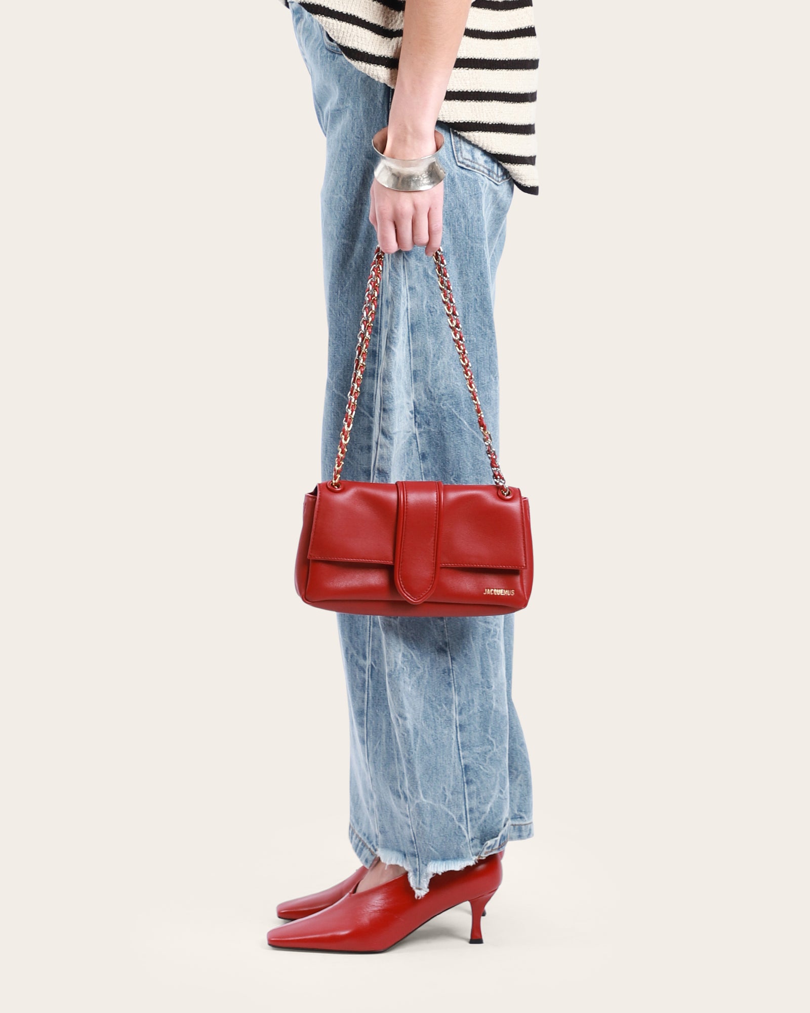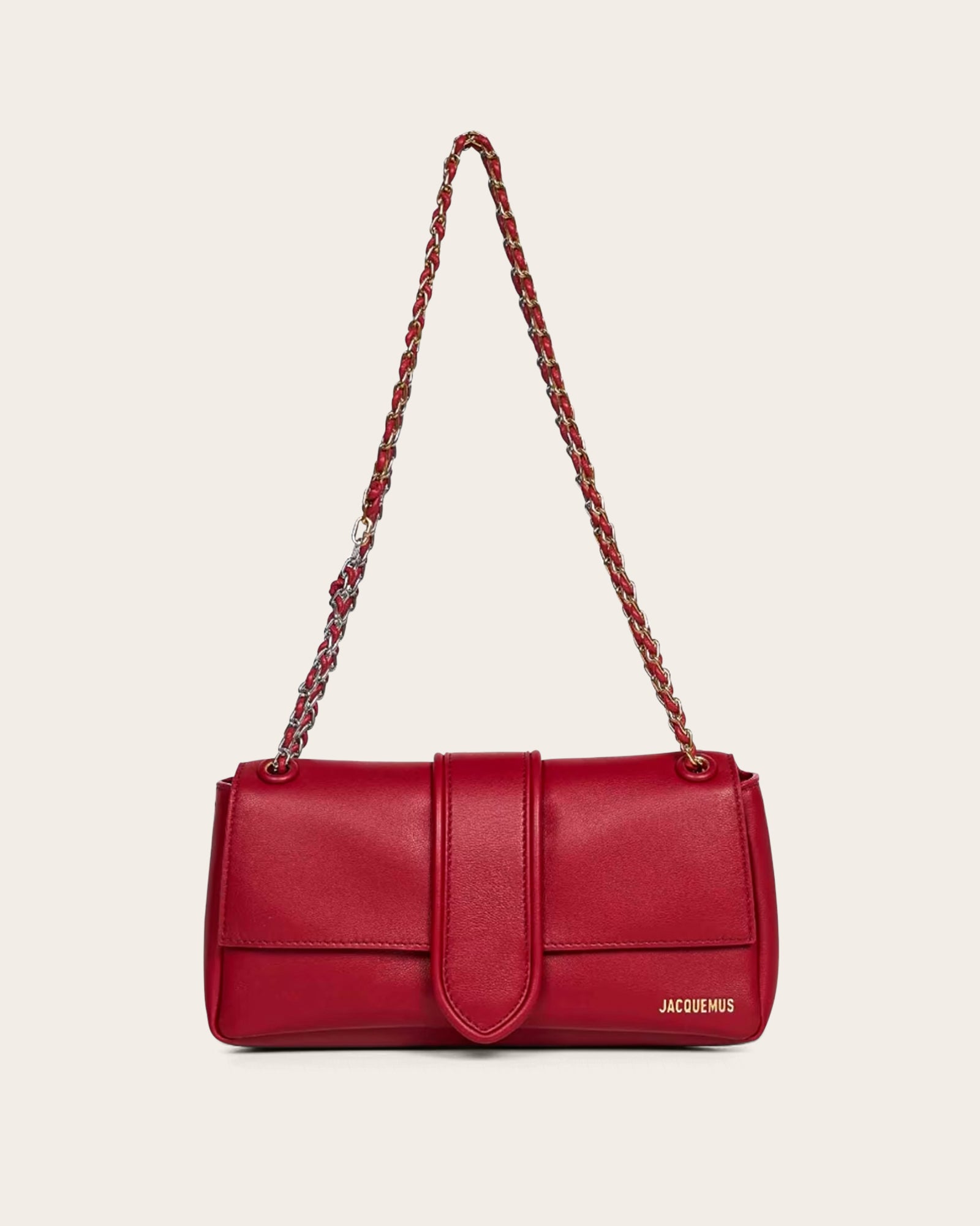 Elegant and versatile, this soft bag is crafted from supple nappa leather for a luxurious feel. It features a silver and gold metal chain braided with leather for a sophisticated, statement-making strap.