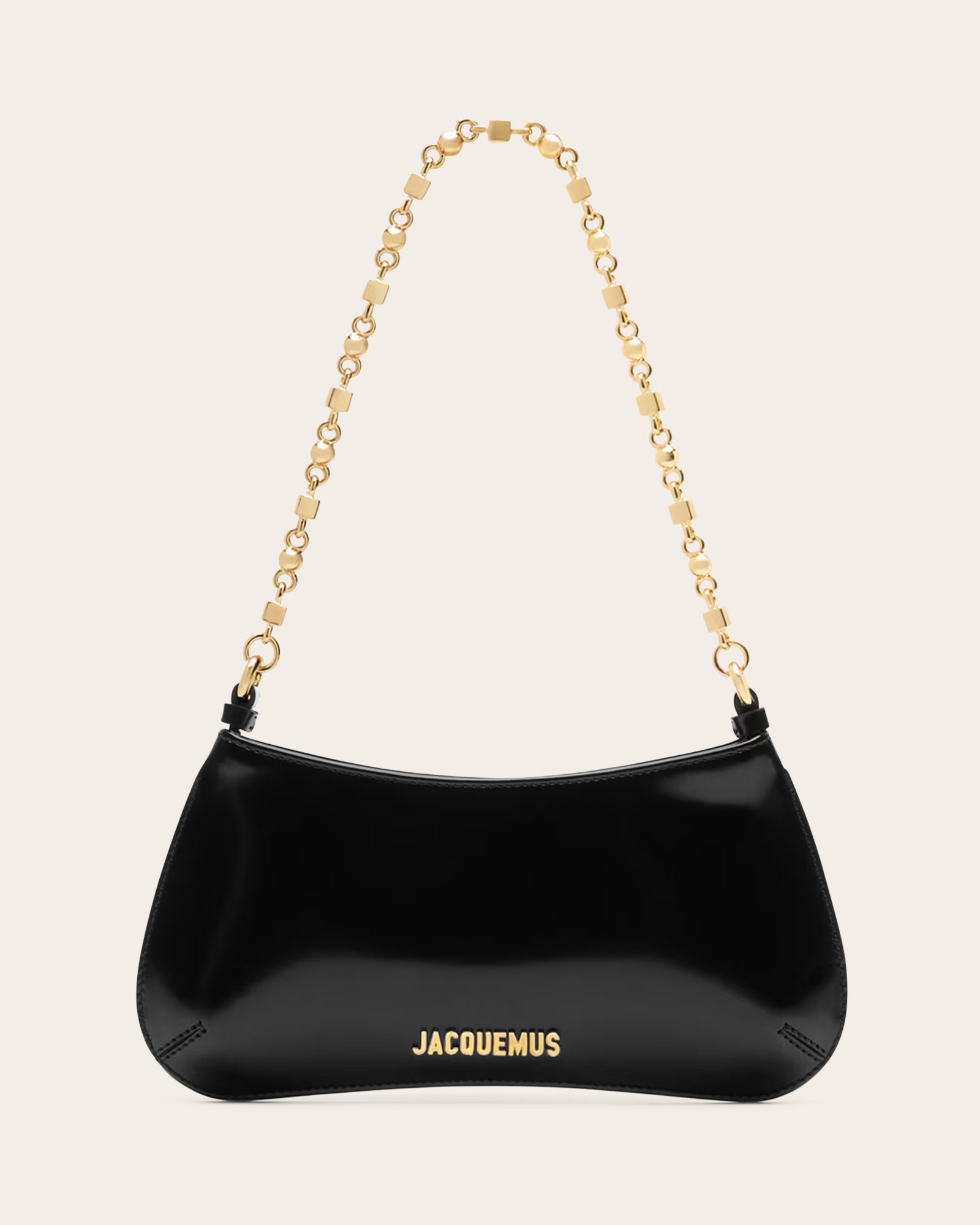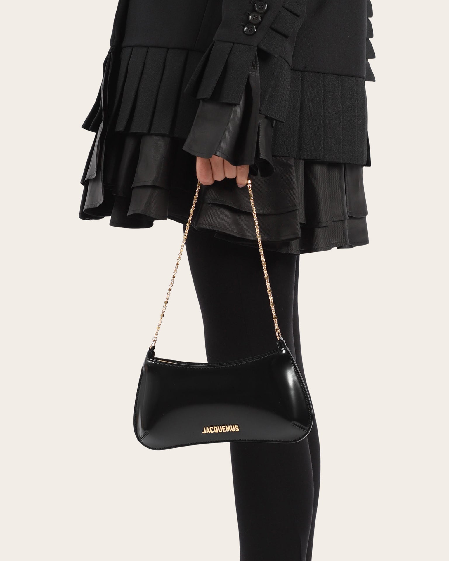 This small, structured bag is crafted from polished spazzolato leather for a sleek, refined finish. It features a gold-tone chain shoulder strap and matching logo hardware for a touch of elegance. The interior includes a convenient patch pocket, while a zip closure keeps essentials secure. Compact yet functional, it measures 23.5 cm x 11.5 cm. Made in Italy.