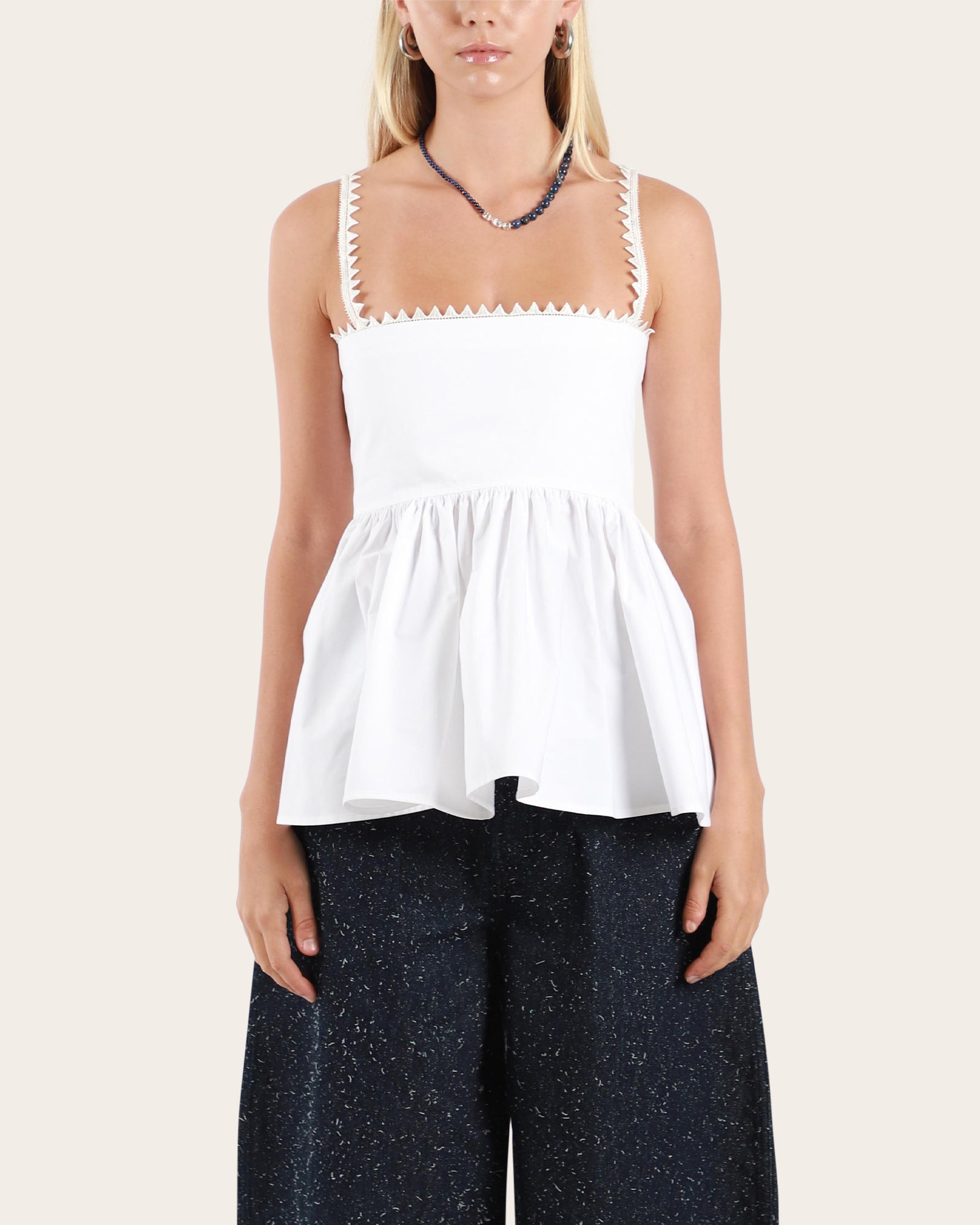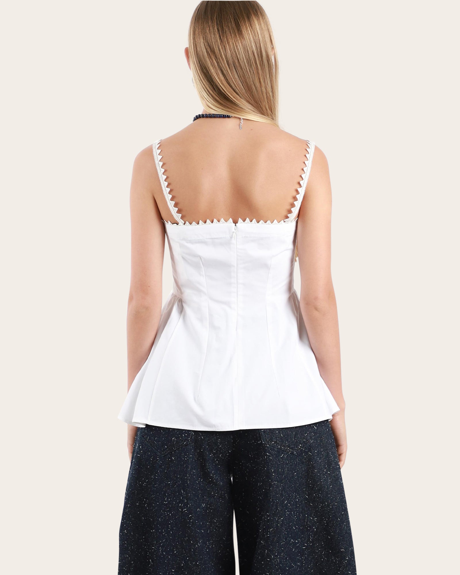 Designed with a fitted bust, this piece is crafted from compact cotton poplin for a crisp, structured feel. It features woven triangle straps and coordinating trim for a distinctive touch, while a flared peplum adds soft volume and shape. An invisible back zipper ensures a seamless finish.