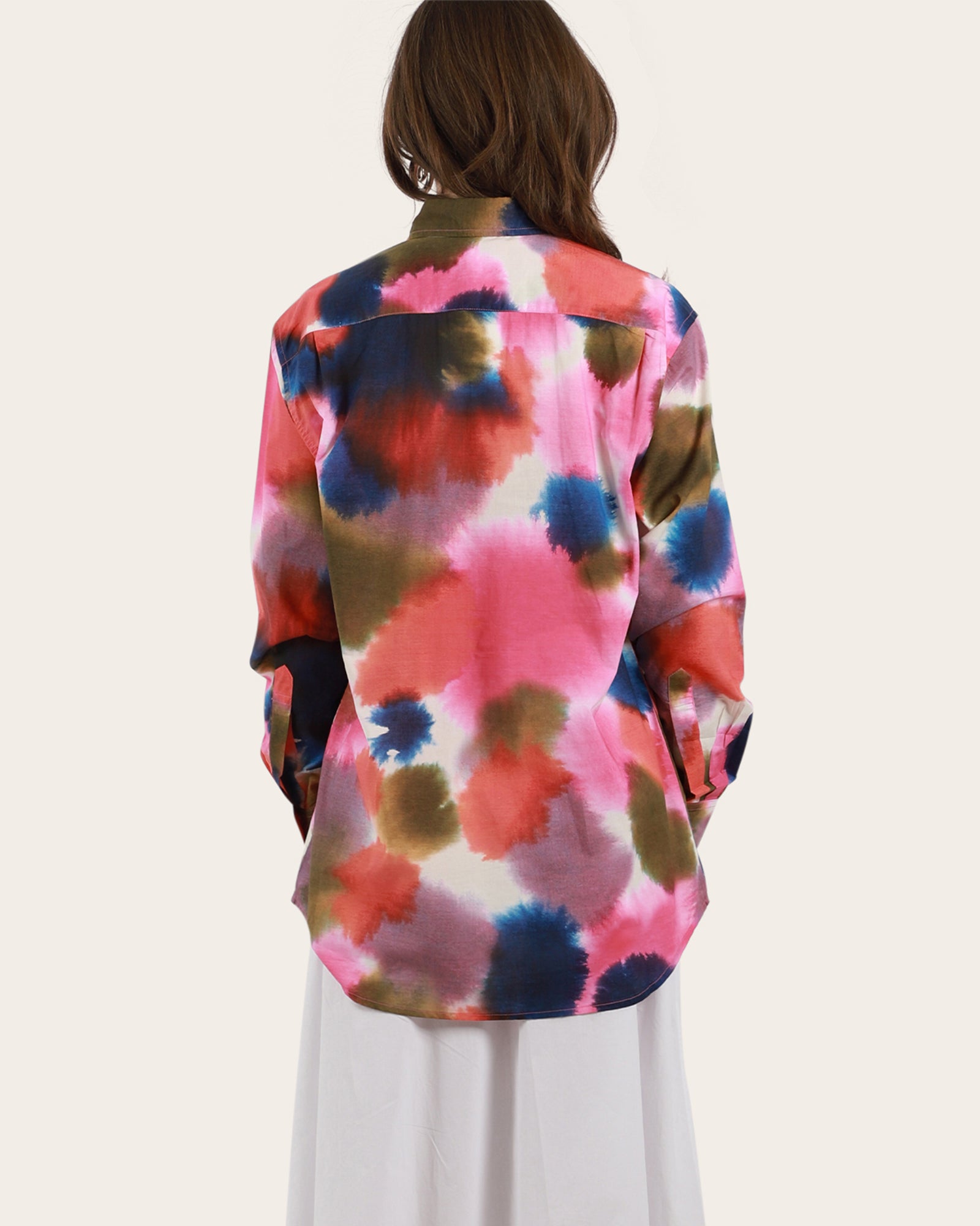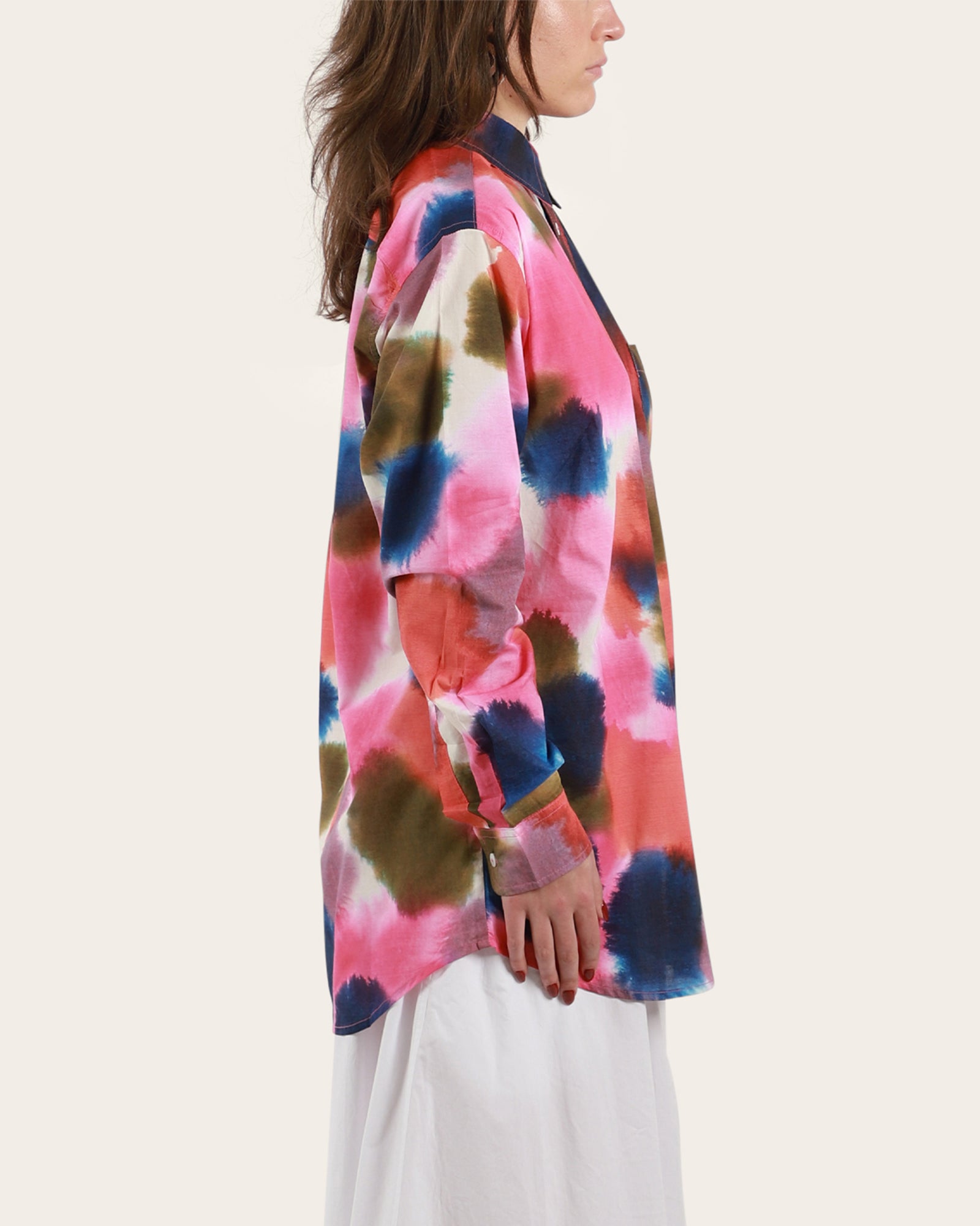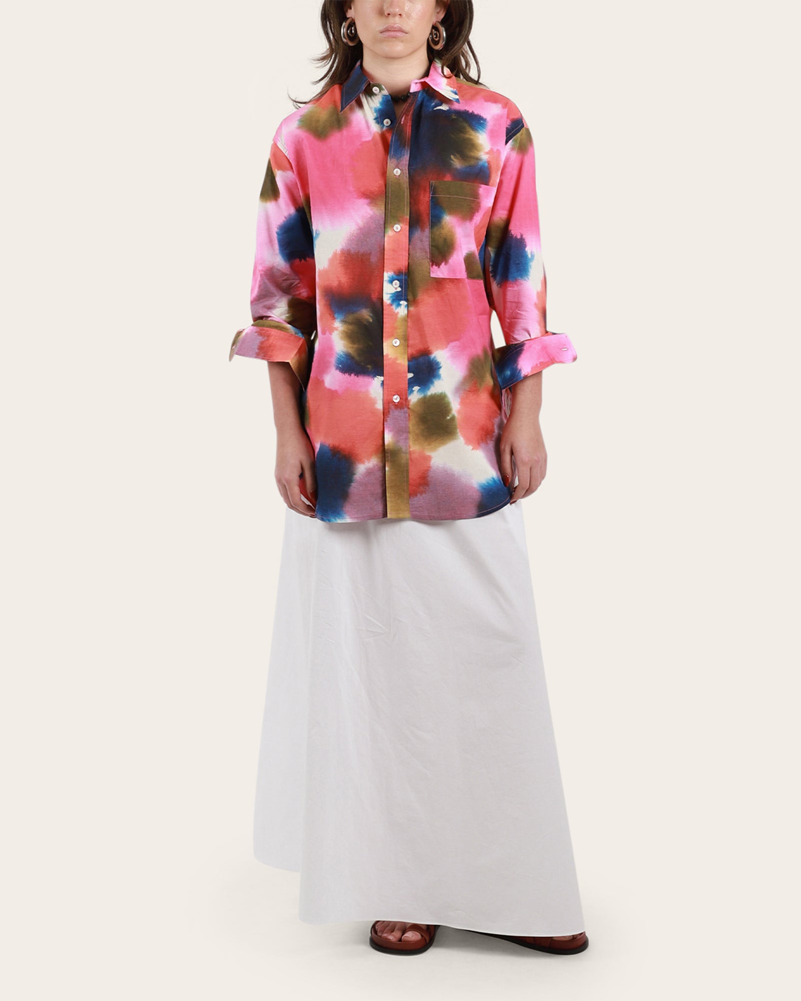 This effortlessly oversized men’s-style shirt is crafted from airy organic cotton voile and adorned with our hand-painted Watercolour print. Detailed with a classic collar, buttoned cuffs, and a front patch pocket, it’s finished with nut buttons for a natural, artisanal touch.