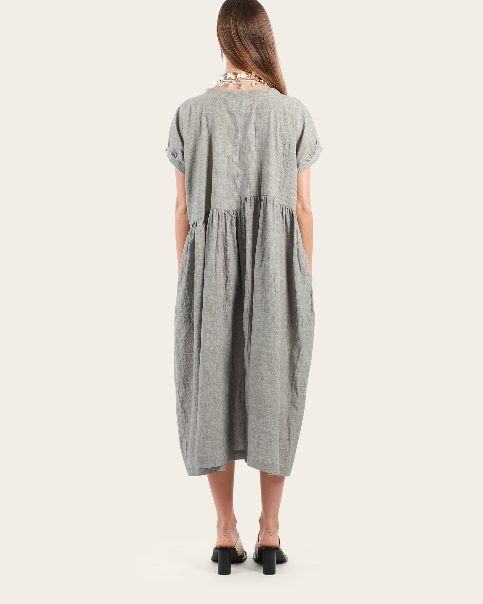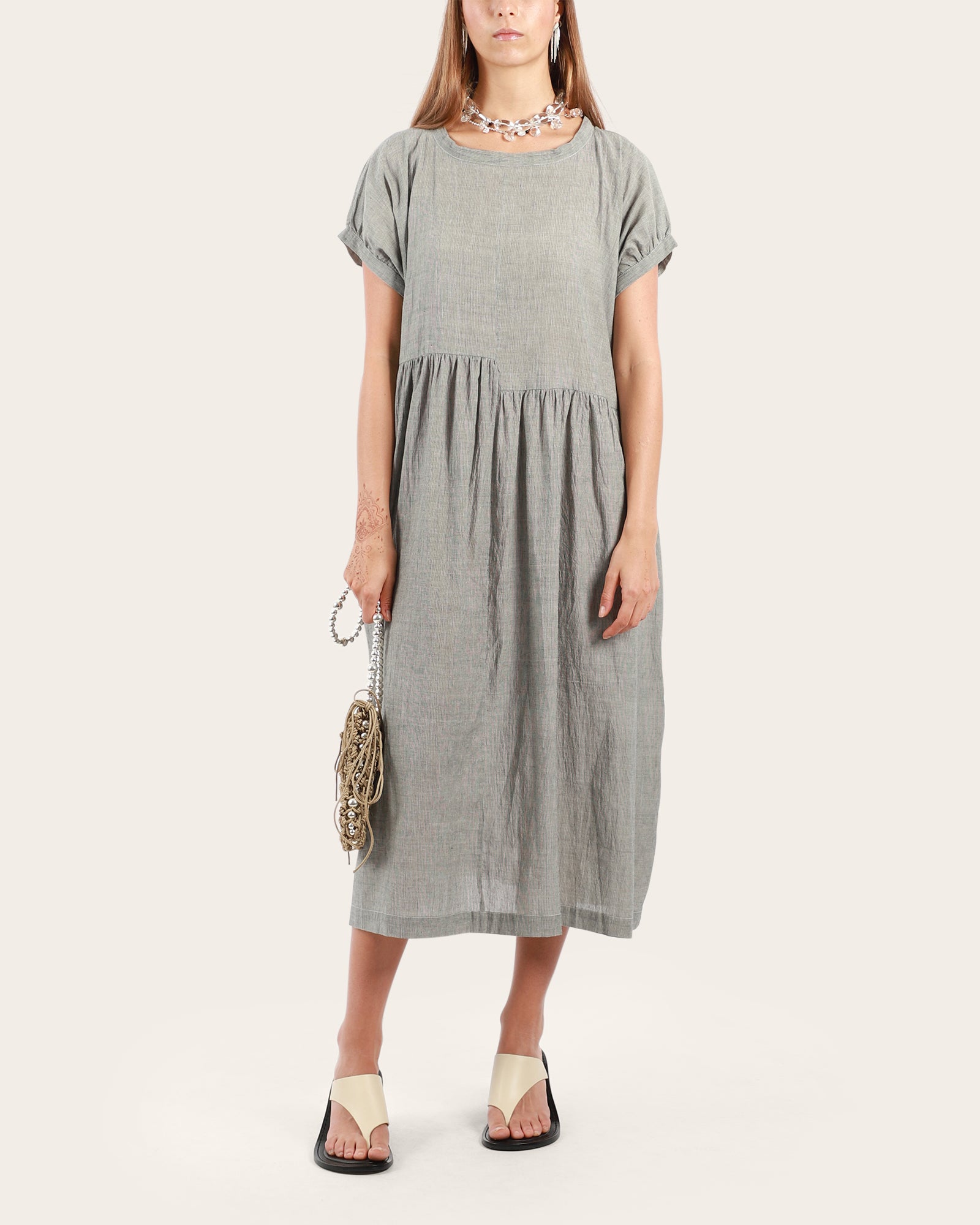A midi dress, featuring a round neckline, short sleeves, asymmetrical gathers at front and back, giving some movement to the garment.
