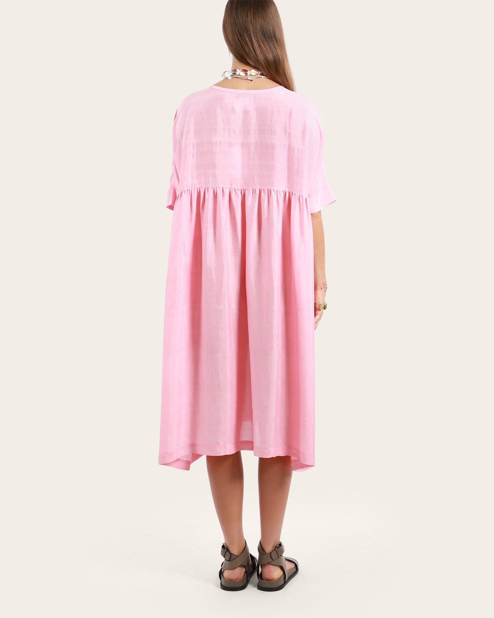 A lightweight midi dress, featuring a round neckline, short sleeves, gathered detail at waistline, regular silhouette.