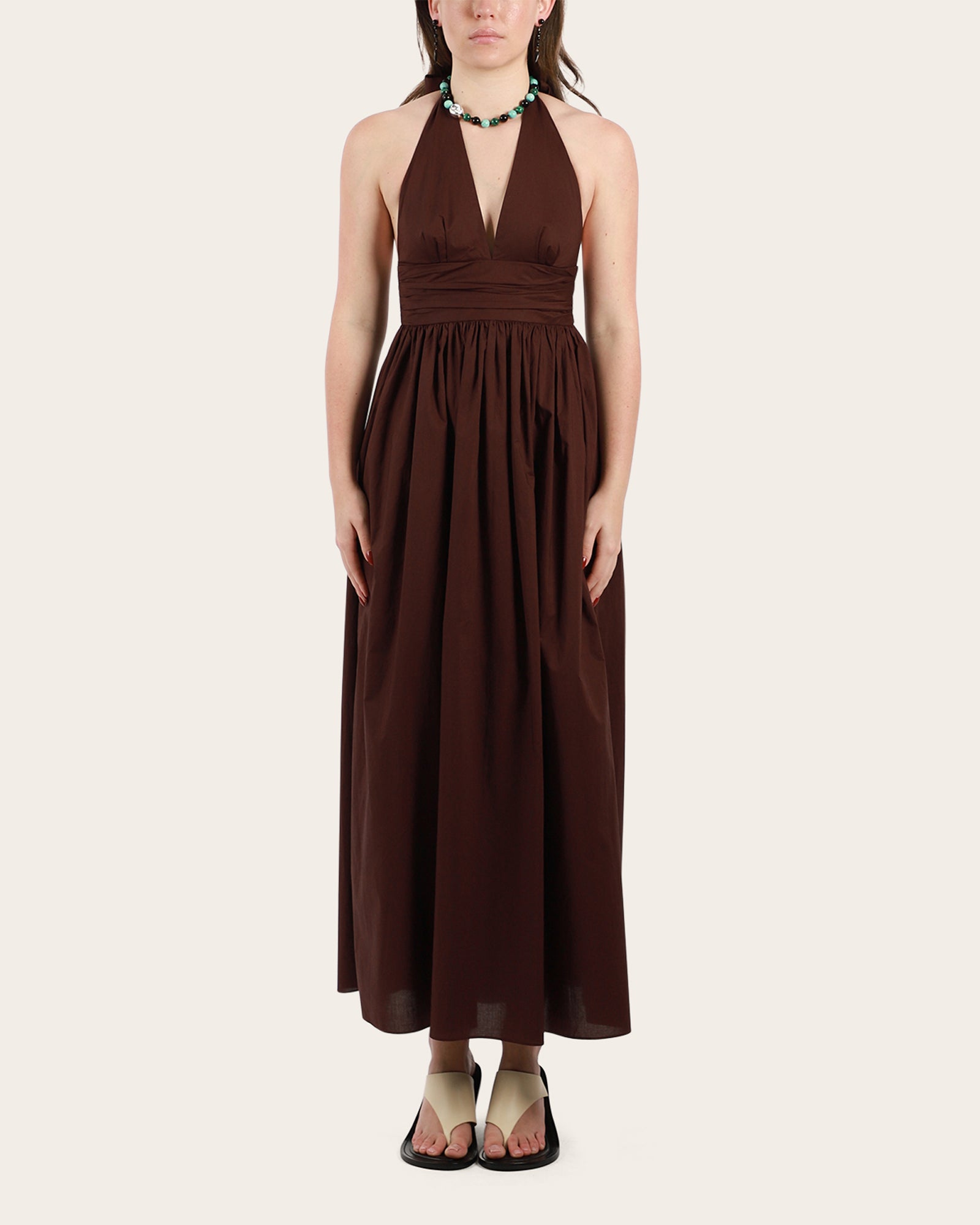 Meet the Plunge Halter Dress, crafted from soft organic cotton. Designed with a flattering fitted bodice, an elongated neck tie, and a graceful low back, this dress effortlessly combines elegance and ease. Pair it with strappy sandals for a refined, polished look that’s perfect for any occasion.