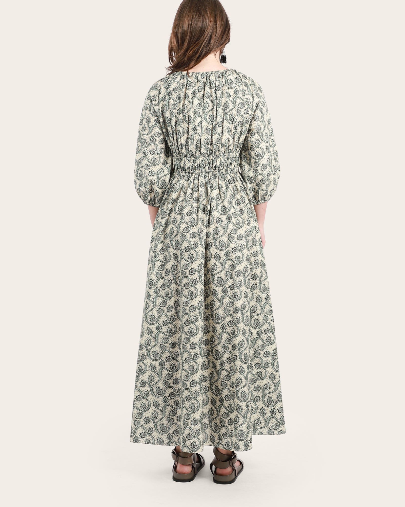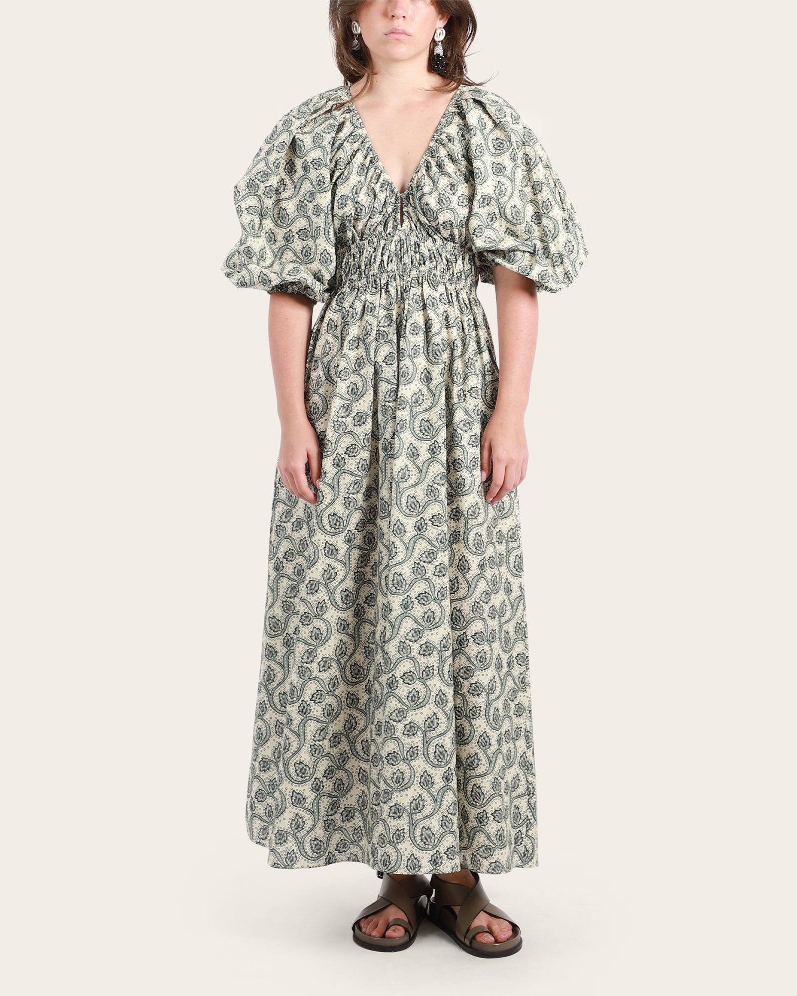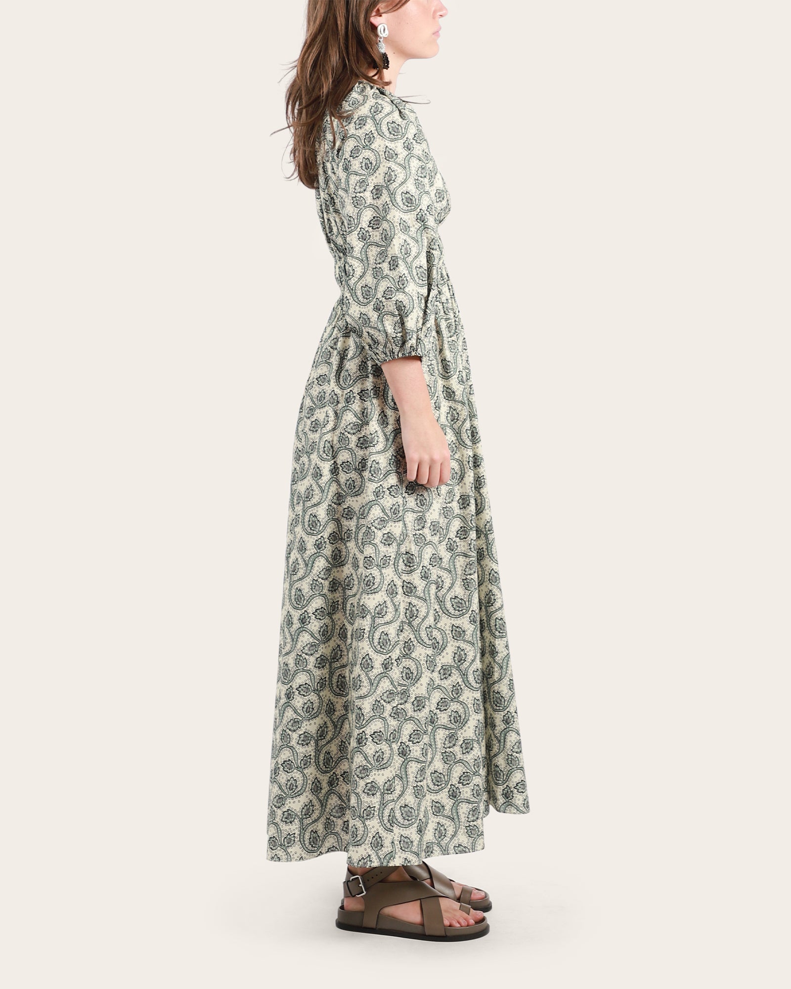A comfortable and flattering midi dress designed with three-quarter voluminous sleeves finished with elasticated hems, plus a deep V-neckline with a single button-and-loop closure. Inseam hip pockets add effortless ease and practicality. Pair it with a strappy sandal for the perfect summer look.