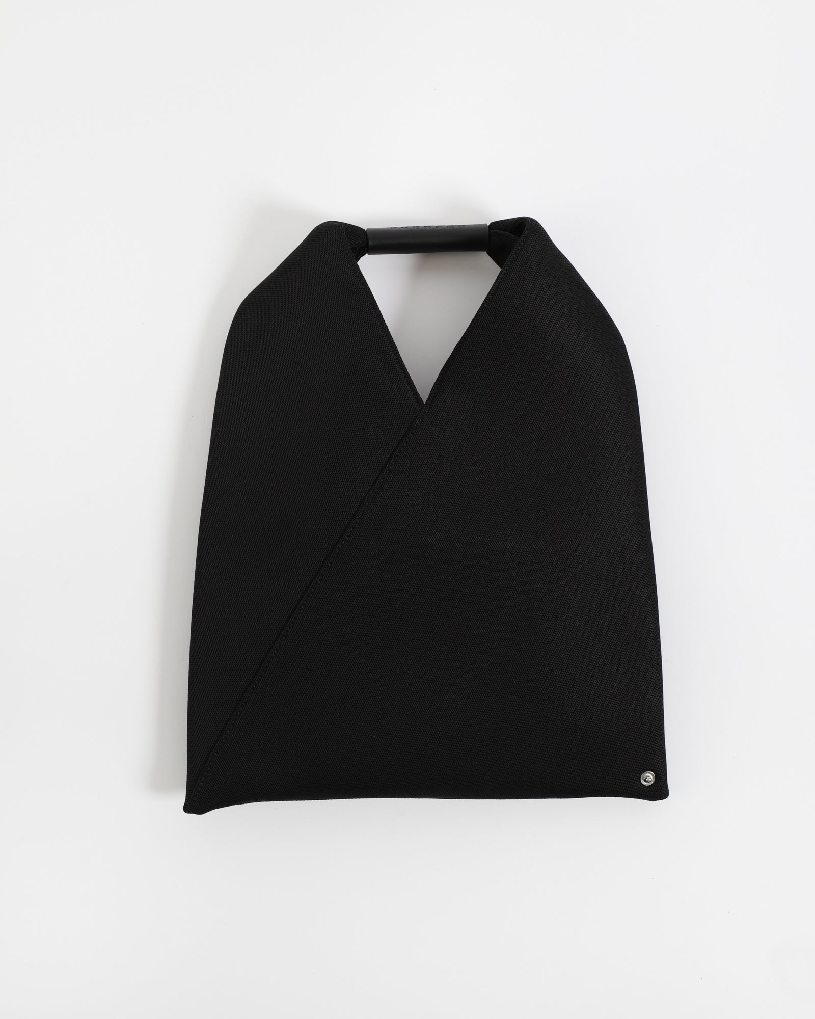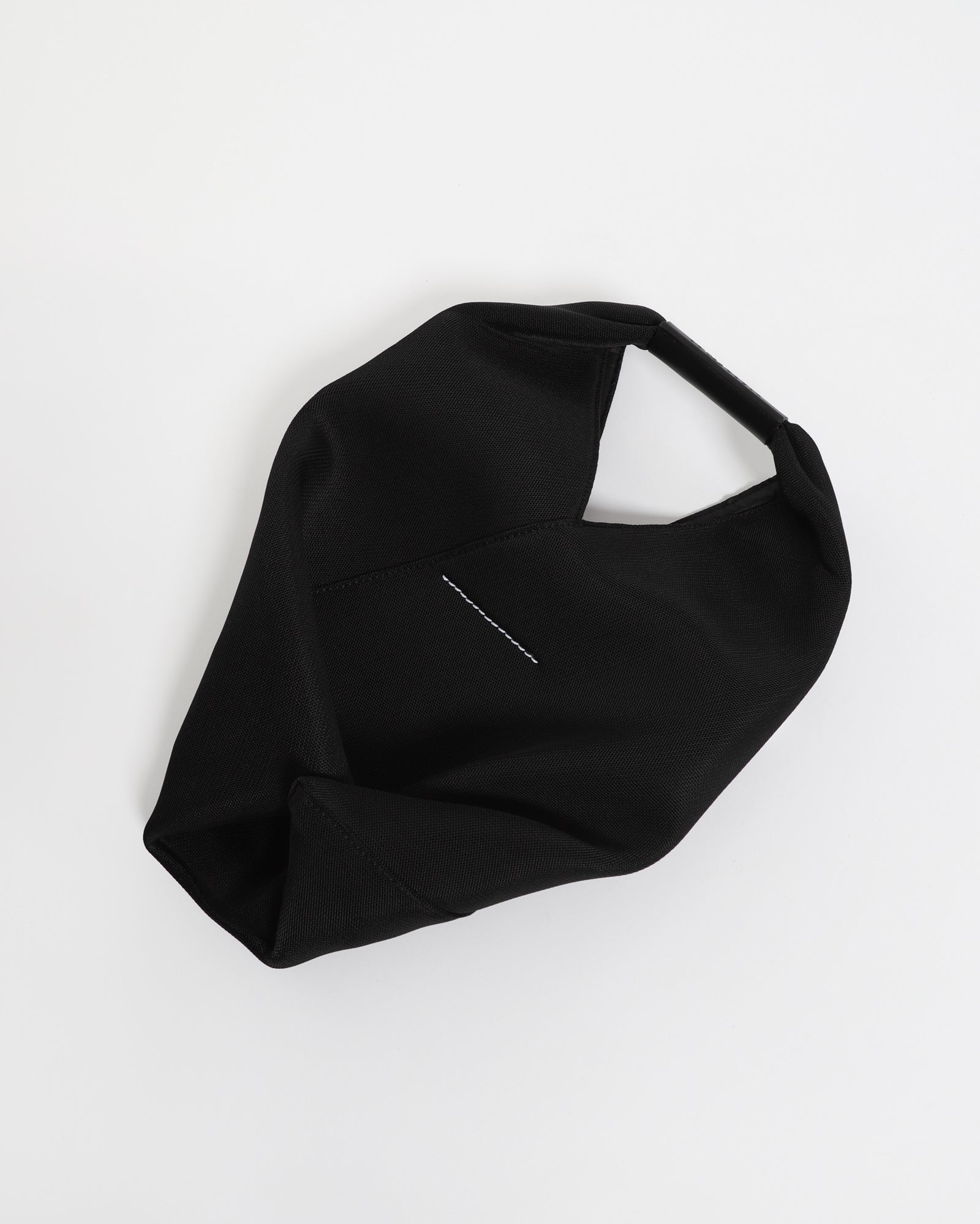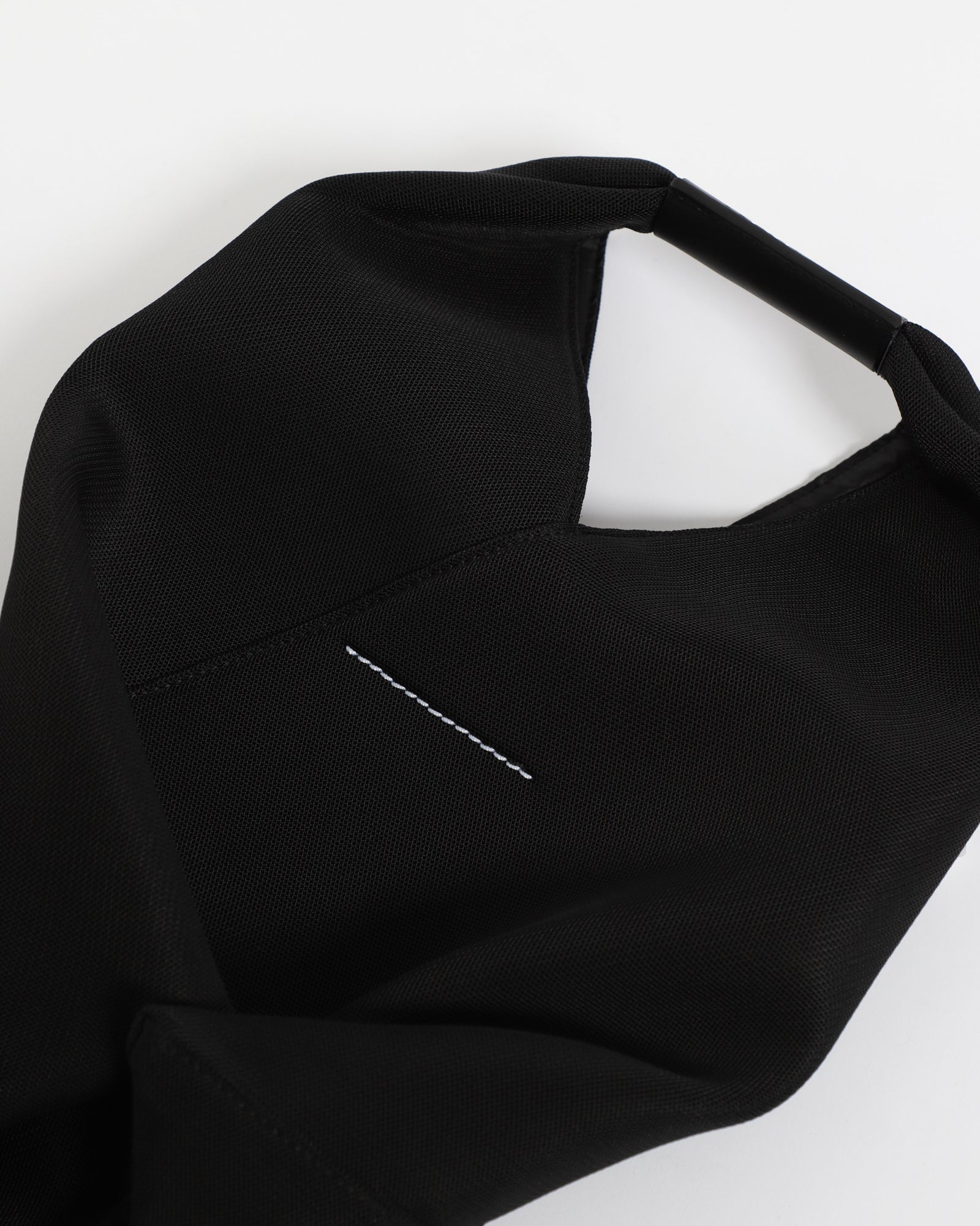 The Small Mesh Japanese Tote Bag from MM6 Maison Margiela is crafted in a net mesh fabric, it features a triangular body with a top handle. The bag is detailed with MM6’s signature straight stitch on the back, adding a subtle brand touch. Snap buttons on the edges allow you to change the bag’s shape, offering versatility in your carry.